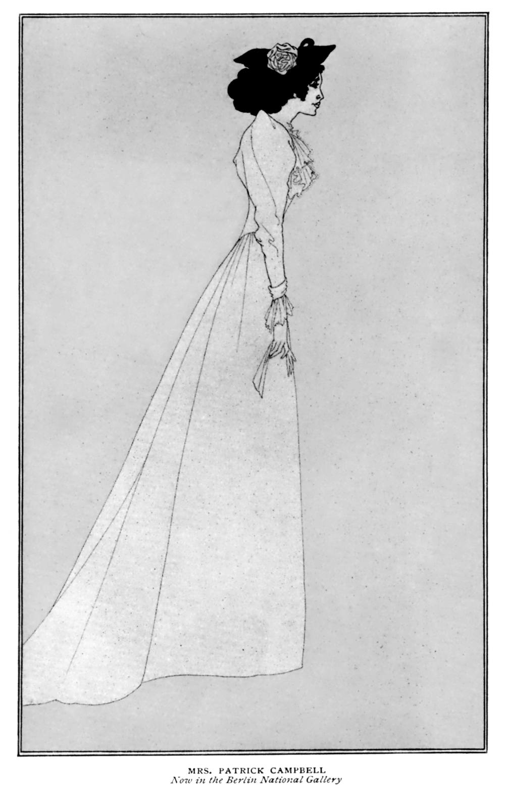 He had considerable intellectual vanity, but it never relapsed into common conceit. He was generous in recognizing the talent and genius of others, but was singularly perverse in some of his utterances. He said once that only four of his contemporaries interested him. He [29] bore with extraordinary patience the assertions of foolish persons who calmly asserted that both in America and England other artists had anticipated the peculiarities of his style and methods. I have seen the works of these Lambert Simnels and Perkin Warbecks, and they proved, one and all, crows in peacocks' feathers. Beardsley's style, nevertheless, influenced (unfortunately, I think) many excellent artists both younger and older than himself. In France his work was accepted without question: he was always gratified by the cordiality which greeted him in a country where he was more generally understood than in his own. He has illustrious precedents in Constable and Bonnington. Italy, Austria, and Germany recognized in him a master some time before his death. At Berlin his picture of Mrs Patrick Campbell, the actress, is now in a place of honour in the Museum. A portrait study of himself is in the British Museum Print Room; a few examples are at South Kensington; but all his important work is in private collections; much of it is in America and Germany. In England, putting aside the notoriety and sensation caused by his posters and the Yellow [30] Book, appreciation of his work has been confined rather to the few. He enjoyed, however, the friendship and intimacy of great numbers of people, shewing that his amiable qualities, no less than his art, received due recognition. His conversation was vehement and witty rather than humorous. He had a remarkable talent for mimicking, very rarely exercised. He loved argument, and supported theories for the sake of argument in the most convincing manner, leaving strangers with a totally wrong impression about himself, a deception to which he was much addicted. He possessed what is called an artificial manner, cultivated to an extent that might be mistaken for affectation. He never could sit still for very long, and he made use of gesture for emphasis. His peculiar gait has been very happily rendered in a portrait of him by Mr Walter Sickert; he also sat to M. Blanche, the well-known French portrait painter; the portrait by himself is tinged with caricature.