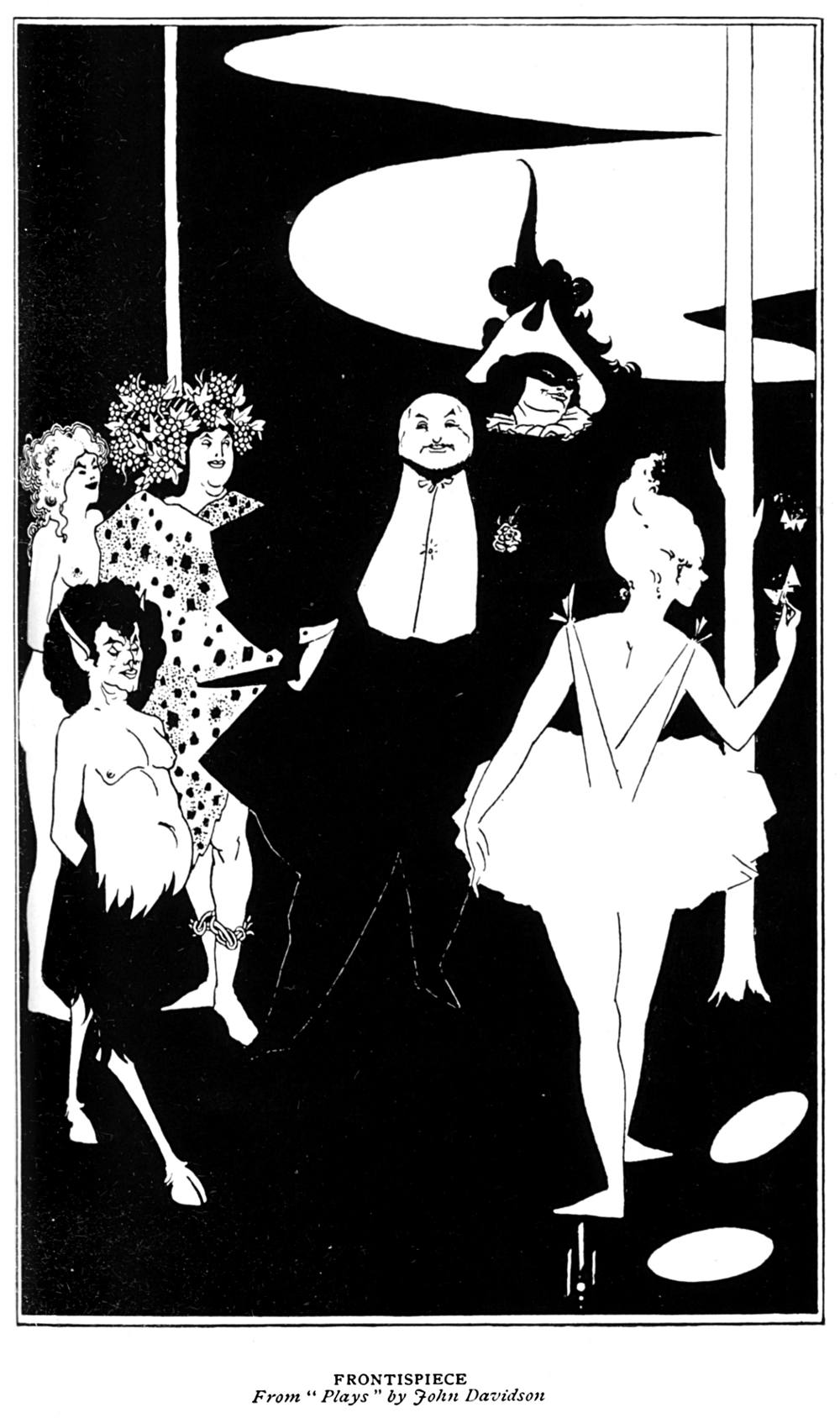 I. A burlesque Cupid on a stage with footlights, one hand holding a copy of the book, whence it [103] appears that the original intention was to produce the first number in December 1895. Reproduced in "Later Work." Latter part of 1895. (Property of John Lane, Esq.)