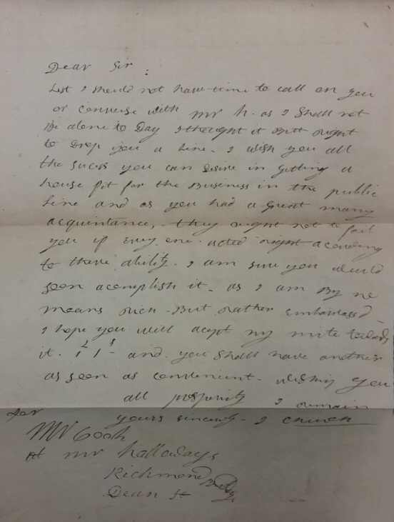 Lest I should not have time to call on you or converse with you as I shall not be alone to Day I thought it But Right to Drop you a Line I wish you all the success you can desire in p. 8getting a house fit for the Business in the public Line and as you had a great many acquaintance, they ought not to fail you if evey one acted right according to there ability I am sure you would soon accomplish it. As I am By no means Rich, But rather em barrassed I hope you will acept my mite towards it 1l. 1s. and you shall have another as convenient wishing all prosperity,