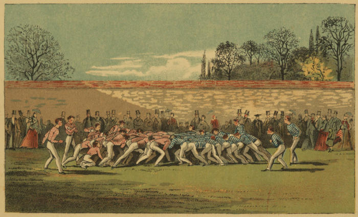 The representation of “a Hot” by Mr. Holmes gives an excellent idea of that peculiar feature of the game of football as played at Winchester at the date of which I write. The other pictures by Mr. Garland sufficiently well represent the architectural features of the College, but justice is scarcely done to the figures of the boys,[vi] who did not go through their labours and amusements in such rigid style as might be inferred from their figures and attitudes as here represented. The cuts in the Glossary would also have been more effective if the artist (not Mr. Garland) had ever seen a Winchester scholar in his peculiar costume.