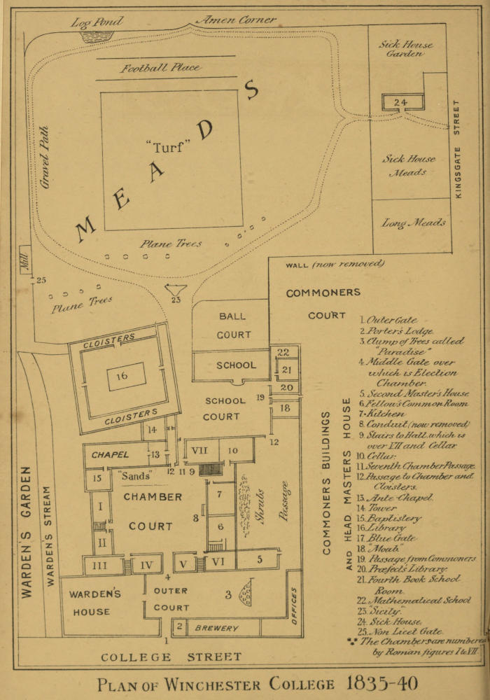 The College of St Mary of Winchester (near Winchester, as it used to be called) was, in olden times, situated outside the town, but is now bounded on its west side by the buildings of Kingsgate Street and College Street. The entrance is from the latter street through a handsome[26] portal called “outer gate,” which opens into a quadrangle, on the east side of which is the Warden’s house; passing through this court and another gateway (“middle gate,” above which is “election chamber”) we enter another spacious quadrangle, the southern side of which is formed by the chapel and hall, the western mainly by the kitchen, and the remaining two sides by the boys’ bed-chambers, (on the ground floor,) and the fellows’ and second master’s lodgings above. Underneath the hall, and close to the great hall staircase, a passage called “seventh-chamber passage” leads into a third quadrangle of smaller dimensions, called “school court,” on the south of which is the school, and on the east the outside wall of the chapel cloisters; along the entire western side of the College buildings, from College Street to the school, extend the buildings of Commoners, (the boys not on the foundation,) the communication of which with College is through a door on the west side of “school court.” A passage between the school and cloister wall leads to the playground[27] or “meads,” adjoining the west side of which, and divided from it by a red brick wall, is the “sick house,” (hospital,) situated in another piece of ground called “sick-house meads.”