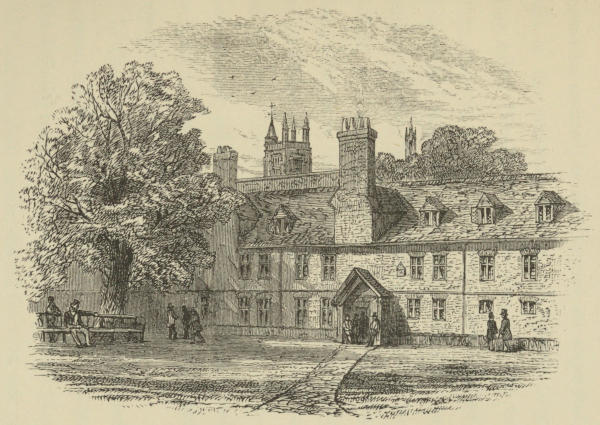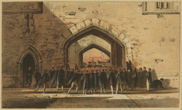 In Commoners’, the number of boys fluctuated between one hundred and one hundred and thirty. The building called “Commoners’,” in which they slept and had their meals, skirted the west side of College, and had its entrance also in College Street. It would be useless to describe the buildings of Commoners’ as they existed in my time; they were[34] not in any way remarkable, and are now entirely removed, and other and more commodious edifices, though, perhaps, not much more beautiful, built in their place.