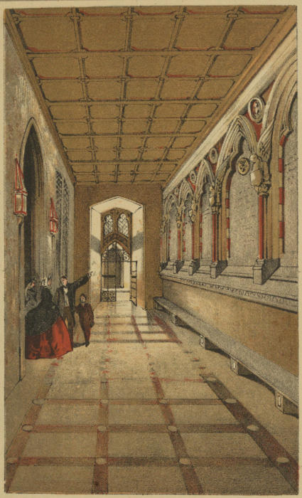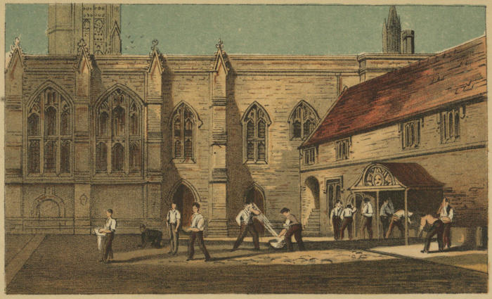 During the years 1839-1841 the picturesque Old Commoners was demolished. It was built by Dr Burton, and formed an irregular quadrangle. On the west side were the head-master’s house, an excellent ball-court, and upper and lower cloister galleries, built over a small cloister; on the north was “Wickham’s” buildings, containing the Hall of the juniors, various dormitories, and the residence of the tutors; on the south were upper and lower conduit galleries, part of the ancient “Sustern Spital,” and divided into dormitories above, and below into apartments for the matron, and three “Continent Rooms” or sick bays. On the ground-floor, to the west of the inner entrance, were the “Hatches,” from which the bread or “sines,” and cans of beer, called “jorams,” were issued; the kitchens, etc.; opening into a small court, containing a dormitory, known as “New Room.” On the other side were the prefects’ and the tutors’ studies. On the east side of Commoners’ Court was the wall of the college stables, and a range of fine elm-trees, destroyed with one exception during a violent summer-storm in 1836. Underneath the survivor was the “long bench,” so frequented in “standing-up time.” The entrance-gate stood where the west gate of modern commoners is at present. Parallel with the east side of the court, and to the southward of the tutors’ studies, was the “dining hall;” and above it was a set of sleeping-rooms, upper and lower hall galleries. On the westward of the hall was “the conduit.”—Walcott’s William of Wykeham and his Colleges.