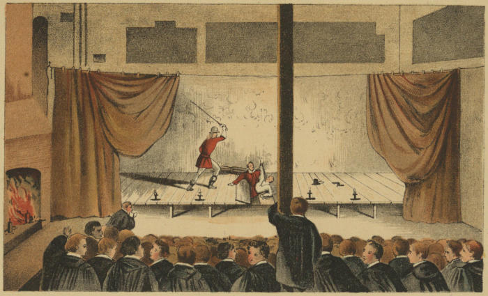 There were twelve Præfects in Commoners, who had the right of fagging all the rest except those in the class immediately below them, (called senior part the fifth,) who were exempt; when they required the services of a Fag, they did not call “Junior!” but “Here!” They also had an officer whose duties and privileges were somewhat similar to those of Senior Candlekeeper and Deputy in College; his office, however, was conferred by election among the Præfects. It was necessary that he should be in either middle or junior part the fifth, of reasonable bodily strength, and have been at least three years in commoners. This dignitary was called “the Coursekeeper;” should he be promoted into senior part the fifth, he retained the privileges of the office without its responsibilities, and was called “Ex-coursekeeper.”