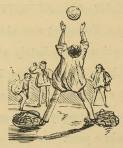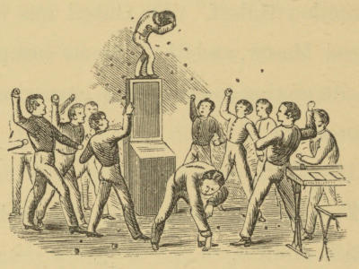 [18] The picture is somewhat incorrect. Three or four bureaus, each about eight feet six inches high, stood against the wall, and the boys in ordinary jackets and waistcoats (not in tight jackets) threw at the victim from the front.