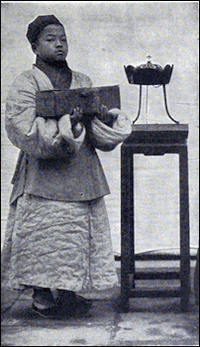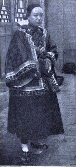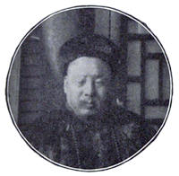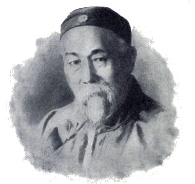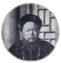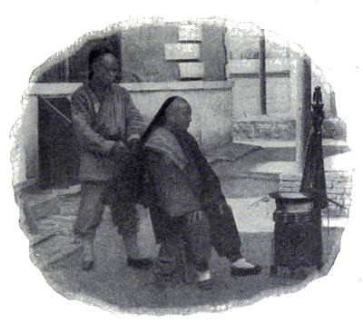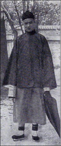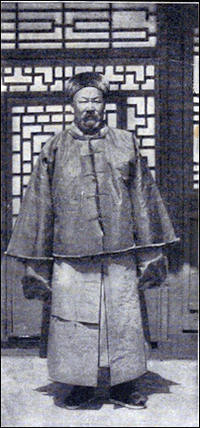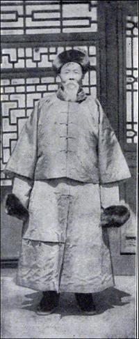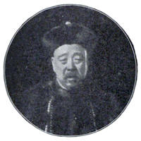 “Ch’ing,” replied Hu, and immediately there stood before us as ferocious looking a ruffian as the world could well produce. A tall, weather-beaten man, fifty years of age or more, with rather heavy (for a Chinaman) yet black mustaches, and a more than ordinarily prominent nose; dressed in a dark blue gown, satin high-top boots, official hat with premier button and peacock feather, held at right angles from the rear of his button by an expensive piece of jade. His eyes were deep-set and small, and the whole expression of his face was ferocious and cruel.