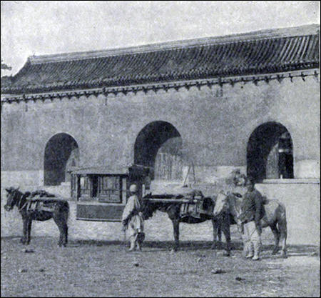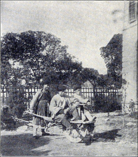 This picture shows the common method of transportation in vogue in the Chinese cities of to-day; but with the opening of China to western influences the modern electric car will doubtless supersede this conveyance, and, like many other picturesque but antiquated features of the country, it will be relegated to the past.
