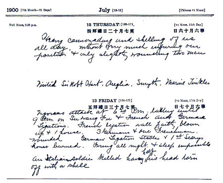 “Should the foreign ministers and their families prefer to temporarily retire to Tientsin, he must see they are protected en route [when Baron von Ketteler left the legation walls the following day to visit the tsung-li-yamen he was murdered by these ‘protection guards’]; but as the railway is not now in working, and if they go by cart-road it would be difficult to secure their safety, they would do better perhaps to abide here in peace as heretofore [we had been under fire for six days at intervals] until the railroad is repaired, and then act as they see fit. Respect this.”
