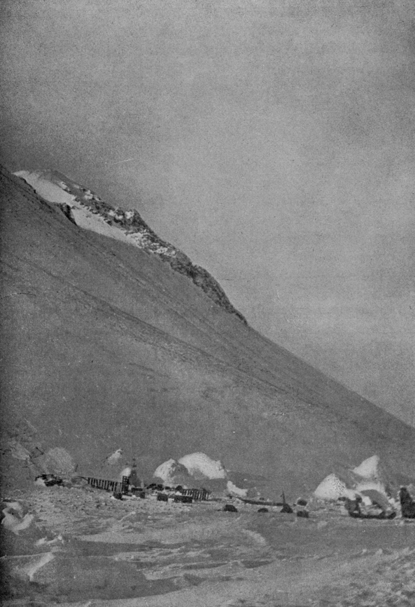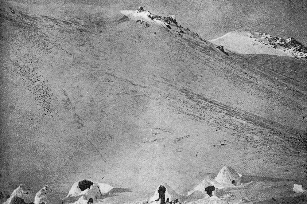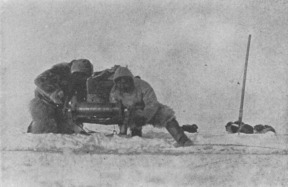The instrument box is firmly bedded in the snow, which is packed down to a firm bearing and snow is packed around the box. Then something, usually a skin, is thrown over the snow, partly to prevent any possible warmth from the sun melting the snow and shifting the bearing of the box; partly to protect the eyes of the observer from the intense reflected glare of light from the snow.