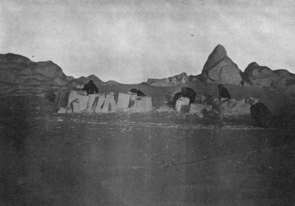 The method of taking meridian observations with a sextant and an artificial horizon on a polar sledge journey is as follows: if there is any wind, a semi-circular wind-guard of snow blocks, two tiers high, is put up, opening to the south. If there is no wind, this is not necessary.