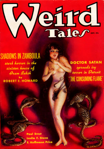 Somewhere a thin whining music struck up, mingling with the hissing of the serpents, like an evil night-wind blowing through the empty sockets of a skull. Even in the flying speed of her urgent haste she realized that the darting of the serpents was no longer at random. They obeyed the grisly piping of the eery music. They struck with a horrible rhythm, and perforce her swaying, writhing, spinning body attuned itself to their rhythm. Her frantic motions melted into the measures of a dance compared to which the most obscene tarantella of Zamora would have seemed sane and restrained. Sick with shame and terror Zabibi heard the hateful mirth of her merciless tormentor.