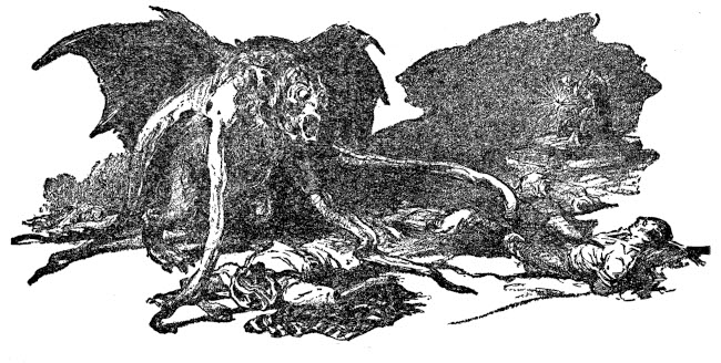 "I'll try to tell you what I glimpsed; then we'll never speak of it again. It was gigantic and black and shadowy; it was a hulking monstrosity that walked upright like a man, but it was like a toad, too, and it was winged and tentacled. I saw only its back; if I'd seen the front of it—its face—I'd have undoubtedly lost my mind. The old Arab was right; God help us, it was the monster that Xuthltan called up out of the dark blind caverns of the earth to guard the Fire of Asshurbanipal!"