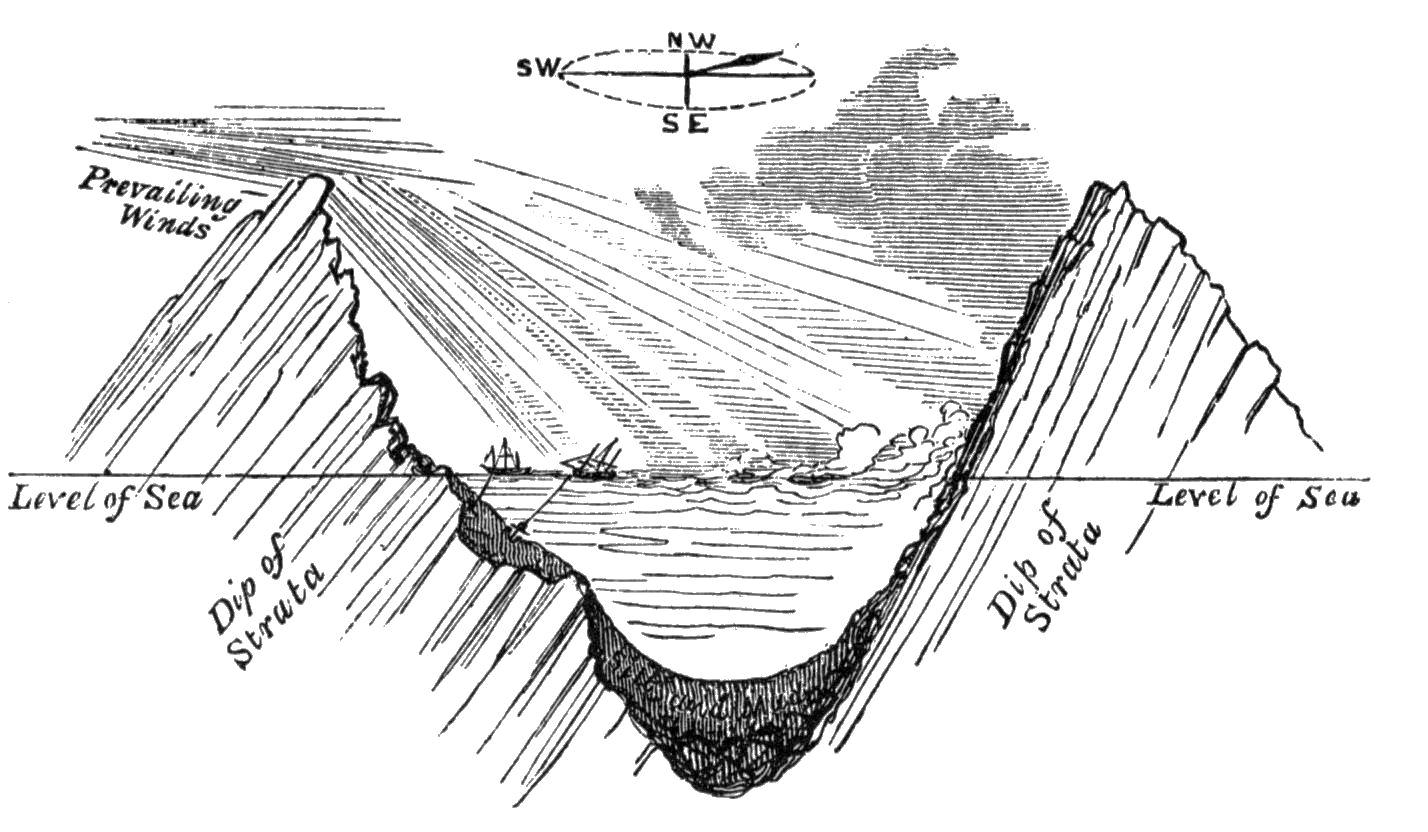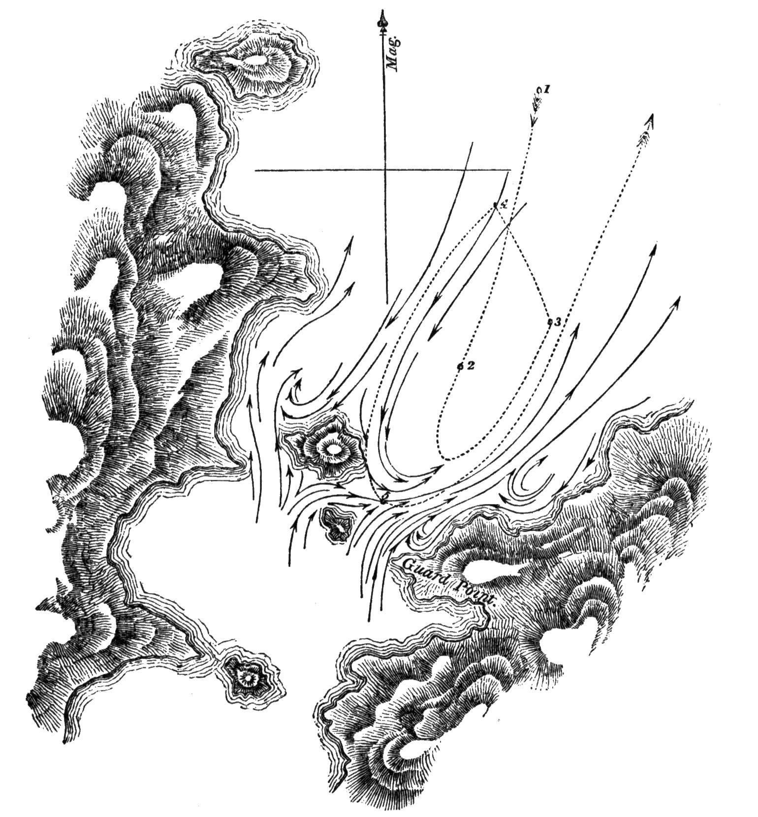 (c) While the 'current' runs eastward for many days in mid-channel, or along one shore, it often happens that the 'stream of tide' either sets in a contrary direction, along each side of the Strait, or that it follows only the shore opposite to that washed by the 'current.'—R. F.
