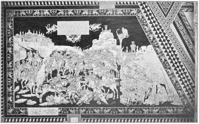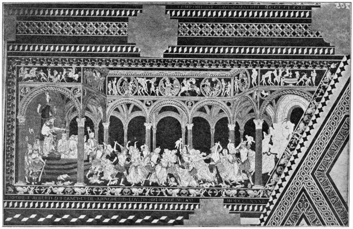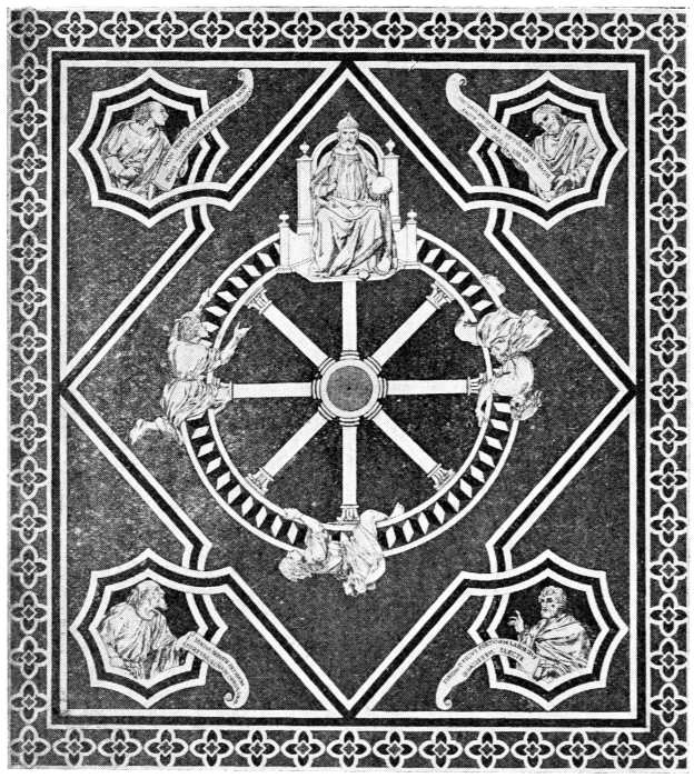 The first impression that this book may give, is that I have put the cart before the horse, and that, instead of dwelling on the Pavement Masters, I have laid too much stress on the Pavement itself, and too little on the makers of it. A careful perusal, however, will, I hope, prove that I have been right in my reasoning. I have felt strongly, that in order to form a fair idea of these Masters, many,—I may say, most,—of whose names are entirely unknown to the general English reader, it was necessary to give as clear and vivid a picture as was possible, of this, their greatest work, through which their names live. Most people, who have ever heard of Siena, have heard of its Cathedral Pavement:—an unique and historical piece of work:—but how many have heard of even such great artists as Pietro del Minella and Antonio Federighi? On this account, it seems to me that the case needed treatment such as I have given it. I have, therefore, composed a full and, as far as I could make it, a clear account of the chain which connects these men together, and then added short notices of each, giving all the important facts obtainable about them. For this purpose, I havevi examined all the recognized authorities, and tried to introduce any side-lights that may brighten up a somewhat dull record of facts. I have avoided venturing on criticism: partly because I felt myself unequal to the task; and partly because my space was too limited to allow of such digressions without a sacrifice of more important matter. Where I have put forward a theoretical suggestion, I have carefully pointed out that it is only offered as such. I regret that it is impossible to translate all the documents quoted, chiefly because the quaint language in which they are written is untranslatable, and would lose most of its charm if rendered into modern English. On the other hand, I have, where a passage specially important to my argument occurs in a document, given its general meaning in the text. I have added a long list of authorities, and works connected with the Cathedral and its Pavement which have been consulted, and I have to thank cordially, for practical and artistic help, and advice throughout, three ladies: the Hon. Mrs. A. L. Pelham, Mrs. J. P. Richter, and Mrs. Trail.