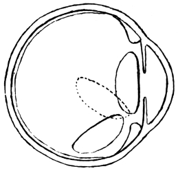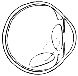 There remain a few points of interest which deserve mention. Though in the great majority of couched eyes the cataract lies in the lowest part of the globe, it may be found either to the inner or to the outer side, or even in the upper half of the eye. Sometimes it flaps backward and forward with the movements of the globe, swinging on a hinge, which evidently consists of the remaining fibres of the suspensory ligament, and which may be situate in any possible direction, though most often it lies below. It will be readily understood that if this hinge is situate below, or to the inner or outer sides, the lens will flap away from the pupil downward, or to the hinged side, as the case may be. It is not inconceivable that, in repeatedly doing so, it may inflict some measure of injury on the neighbouring part of the ciliary body and retina, and may thus excite a local inflammation which will tend in time to tie the cataract permanently in the new position towards which it flaps, away from the pupil. In the event of the hinge being in81 one of the three directions now under discussion, the cataract will tend to fall forward on to the pupil only when the patient stoops forward, so as to bring his face into the horizontal plane. When the hinge is situate above, the latter is one of the few positions of the face in which the pupil clears itself in ordinary cases; but one meets with instances in which, despite the hinge being above, the pupil remains clear except when the face is horizontal, the lens lying most of the time in the upper segment of the eye. There is another factor, and probably a more frequent one, than that of the local injury inflicted by the lens during its movement, which tends to tether it in situ. This is the increasing consistence of the vitreous, due to the deposit within it of inflammatory matter, a point which has already been alluded to.
