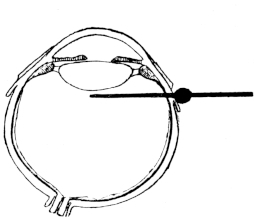 Fig. 2.—To illustrate the method of introducing the needle in Bartisch’s operation (Albertotti). The cataract is in situ in the right eye, and couched in the left eye.