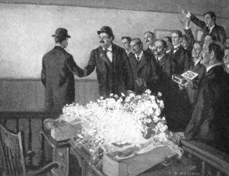 Among those who made the trip with us there were Slocum and his wife, of course, John Carmichael, young Jenks and his pretty little wife, and a dozen or more other friends. We had a very pleasant and successful journey. A good deal of merriment was occasioned by a string of pearls that young Mrs. Jenks wore, which had lately been the talk of the city. The stones were of unusual size and quality, and had been purchased through a London dealer from some titled person. Jenks had[Pg 348] given them as a present to his wife because of the success of the beef merger, which had more than doubled the fortune old Randolph Jenks left him when he died. The pearls, being so perfect and well known in London, caused a lot of newspaper talk. They were said to be the finest string in the United States; there were articles even in the magazines about Mrs. Jenks and her string of pearls. Finally, some reporter started the story that there was a stone for every million dollars Jenks had "screwed out of the public by the merger"—twenty-seven in all. (For these days there was beginning to be heard all over the clamor about the price of food, and how the new combination of packers was forcing up prices—mere guesswork on the part of cheap socialistic agitators that was being taken seriously by people who ought to know better.) One paper even had it that pretty little Mrs. Jenks "flaunted around her neck the blood-bought price of a million lives!"