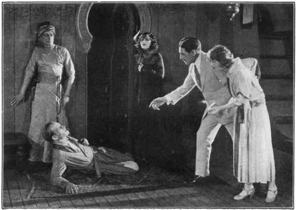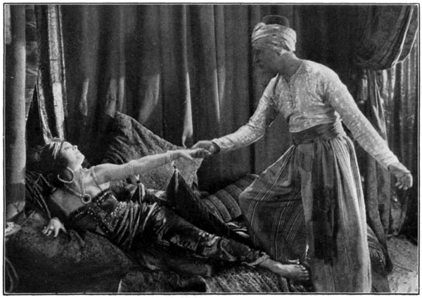 On the divan, dressed in native costume, with the turban and djelab, Baroudi was sitting on his haunches with his legs tucked under him, smoking hashish and gazing at the gilded ball as it rose and fell on the water. A little way off, supported by many cushions, an Eastern girl was lying. She looked very young, perhaps sixteen or seventeen. But her face was painted, her eyes were bordered with kohl, and the nails of her fingers and of her bare toes were tinted with the henna. She wore the shintiyan, and a tob, or kind of shirt of coloured and spangled gauze. On her pale brown arms there were quantities of narrow bracelets. She, too, was smoking a little pipe with a mouthpiece of coral.