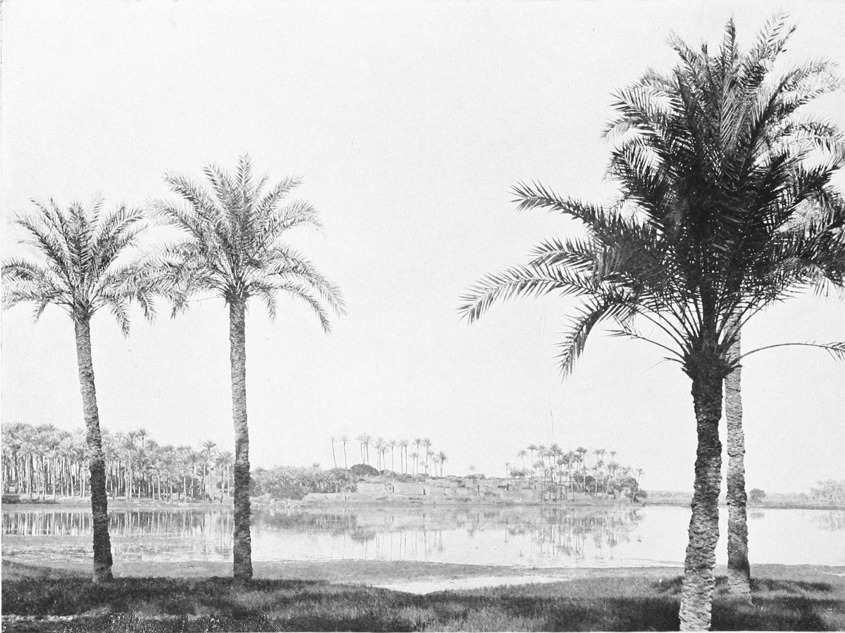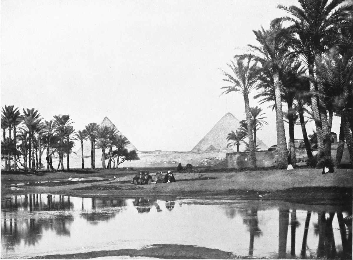 It was the first week of November, high Nile had not subsided, and all the land here, between the river and the sand where the Sphinx keeps watch, was hidden{10} beneath the vast and tranquil waters of what seemed a tideless sea—a sea fringed with dense masses of date-palms, girdled in the far distance by palm-trees that looked almost black, broken by low and tiny islands on which palm-trees kept the white and the brown houses in their feathery embrace. Above these isolated houses pigeons circled. In the distance the lateen sails of boats glided, sometimes behind the palms, coming into view, vanishing, mysteriously reappearing among their narrow trunks. Here and there a living thing moved slowly, wading homeward through this sea: a camel from the sands of Ghizeh, a buffalo, two donkeys, followed by boys who held with brown hands their dark blue skirts near their faces, a Bedouin leaning forward upon the neck of his quickly stepping horse. At one moment I seemed to look upon the lagoons of Venice, a watery vision full of a glassy calm. Then the palm-trees in the water, and growing to its edge, the pale sands that, far as the eyes could see, from Ghizeh to Sakkara and beyond, fringed it toward the west, made me think of the Pacific, of palmy islands of a paradise where men grow drowsy in well-being, and dream away the years. And then I looked still farther, beyond the pallid line of the sands, and I saw a Pyramid of gold, the wonder Khufu had built. As a golden wonder it saluted me after all my years of absence. Later I was to see it gray as gray sands, sulphur color in the afternoon from very near at hand,{11}