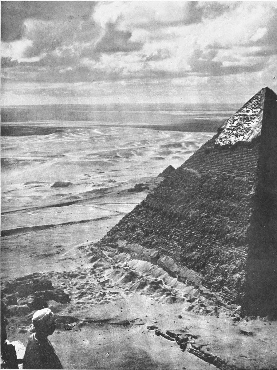 And as the wonder of the Sphinx takes possession of you gradually, so gradually do you learn to feel the majesty of the Pyramids of Ghizeh. Unlike the Step Pyramid of Sakkara, which, even when one is near it, looks like a small mountain, part of the land on which it rests; the Pyramids of Ghizeh look what they are—artificial excrescences, invented and carried out by man, expressions of man’s greatness. Exquisite as they are as features of the drowsy golden landscape at the setting of the sun, I think they look most wonderful at night, when they are black beneath the stars. On many nights I have sat in the sand at a distance and looked at them, and always, and increasingly, they have stirred my imagination. Their profound calm, their classical simplicity, are greatly emphasized when no detail can be seen, when they are but black shapes towering to the stars. They seem to aspire then like prayers prayed by one who has said, “God does not need my prayers, but I need them.” In their simplicity they suggest a crowd of thoughts, and of desires. Guy de Maupassant{24} has said that of all the arts architecture is perhaps the most esthetic, the most mysterious, and the most nourished by ideas. How true this is you feel as you look at the Great Pyramid by night. It seems to breathe out mystery. The immense base recalls to you the labyrinth within; the long descent from the tiny slit that gives you entrance, your uncertain steps in its hot, eternal night, your falls on the ice-like surfaces of its polished blocks of stone, the crushing weight that seemed to lie on your heart as you stole uncertainly on, summoned almost as by the desert; your sensation of being forever imprisoned, taken and hidden by a monster from Egypt’s wonderful light, as you stood in the central chamber, and realized the stone ocean into whose depths, like some intrepid diver, you had dared deliberately to come. And then your eyes travel up the slowly shrinking walls till they reach the dark point which is the top. There you stood with Abou, who spends half his life on the highest stone, hostages of the sun, bathed in light and air that perhaps came to you from the Gold Coast. And you saw men and camels like flies, and Cairo like a gray blur, and the Mokattam hills almost as a higher ridge of the sands. The mosque of Mohammed Ali was like a cup turned over. Far below slept the dead in that graveyard of the Sphinx, with its pale stones, its sand, its palm, its “Sycamores of the South,” once worshiped and regarded as Hathor’s living body. And beyond them on one side{25}
