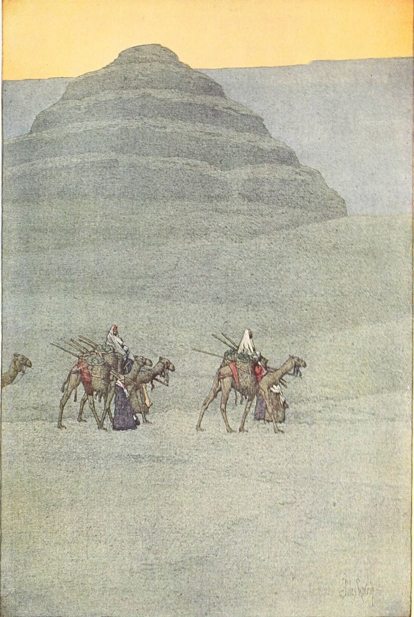 their dead in the desert cemeteries as I passed by to visit the dead in the tombs far off on the horizon. Women, swathed in black, gathered in groups and jumped monotonously up and down, to the accompaniment of stained hands clapping, and strange and weary songs. Tiny children blew furiously into tin trumpets, emitting sounds that were terribly European. Men strode seriously by, or stood in knots among the graves, talking vivaciously of the things of this life. As the sun rose higher in the heavens, this visit to the dead became a carnival of the living. Laughter and shrill cries of merriment betokened the resignation of the mourners. The sand-dunes were black with running figures, racing, leaping, chasing one another, rolling over and over in the warm and golden grains. Some sat among the graves and ate. Some sang. Some danced. I saw no one praying, after the sun was up. The Great Pyramid of Ghizeh was transformed in this morning hour, and gleamed like a marble mountain, or like the hill covered with salt at El-Outaya, in Algeria. As we went on it sank down into the sands, until at last I could see only a small section with its top, which looked almost as pointed as a gigantic needle. Abou was there on the hot stones in the golden eye of the sun—Abou who lives to respect his Pyramid, and to serve Turkish coffee to those who are determined enough to climb it. Before me the Step Pyramid rose, brown almost as bronze, out of the{32} sands here desolate and pallid. Soon I was in the house of Marriette, between the little sphinxes.
