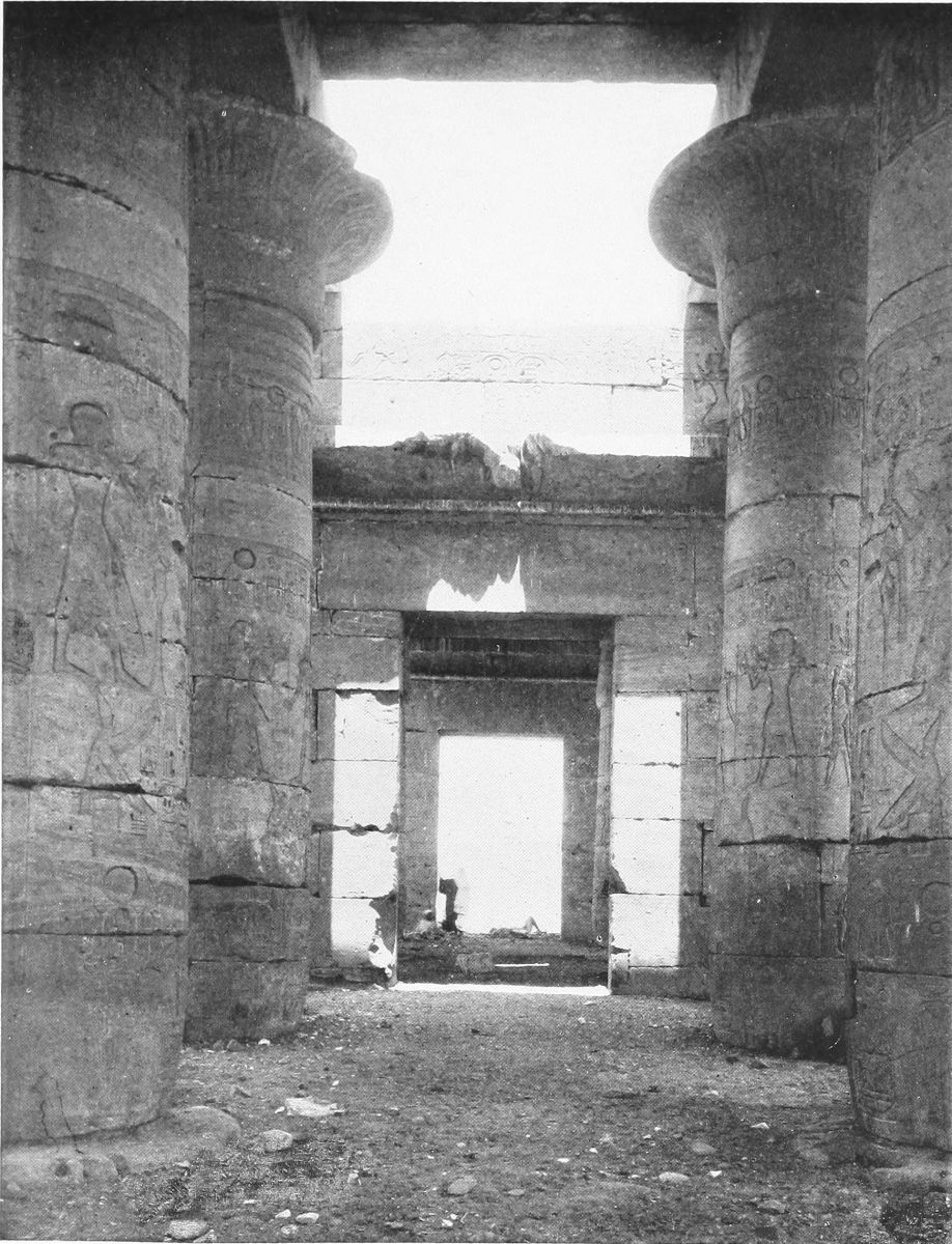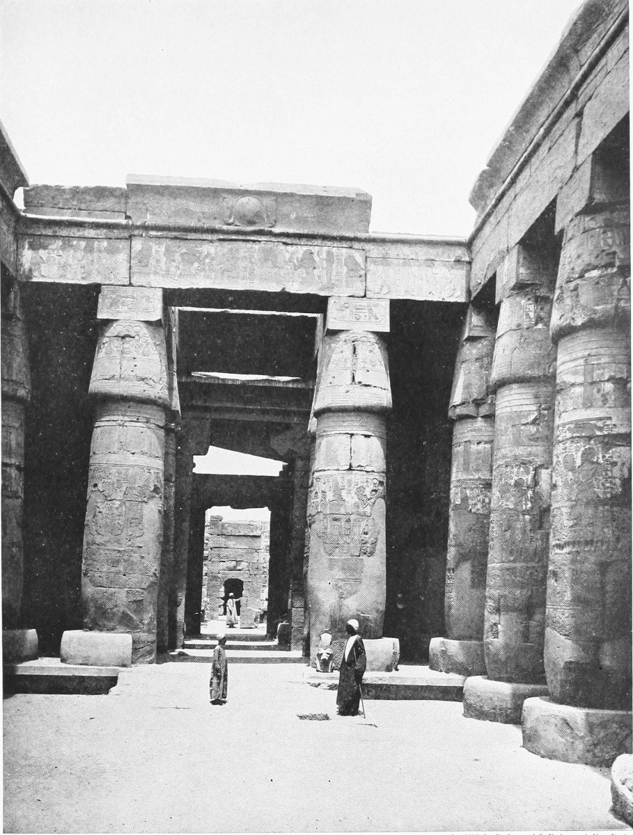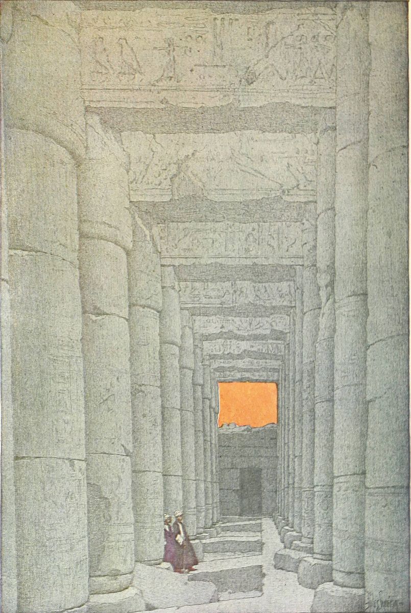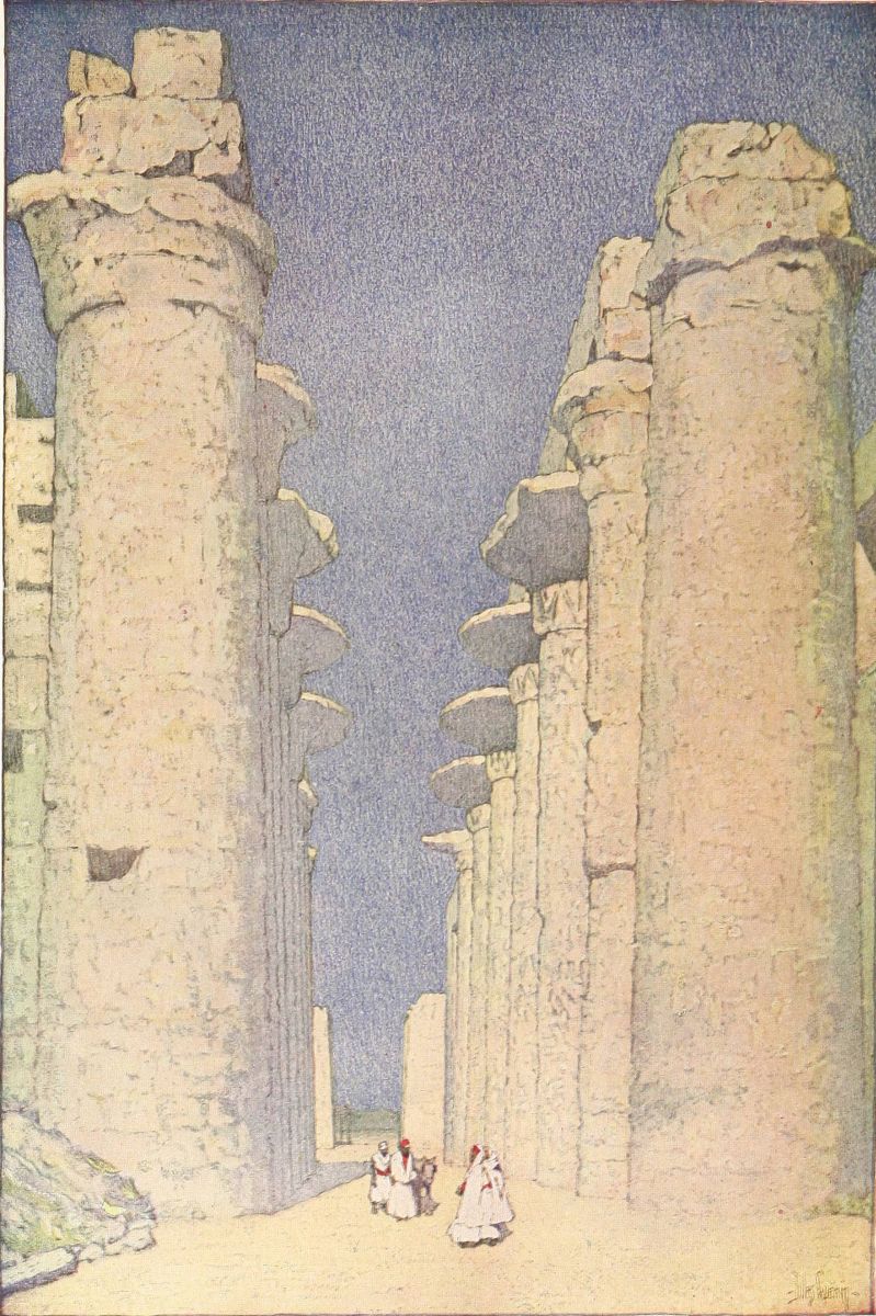 or bend down to the hot ground to listen if perchance one might hear the dead themselves murmuring over the chapters of Beatification far down in their hidden tombs, there was a lightness, a gentle gaiety of life, as in the tomb of Thi. The effect of solidity was immense. These columns bulged, almost like great fruits swollen out by their heady strength of blood. They towered up in crowds. The heavy roof, broken in places most mercifully to show squares and oblongs of that perfect, calling blue, was like a frowning brow. And yet I was with grace, with gentleness, with lightness, because in the place of the dead I was again with the happy, living walls. Above me, on the roof, there was a gleam of palest blue, like the blue I have sometimes seen at morning on the Ionian sea just where it meets the shore. The double rows of gigantic columns stretched away, tall almost as forest trees, to right of me and to left, and were shut in by massive walls, strong as the walls of a fortress. And on these columns, and on these walls, dead painters and gravers had breathed the sweet breath of life. Here in the sun, for me alone, as it seemed, a population followed their occupations. Men walked, and kneeled, and stood, some white and clothed, some nude, some red as the red man’s child that leaped beyond the sea. And here was the lotus-flower held in reverent hands, not the rose-lotus, but the blossom that typified the rising again of the sun, and that, worn as an amulet, signified{42} the gift of eternal youth. And here was hawk-faced Horus, and here a priest offering sacrifice to a god, belief in whom has long since passed away. A king revealed himself to me, adoring Ptah, “Father of the beginnings,” who established upon earth, my figures thought, the everlasting justice, and again at the knees of Amen burning incense in his honor. Isis and Osiris stood together, and sacrifice was made before their sacred bark. And Seti worshiped them, and Seshta, goddess of learning, wrote in the book of eternity the name of the king.