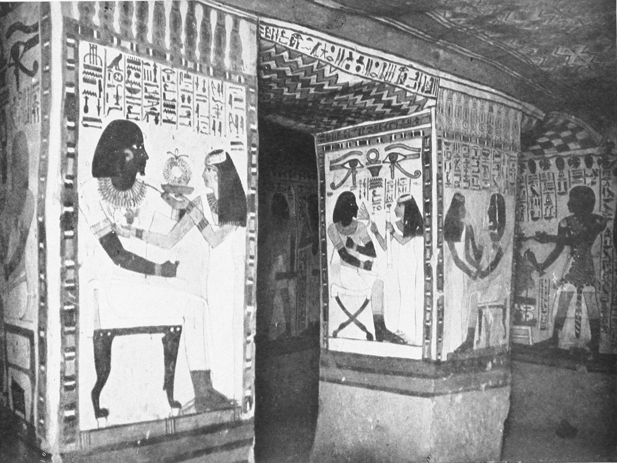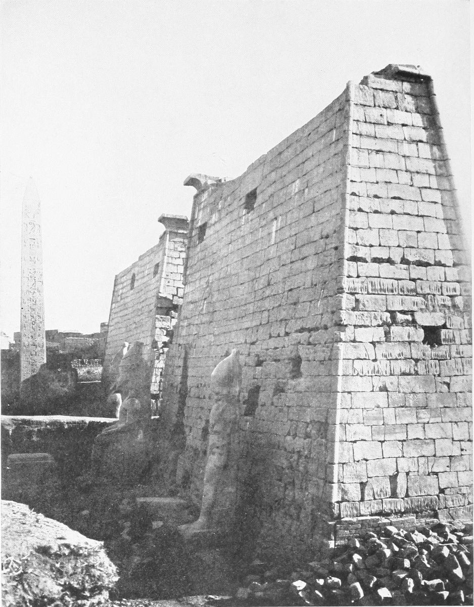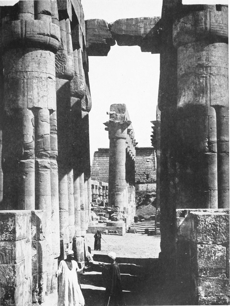 or bend down to the hot ground to listen if perchance one might hear the dead themselves murmuring over the chapters of Beatification far down in their hidden tombs, there was a lightness, a gentle gaiety of life, as in the tomb of Thi. The effect of solidity was immense. These columns bulged, almost like great fruits swollen out by their heady strength of blood. They towered up in crowds. The heavy roof, broken in places most mercifully to show squares and oblongs of that perfect, calling blue, was like a frowning brow. And yet I was with grace, with gentleness, with lightness, because in the place of the dead I was again with the happy, living walls. Above me, on the roof, there was a gleam of palest blue, like the blue I have sometimes seen at morning on the Ionian sea just where it meets the shore. The double rows of gigantic columns stretched away, tall almost as forest trees, to right of me and to left, and were shut in by massive walls, strong as the walls of a fortress. And on these columns, and on these walls, dead painters and gravers had breathed the sweet breath of life. Here in the sun, for me alone, as it seemed, a population followed their occupations. Men walked, and kneeled, and stood, some white and clothed, some nude, some red as the red man’s child that leaped beyond the sea. And here was the lotus-flower held in reverent hands, not the rose-lotus, but the blossom that typified the rising again of the sun, and that, worn as an amulet, signified{42} the gift of eternal youth. And here was hawk-faced Horus, and here a priest offering sacrifice to a god, belief in whom has long since passed away. A king revealed himself to me, adoring Ptah, “Father of the beginnings,” who established upon earth, my figures thought, the everlasting justice, and again at the knees of Amen burning incense in his honor. Isis and Osiris stood together, and sacrifice was made before their sacred bark. And Seti worshiped them, and Seshta, goddess of learning, wrote in the book of eternity the name of the king.