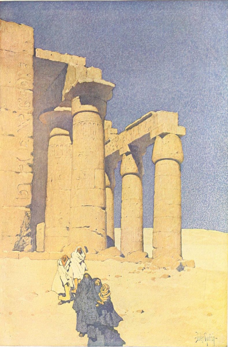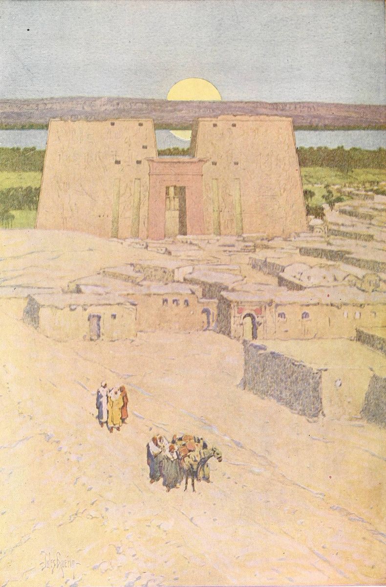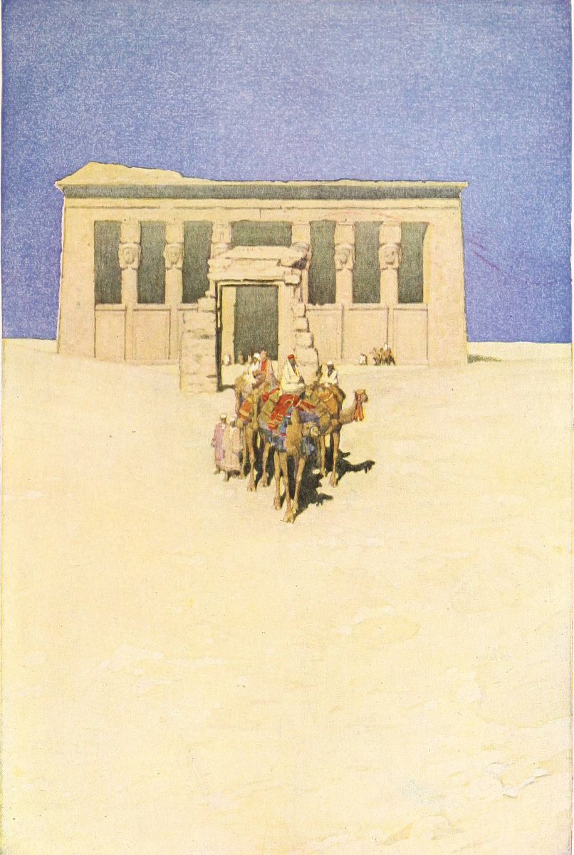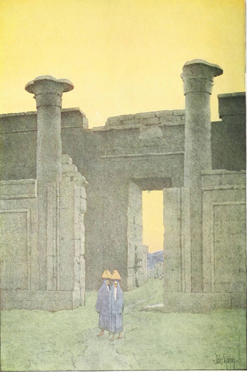 FROM Abydos, home of the cult of Osiris, judge of the dead, I came to Denderah, the great temple of the “Lady of the Underworld,” as the goddess Hathor was sometimes called, though she was usually worshiped as the Egyptian Aphrodite, goddess of joy, goddess of love and loveliness. It was early morning when I went ashore. The sun was above the eastern hills, and a boy, clad in a rope of plaited grass, sent me half shyly the greeting, “May your day be happy!”