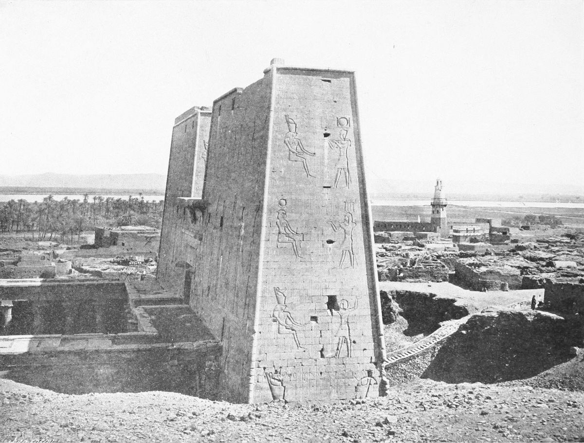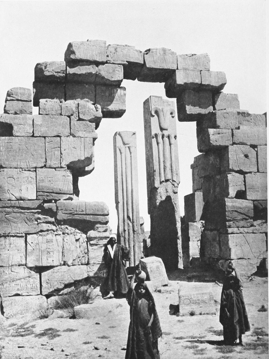 Youth is, perhaps, the most divine of all the gifts of the gods, as those who wore the lotus-blossom amulet believed thousands of years ago, and Denderah, appropriately, is a very young Egyptian temple, probably, indeed, the youngest of all the temples on the Nile. Its youthfulness—it is only about two thousand years of age—identifies it happily with the happiness and beauty of its presiding deity, and as I rode toward it on the canal-bank in the young freshness of the morning, I thought of the goddess Safekh and of the sacred Persea-tree. When Safekh inscribed upon a leaf of{53}