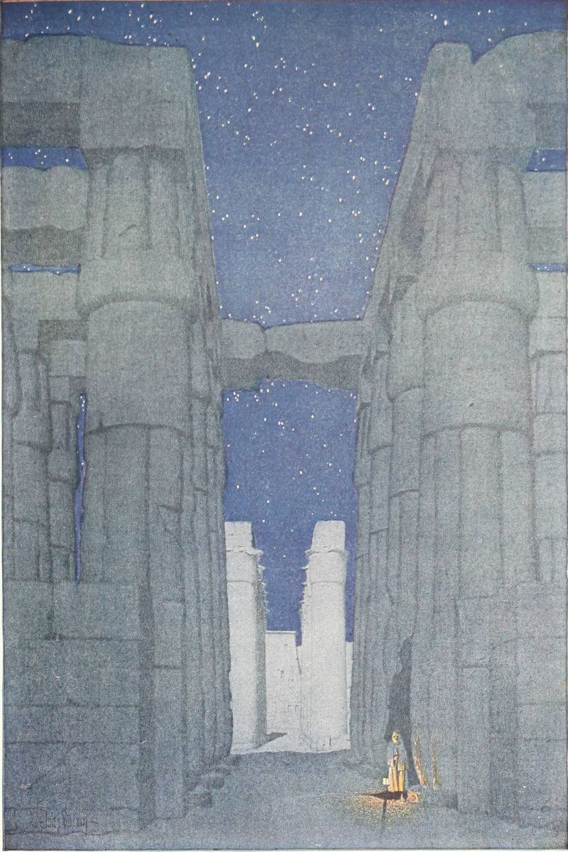 temple of Isis, where the capricious graces of form are linked with the capricious graces of color, where, like old and delicious music in the golden strings of a harp, dwells a something—what is it? A murmur, or a perfume, or a breathing?—of old and vanished years when forsakened gods were worshiped. And one can forget in the chapel of Hathor, on whose wall little Horus is born, and in the gray hounds’ chapel beside it. One can forget, for one walks in beauty.