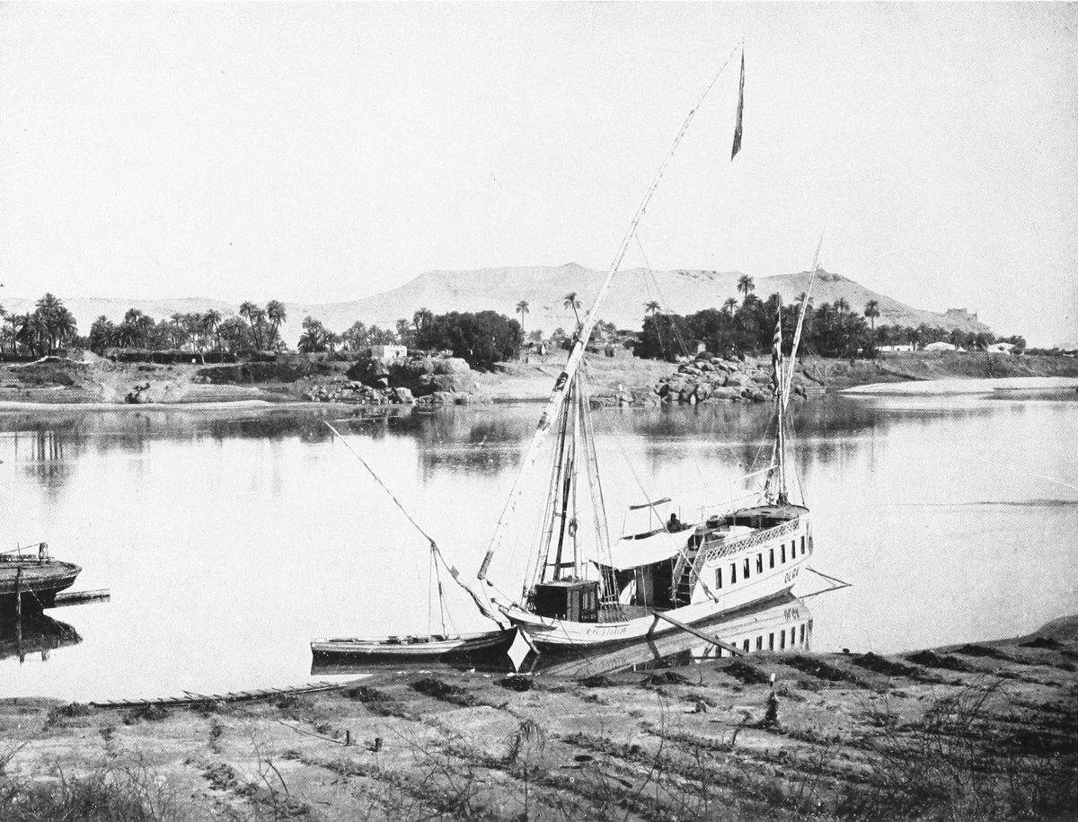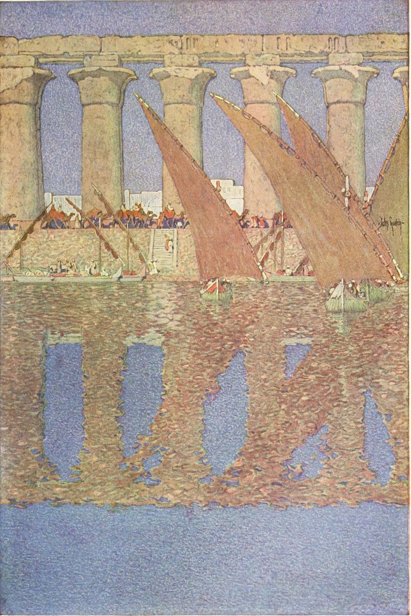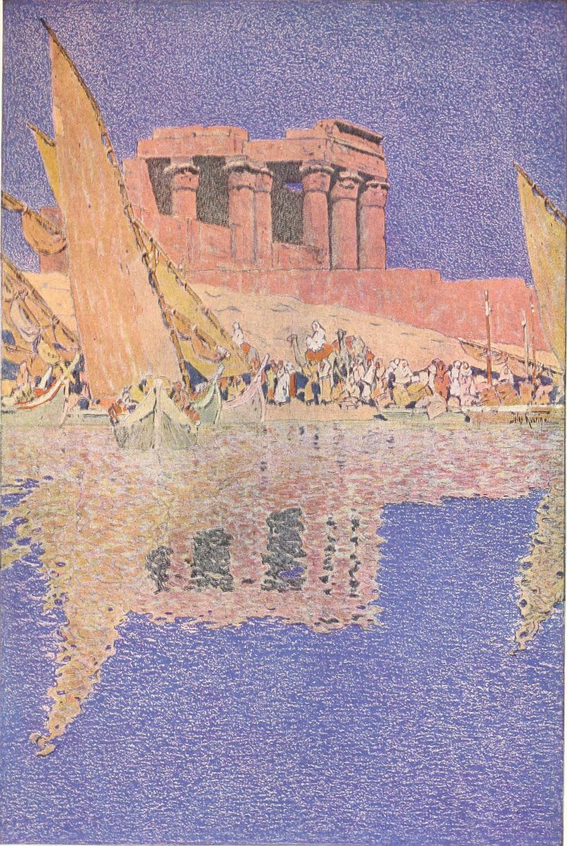 And one drifts, too; one can but drift, happily, sleepily, forgetting every care. From Abydos to Denderah one drifts, and from Denderah to Karnak, to Luxor, to all the marvels on the western shore; and on to Edfu, to Kom Ombos, to Assuan, and perhaps even into Nubia, to Abu-Simbel and to Wadi-Halfa. Life on the Nile is a long dream, golden and sweet as honey of Hymettus. For I let the “divine serpent,” who at Philæ may be seen issuing from her charmed cavern, take me very quietly to see the abodes of the dead, the halls of the vanished, upon her green and sterile shores. I know nothing of the bustling, shrieking steamer that defies her, churning into angry waves her waters for the edification of those who would “do” Egypt and be gone before they know her.