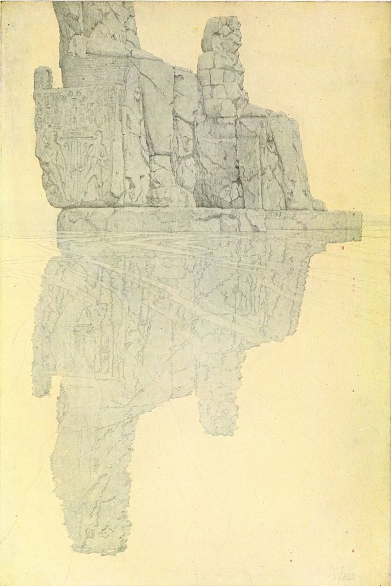 I was glad to be alone there. The guardian left me in perfect peace. I happily forgot him. I sat down in the shadow of a column upon its mighty projecting base. The sky was blinding blue. Great bees hummed, like bourdons, through the silence, deepening the almost heavy calm. These columns, architraves, doorways, how mighty, how grandly strong they were! And yet soon I began to be aware that even here, where surely one should read only the Book of the Dead,{39}