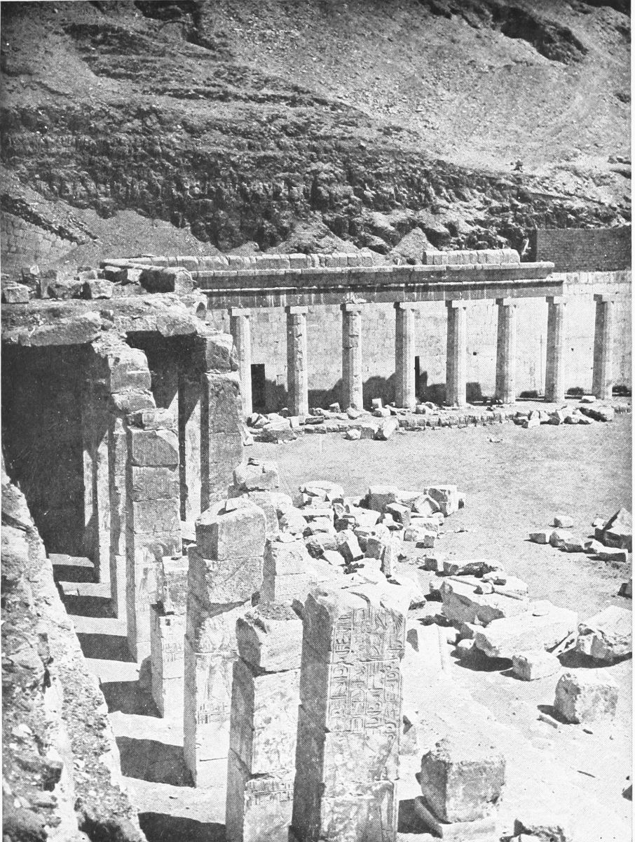 THROUGH a long and golden noontide, and on into an afternoon whose opulence of warmth and light it seemed could never wane, I sat alone, or wandered gently quite alone, in the Temple of Seti I at Abydos. Here again I was in a place of the dead. In Egypt one ever seeks the dead in the sunshine, black vaults in the land of the gold. But here in Abydos I was companioned by whiteness. The general effect of Seti’s mighty temple is that it is a white temple when seen in full sunshine and beneath a sky of blinding blue. In an arid place it stands, just beyond an Egyptian village that is a maze of dust, of children, of animals, and flies. The last blind houses of the village, brown as brown paper, confront it on a mound, and as I came toward it a girl-child swathed in purple, with ear-rings, and a twist of orange handkerchief above her eyes, full of cloud and fire, leaned from a roof, sinuously as a young snake, to watch me. On each side, descending, were white, ruined walls, stretched out like defaced white arms of the temple to receive me. I stood still for a moment and looked at{38} the narrow, severely simple doorway, at the twelve broken columns advanced on either side, white and grayish white with their right angles, their once painted figures now almost wholly colorless.