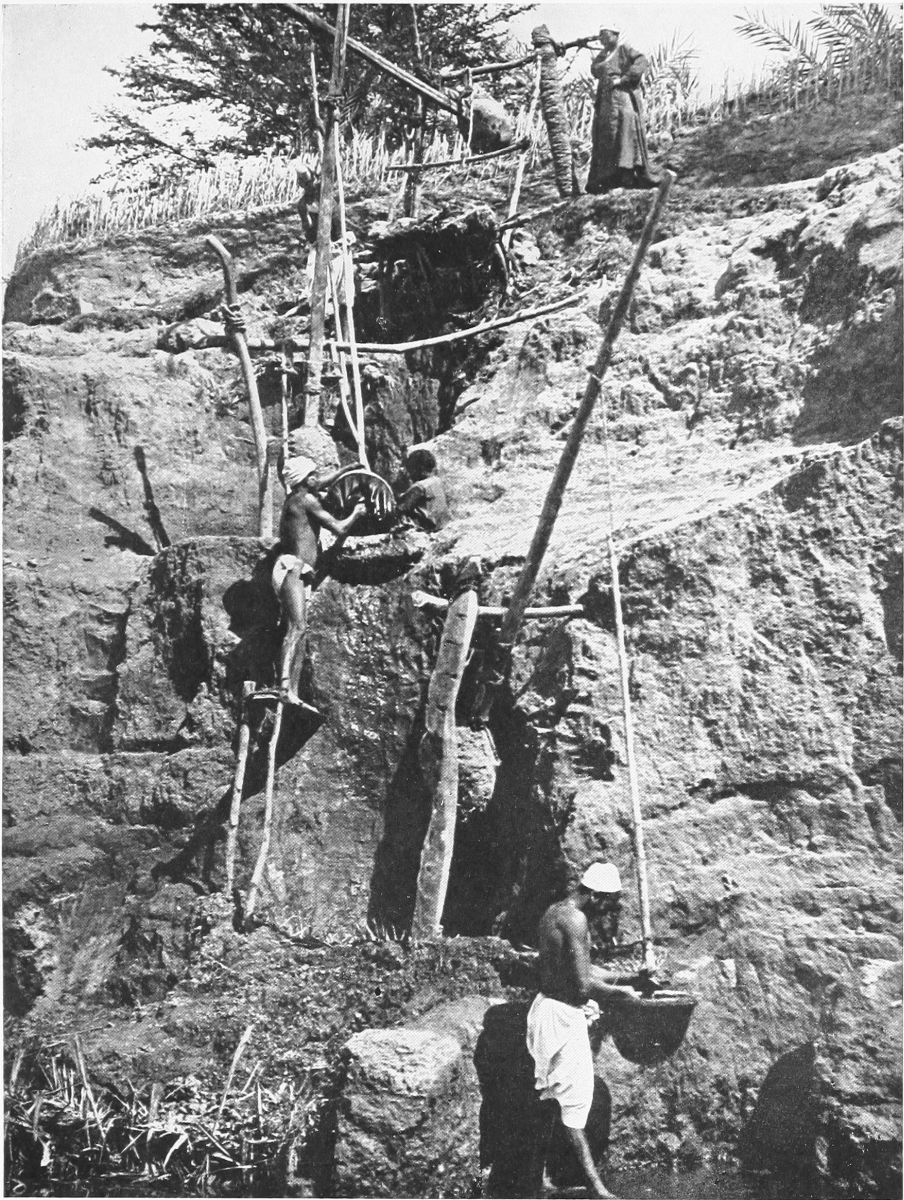 The dahabiyeh—her very name, the Loulia, has a gentle, seductive, cooing sound—drifts broadside to the current with furled sails, or glides smoothly on before an amiable north wind with sails unfurled. Upon the bloomy banks, rich brown in color, the brown men stoop, and straighten themselves, and stoop again, and sing. The sun gleams on their copper skins, which look polished and metallic. Crouched in his net behind the drowsy oxen, the little boy circles the live-long day with the sakieh. And the sakieh raises its wailing, wayward voice and sings to the shadoof; and the shadoof sings to the sakieh; and the lifted water falls and flows away into the green wilderness of doura{50} that, like a miniature forest, spreads on every hand to the low mountains, which do not perturb the spirit, as do the iron mountains of Algeria. And always the sun is shining, and the body is drinking in its warmth, and the soul is drinking in its gold. And always the ears are full of warm and drowsy and monotonous music. And always the eyes see the lines of brown bodies, on the brown river-banks above the brown waters, bending, straightening, bending, straightening, with an exquisitely precise monotony. And always the Loulia seems to be drifting, so quietly she slips up, or down, the level waterway.