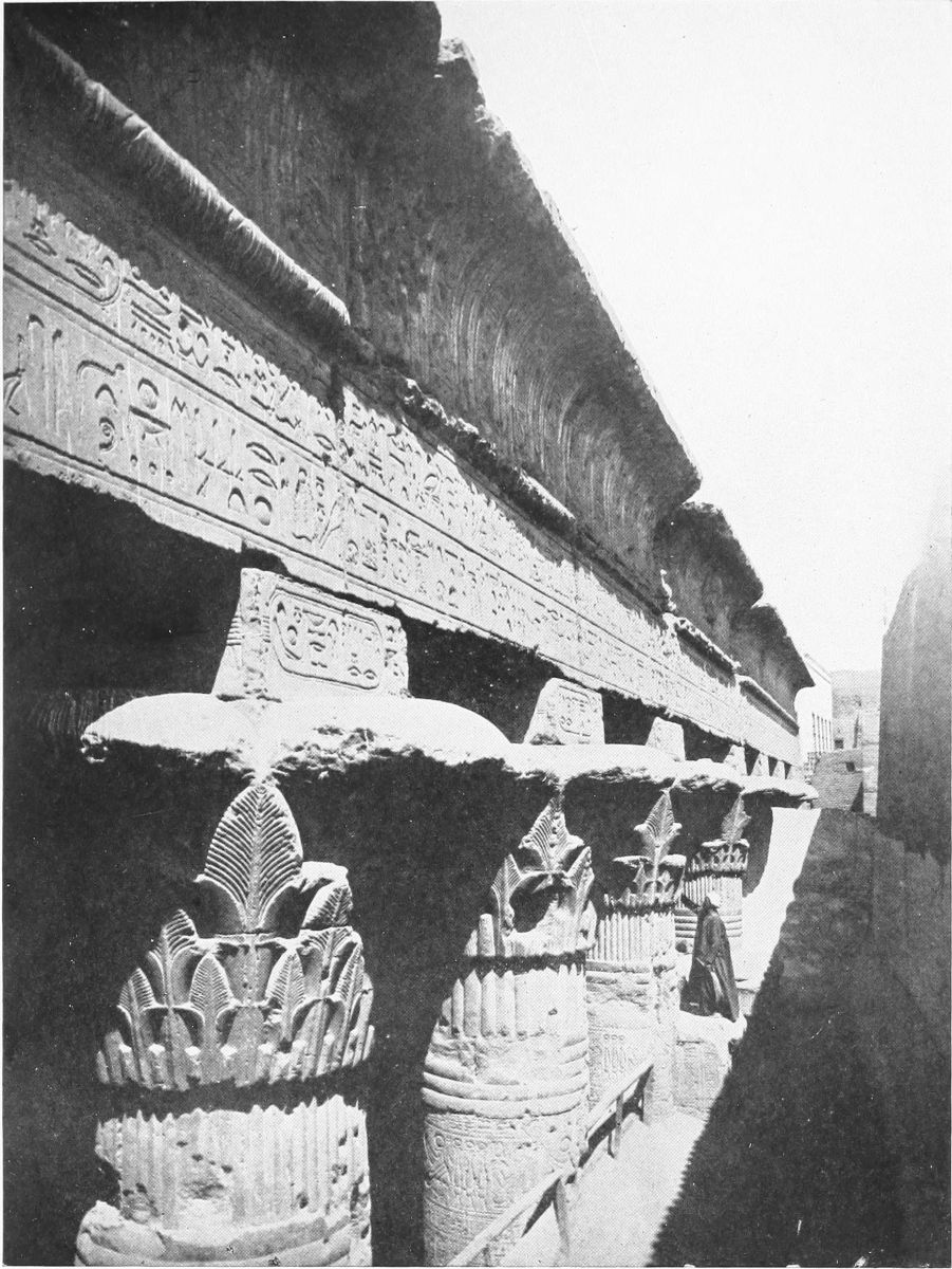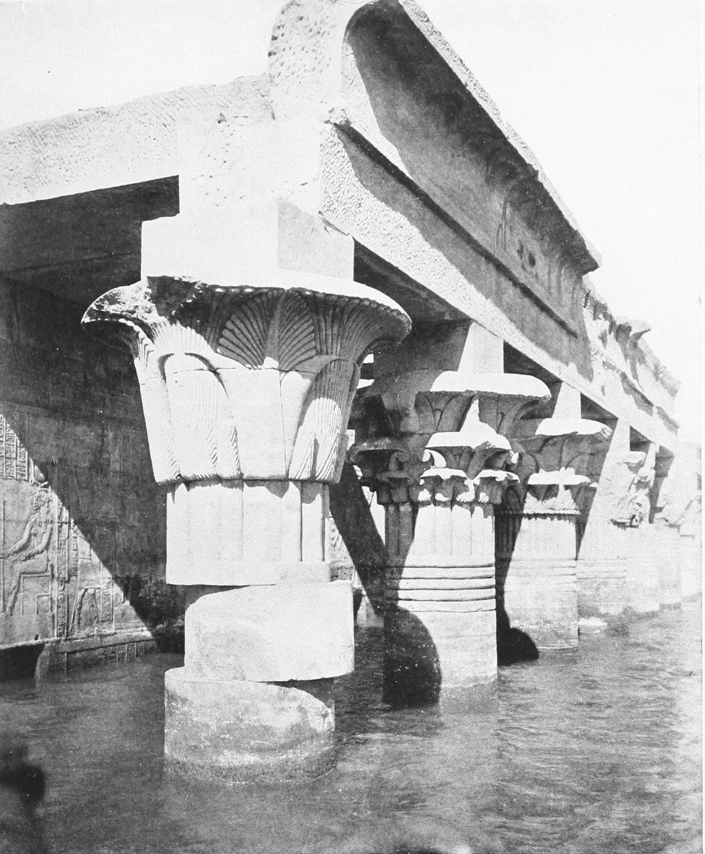 Lovely are the doorways in Philæ; enticing are the shallow steps that lead one onward and upward; gracious the yellow towers that seem to smile a quiet welcome. And there is one chamber that is simply a place of magic—the hall of the painted portico, the delicious hall of the flowers.