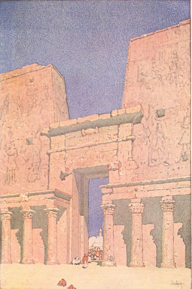 Isis nursing Horus gave way to the Virgin and the child. But the cycles spin away down “the ringing grooves of change.” From Egypt has passed away that decreed Christianity. Now from the minaret the muezzin cries, and in palm-shaded villages I hear the loud hymns of earnest pilgrims starting on the journey to Mecca. And ever this painted chamber shelters its mystery of poetry, its mystery of charm. And still its marvelous colors are fresh as in the far-off pagan days, and the opening lotus-flowers, and the closed lotus-buds, and the palm and the papyrus, are on the perfect columns. And their intrinsic loveliness, and their freshness, and their age, and the mysteries they have looked on—all these facts are part of the spell that governs us to-day. In Edfu one is inclosed in a wonderful austerity. And one can only worship. In Philæ one is wrapped in a radiance of color. And one can only dream. For there is coral pink, and there a wonderful green, “like the green light that lingers in the west,” and there is a blue as deep as the blue of a tropical sea; and there are green-blue and lustrous, ardent red. And the odd fantasy in the coloring, is not that like the fantasy in the temple of a dream? For those who painted these capitals for the greater glory{245}
