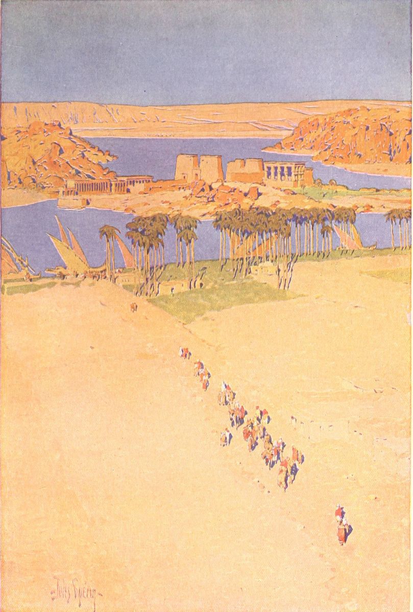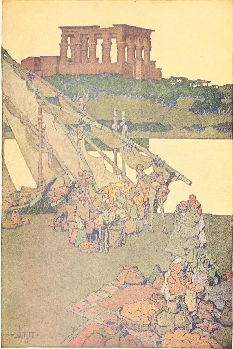 Philæ is the last temple that one visits before he gives himself to the wildness of the solitudes of Nubia. It stands at the very frontier. As one goes up the Nile, it is like a smiling adieu from the Egypt{248} one is leaving. As one comes down, it is like a smiling welcome. In its delicate charm I feel something of the charm of the Egyptian character. There are moments, indeed, when I identify Egypt with Philæ. For in Philæ one must dream; and on the Nile, too, one must dream. And always the dream is happy, and shot through with radiant light—light that is as radiant as the colors in Philæ’s temple. The pylons of Ptolemy smile at you as you go up or come down the river. And the people of Egypt smile as they enter into your dream. A suavity, too, is theirs. I think of them often as artists, who know their parts in the dream-play, who know exactly their function, and how to fulfil it rightly. They sing, while you are dreaming, but it is an under-song, like the murmur of an Eastern river far off from any sea. It never disturbs, this music, but it helps you in your dream. And they are softly gay. And in their eyes there is often the gleam of sunshine, for they are the children—but not grown men—of the sun. That, indeed, is one of the many strange things in Egypt—the youthfulness of its age, the childlikeness of its almost terrible antiquity. One goes there to look at the oldest things in the world and to feel perpetually young—young as Philæ is young, as a lyric of Shelley’s is young, as all of our day-dreams are young, as the people of Egypt are young.