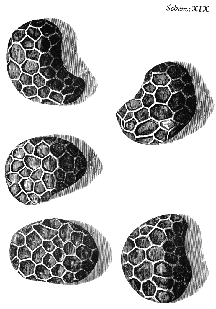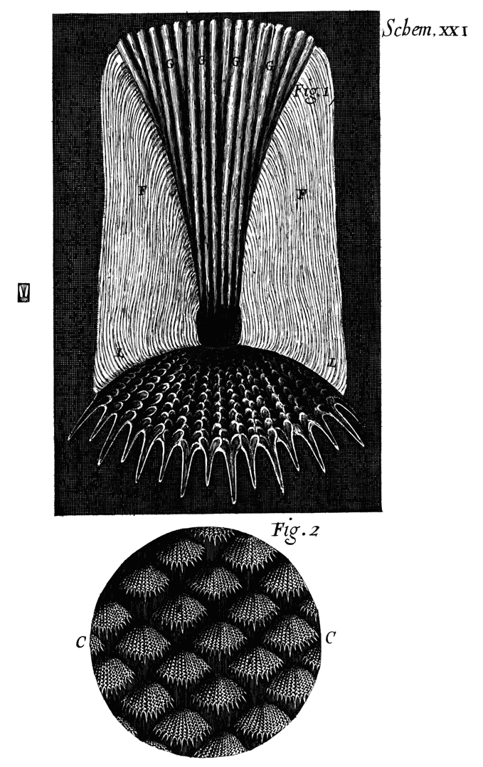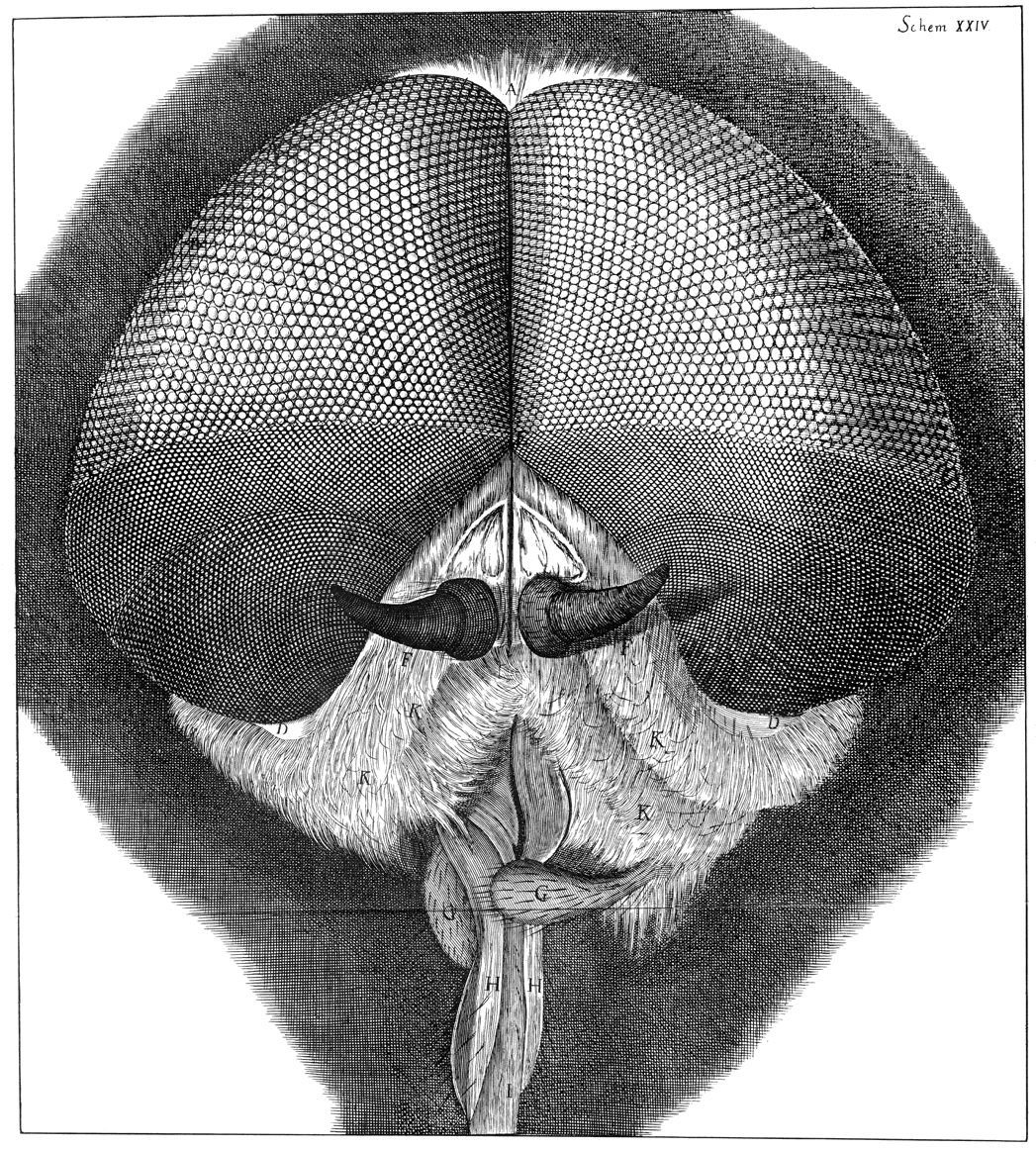 1. All the face of a Drone-fly is nothing almost but eyes. 2. Those are of two magnitudes. 3. They are Hemispheres, and very reflective and smooth. 4. Some directed towards every quarter. 5. How the fly cleanses them. 6. Their number. 7. Their order: divers particulars observ’d in the dissecting a head. That these are very probably the eyes of the Creature; argued from several Observations and Experiments, that Crabs, Lobsters, Shrimps, seem to be water Insects, and to be framed much like Air Insects. Several Considerations about their manner of vision.
