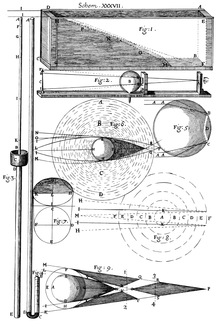 A short rehearsal of several Phænomena. An attempt to explicate them: the supposition founded on two Propositions, both which are indeavoured to be made out by several Experiments, What density and rarity is in respect of refraction: the refraction of Spirit of Wine compared with that of common Water: the refraction of Ice. An Experiment of making an Undulation of the Rays by the mixing of Liquors of differing density. The explication of inflection, mechanically and hypothetically: what Bodies have such an inflection. Several Experiments to shew that the Air has this propriety; that it proceeds from the differing density of the Air: that the upper and under part of the Air are of differing density: some Experiments to prove this. A Table of the strength of the spring of the Air, answering to each degree of extension; when first made, and when repeated. Another Experiment of compressing the Air. A Table of the strength of the Air, answering to each compression and expansion; from which the height of the Air may be suppos’d indefinite; to what degree the Air is rarifi’d at any distance above the Surface of the Earth: how, from this, Inflection is inferr’d; and several Phænomena explain’d. That the Air near the Earth is compos’d of parts of differing density; made probable by several Experiments and Observations; how this propriety produces the effects of the waving and dancing of Bodies; and of the twinkling of the Stars. Several Phænomena explicated. Some Quæries added.