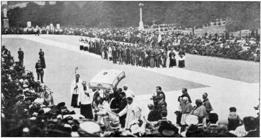 After coffee, a few hours later, I went down again to the square. It was Sunday, and a Pontifical High Mass was being sung on the steps of the Rosary Church. As usual, the crowd filled the square, and I could hardly penetrate for a while beyond the fringe; but it was a new experience to hear that vast congregation in the open air responding with one giant voice to the plain-song of the Mass. It was astonishing what expression showed itself in the singing. The Sanctus was one of the most impressive peals of worship and adoration that I have ever heard. At the close of the Mass, all the bishops present near the altar—I counted six or seven—turned and gave the blessing simultaneously. On the two great curves that led up to the basilica were grouped the white banners of the miraculés.