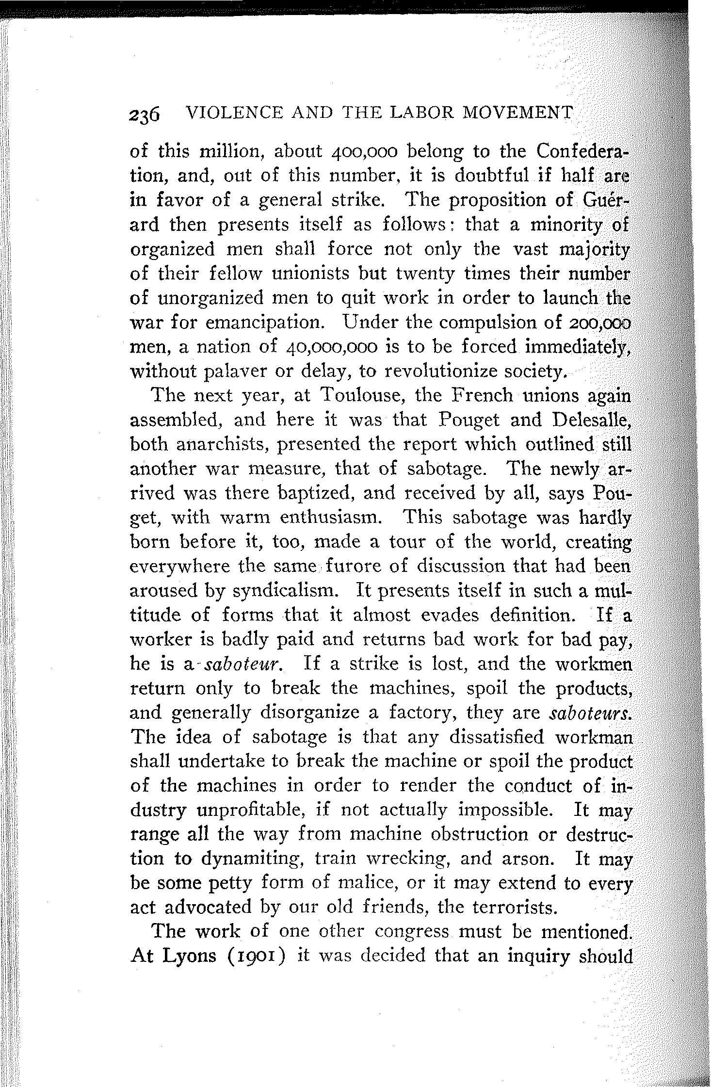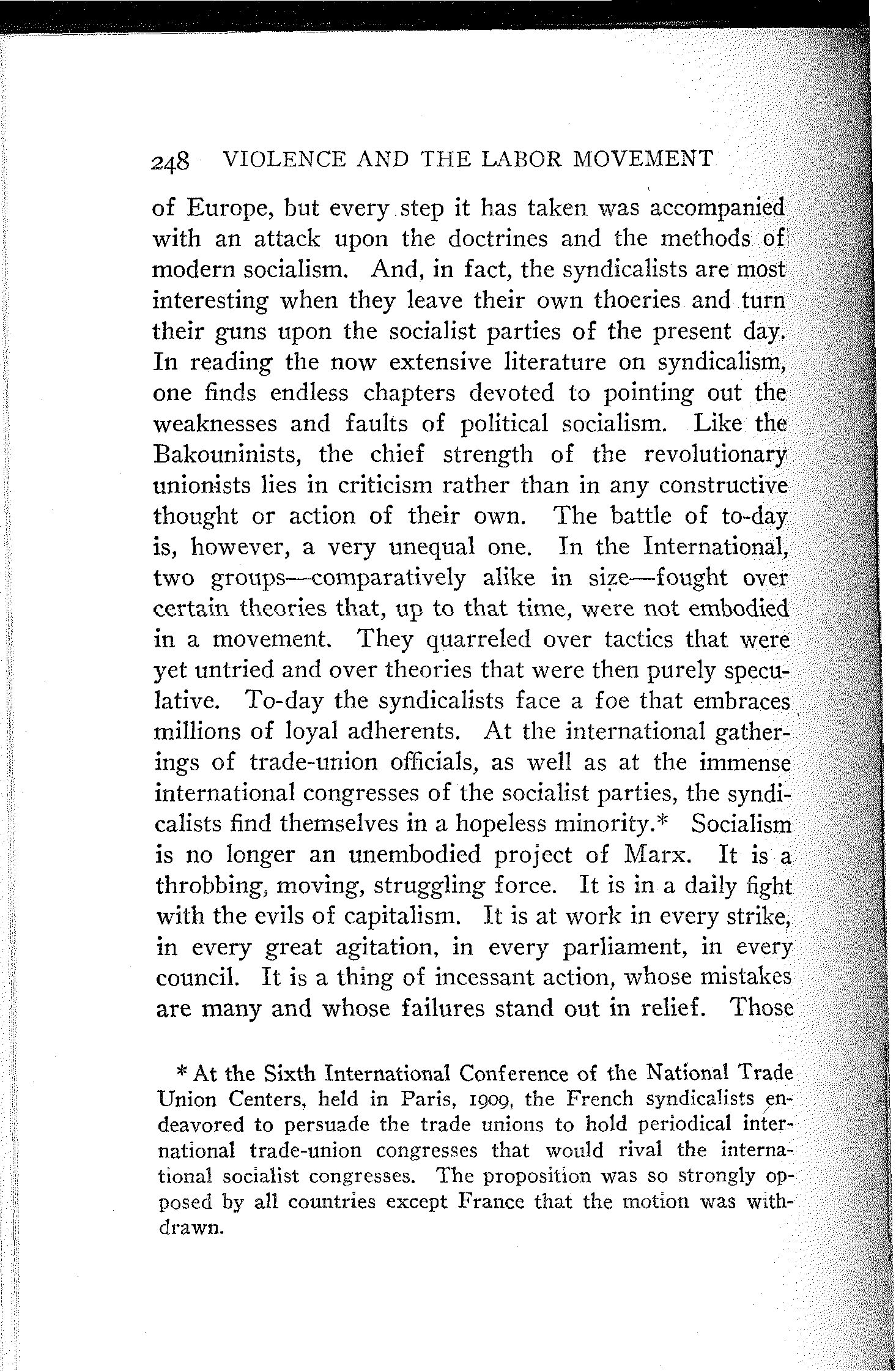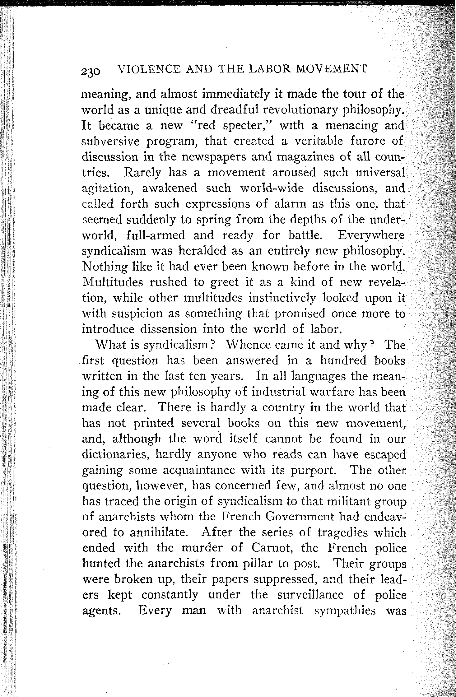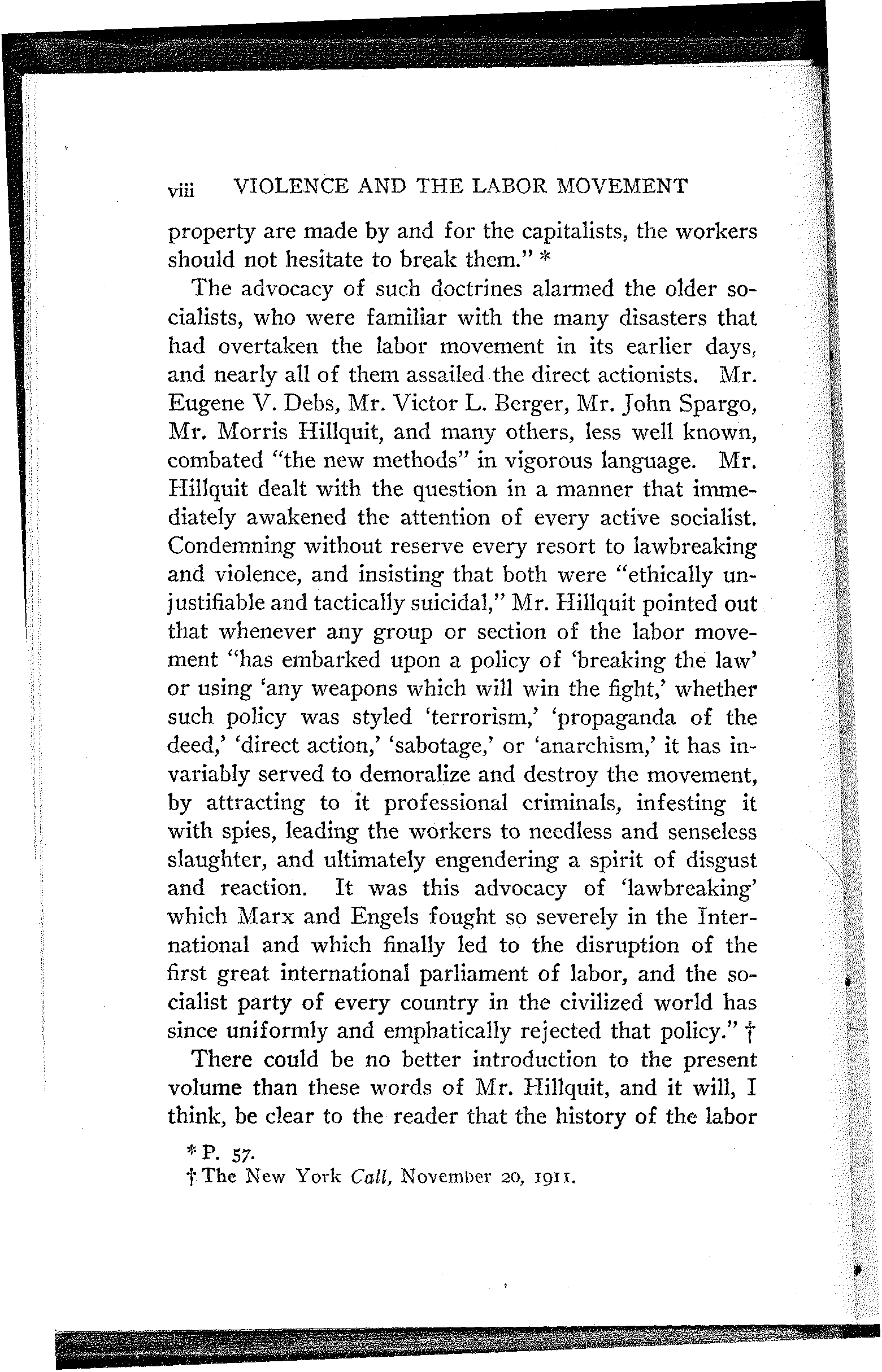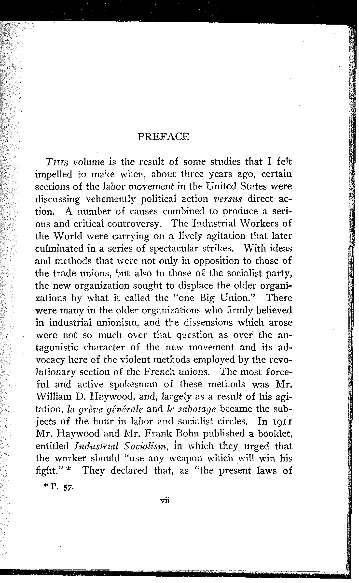This volume is the result of some studies that I felt impelled to make when, about three years ago, certain sections of the labor movement in the United States were discussing vehemently political action versus direct action. A number of causes combined to produce a serious and critical controversy. The Industrial Workers of the World were carrying on a lively agitation that later culminated in a series of spectacular strikes. With ideas and methods that were not only in opposition to those of the trade unions, but also to those of the socialist party, the new organization sought to displace the older organizations by what it called the "one Big Union." There were many in the older organizations who firmly believed in industrial unionism, and the dissensions which arose were not so much over that question as over the antagonistic character of the new movement and its advocacy here of the violent methods employed by the revolutionary section of the French unions. The most forceful and active spokesman of these methods was Mr. William D. Haywood, and, largely as a result of his agitation, la grève générale and le sabotage became the subjects of the hour in labor and socialist circles. In 1911 Mr. Haywood and Mr. Frank Bohn published a booklet, entitled Industrial Socialism, in which they urged that the worker should "use any weapon which will win his fight."[A] They declared that, as "the present laws of[viii] property are made by and for the capitalists, the workers should not hesitate to break them."[B]