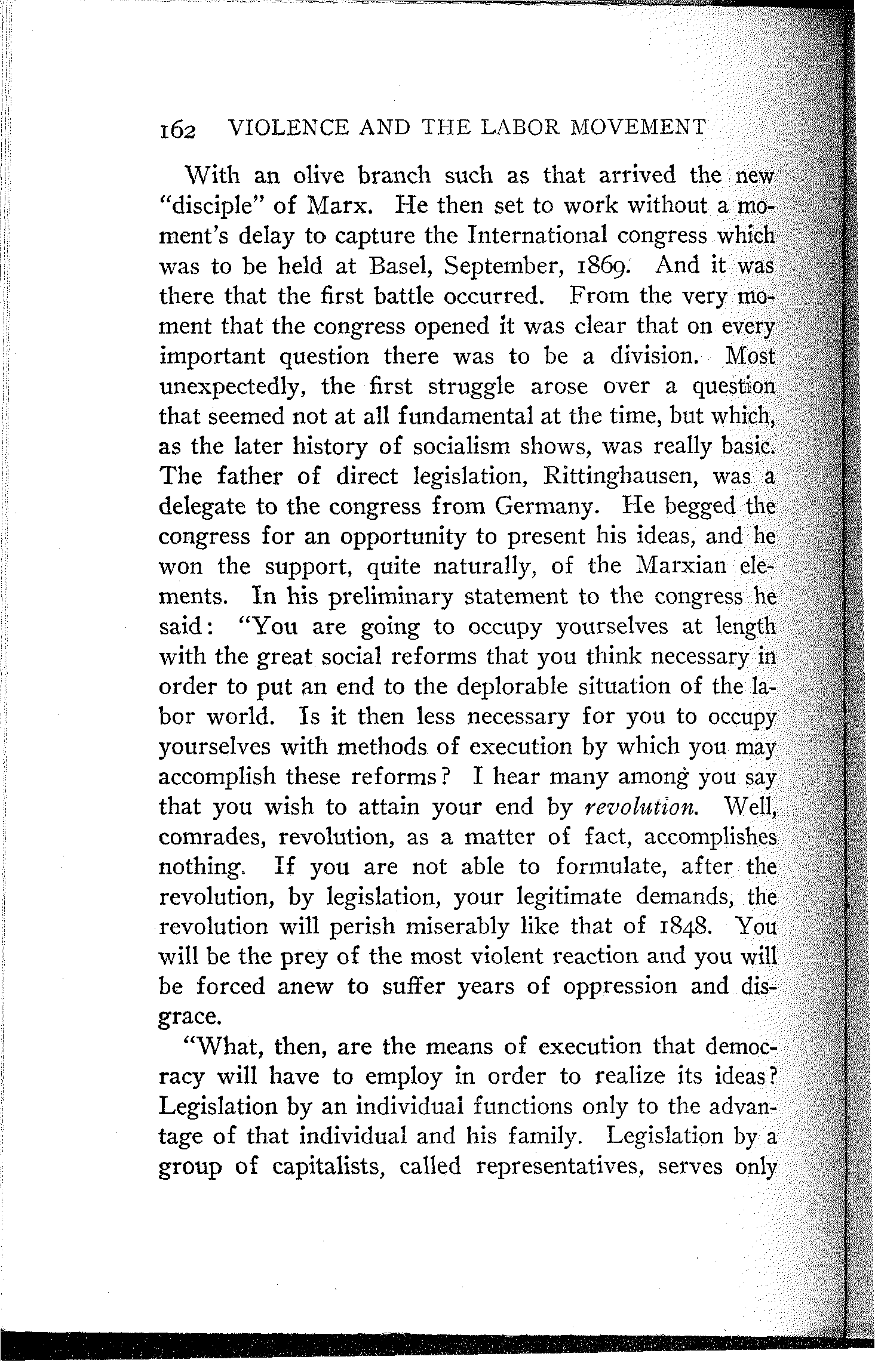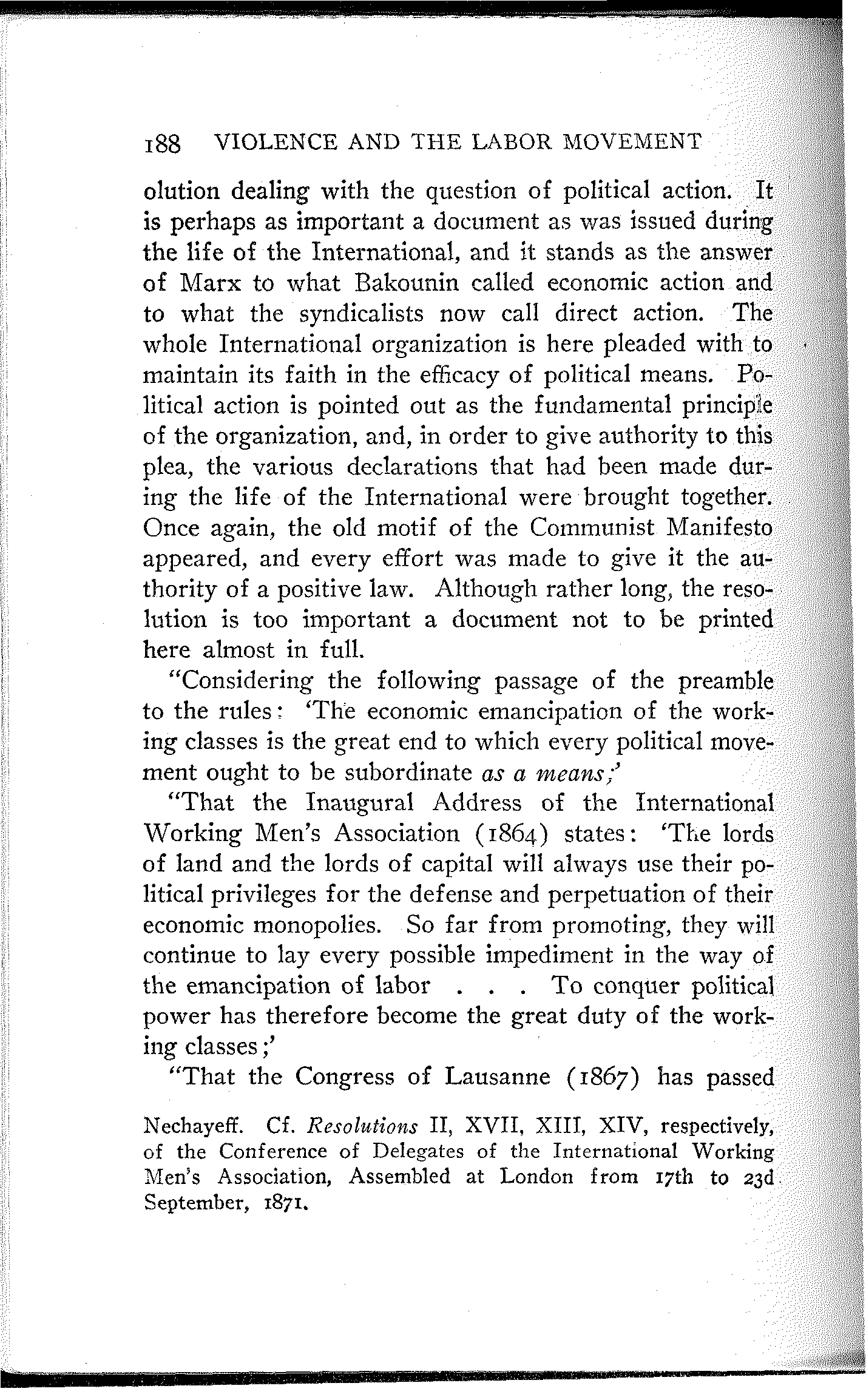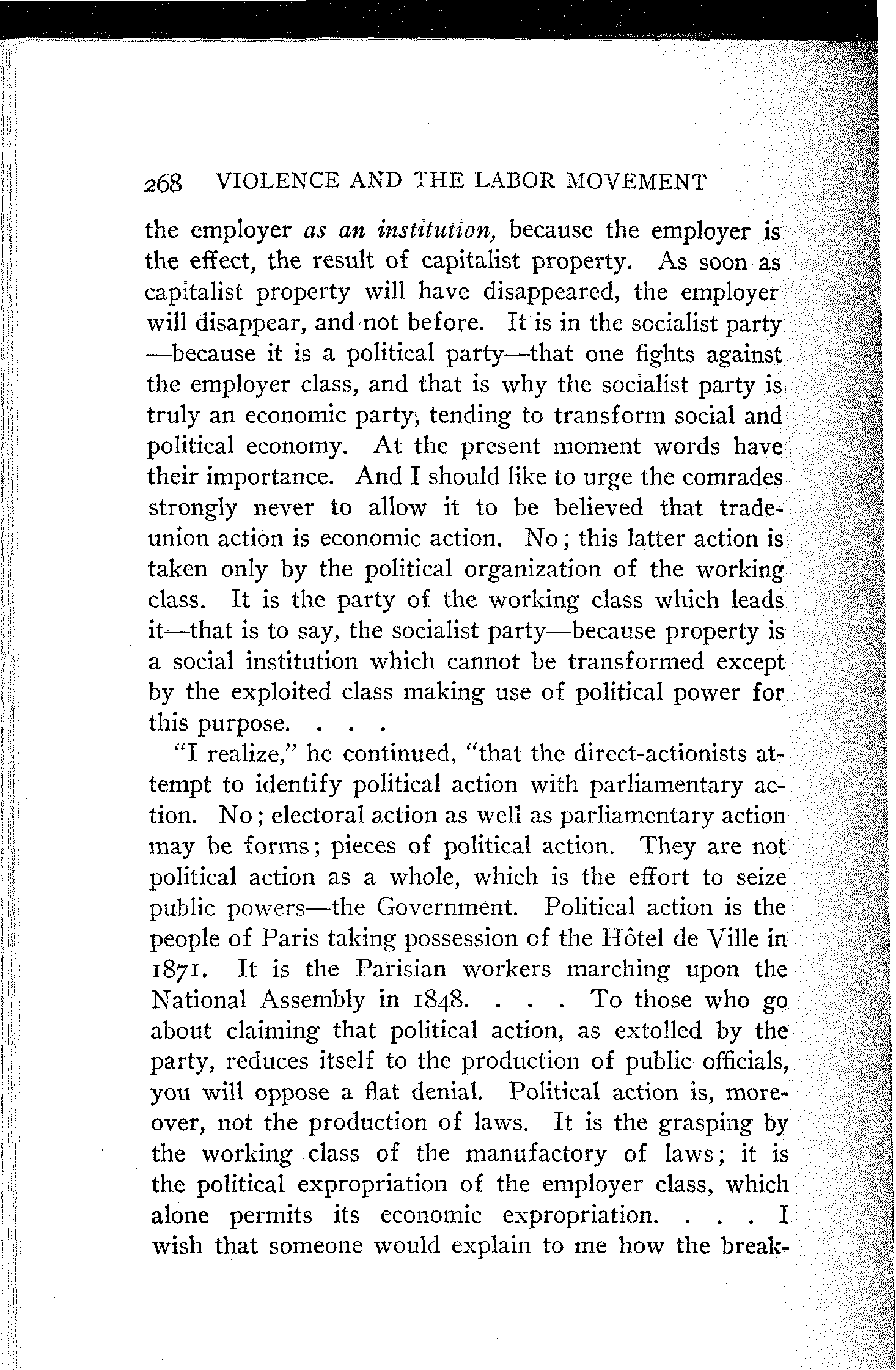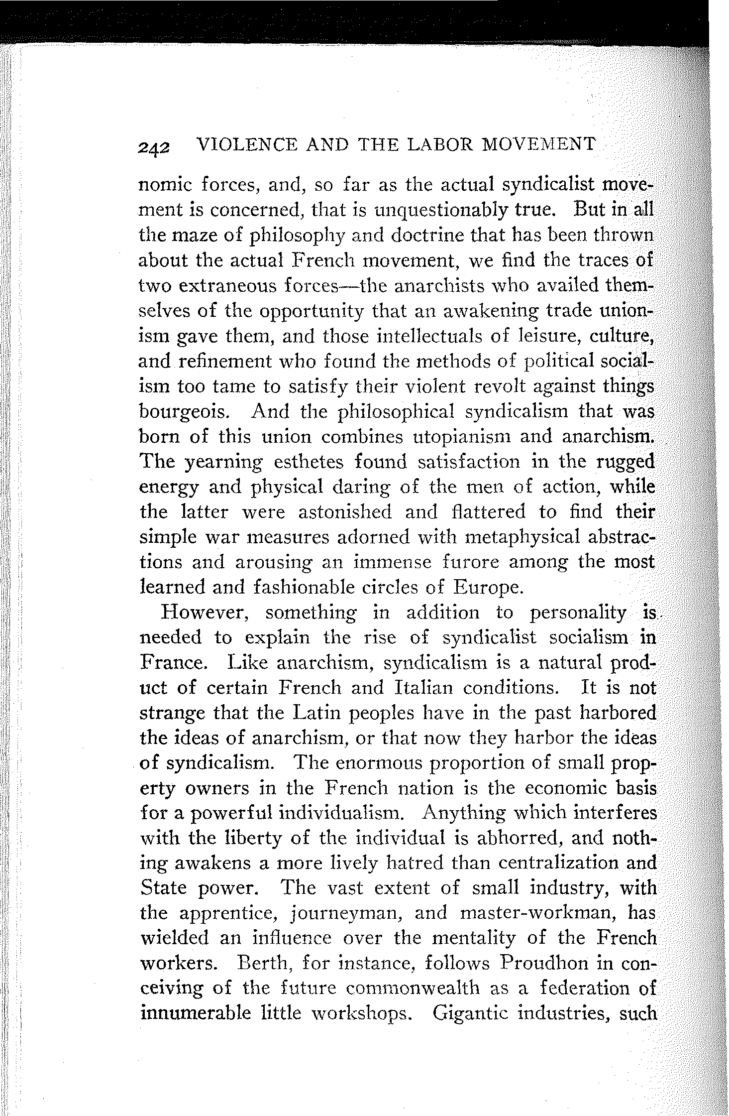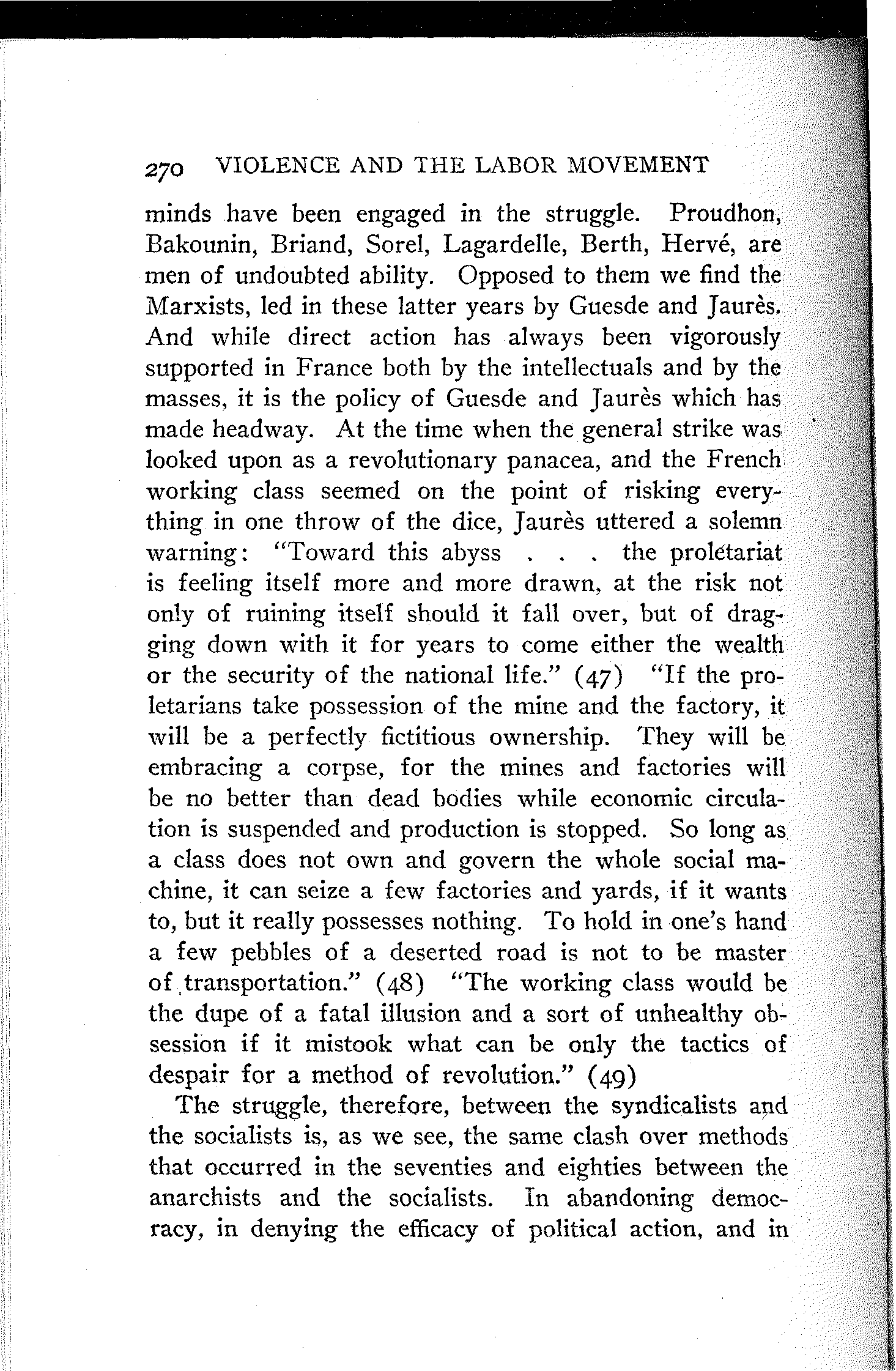 This volume is the result of some studies that I felt impelled to make when, about three years ago, certain sections of the labor movement in the United States were discussing vehemently political action versus direct action. A number of causes combined to produce a serious and critical controversy. The Industrial Workers of the World were carrying on a lively agitation that later culminated in a series of spectacular strikes. With ideas and methods that were not only in opposition to those of the trade unions, but also to those of the socialist party, the new organization sought to displace the older organizations by what it called the "one Big Union." There were many in the older organizations who firmly believed in industrial unionism, and the dissensions which arose were not so much over that question as over the antagonistic character of the new movement and its advocacy here of the violent methods employed by the revolutionary section of the French unions. The most forceful and active spokesman of these methods was Mr. William D. Haywood, and, largely as a result of his agitation, la grève générale and le sabotage became the subjects of the hour in labor and socialist circles. In 1911 Mr. Haywood and Mr. Frank Bohn published a booklet, entitled Industrial Socialism, in which they urged that the worker should "use any weapon which will win his fight."[A] They declared that, as "the present laws of[viii] property are made by and for the capitalists, the workers should not hesitate to break them."[B]