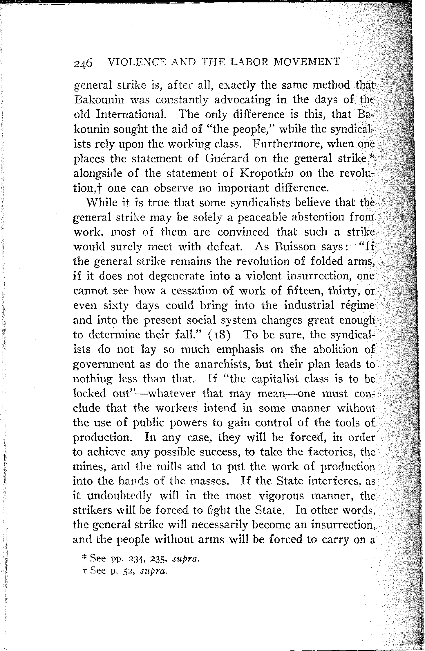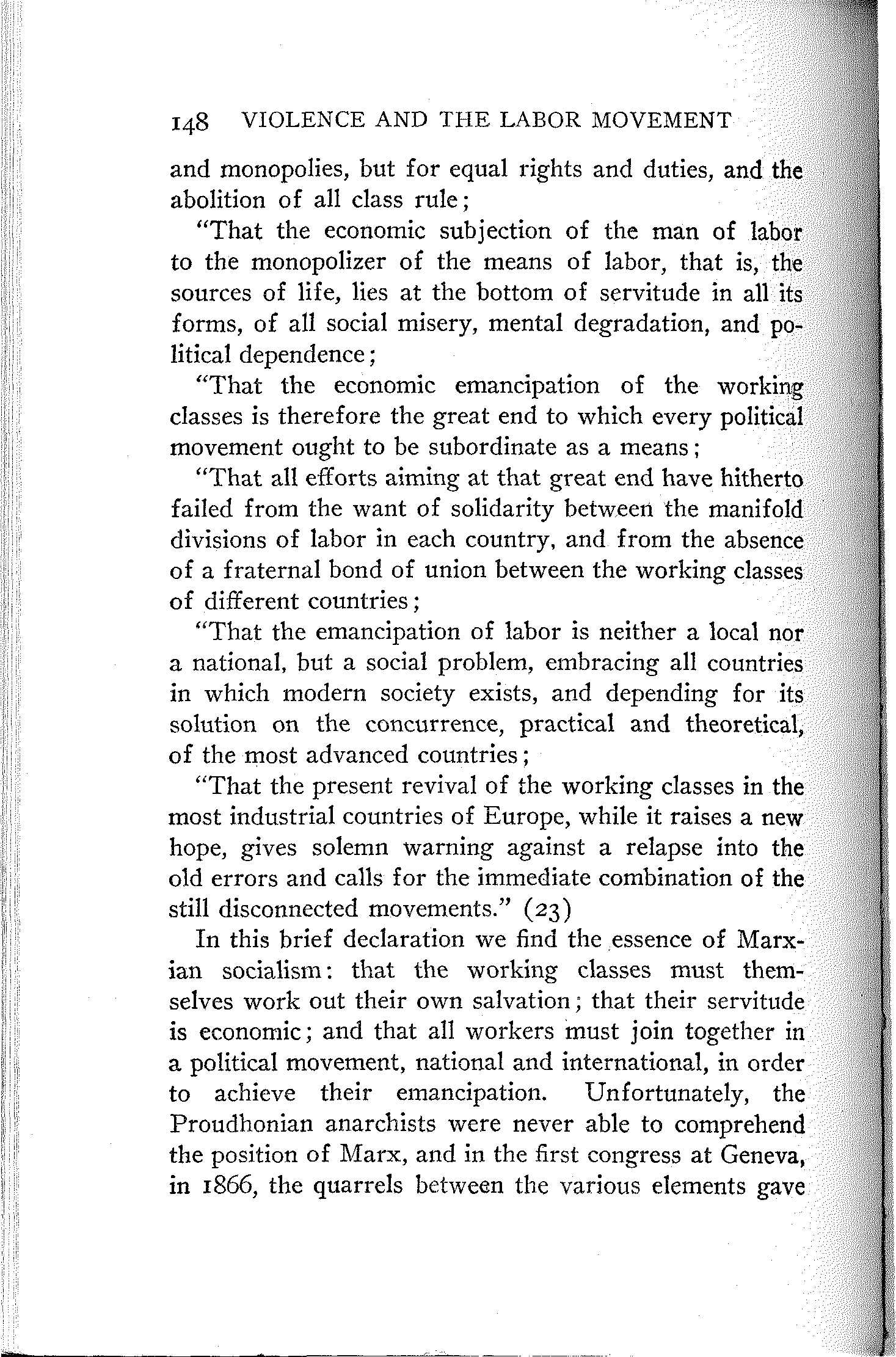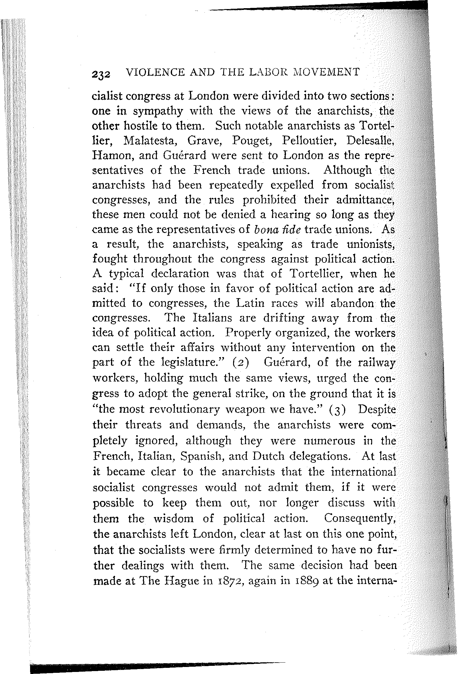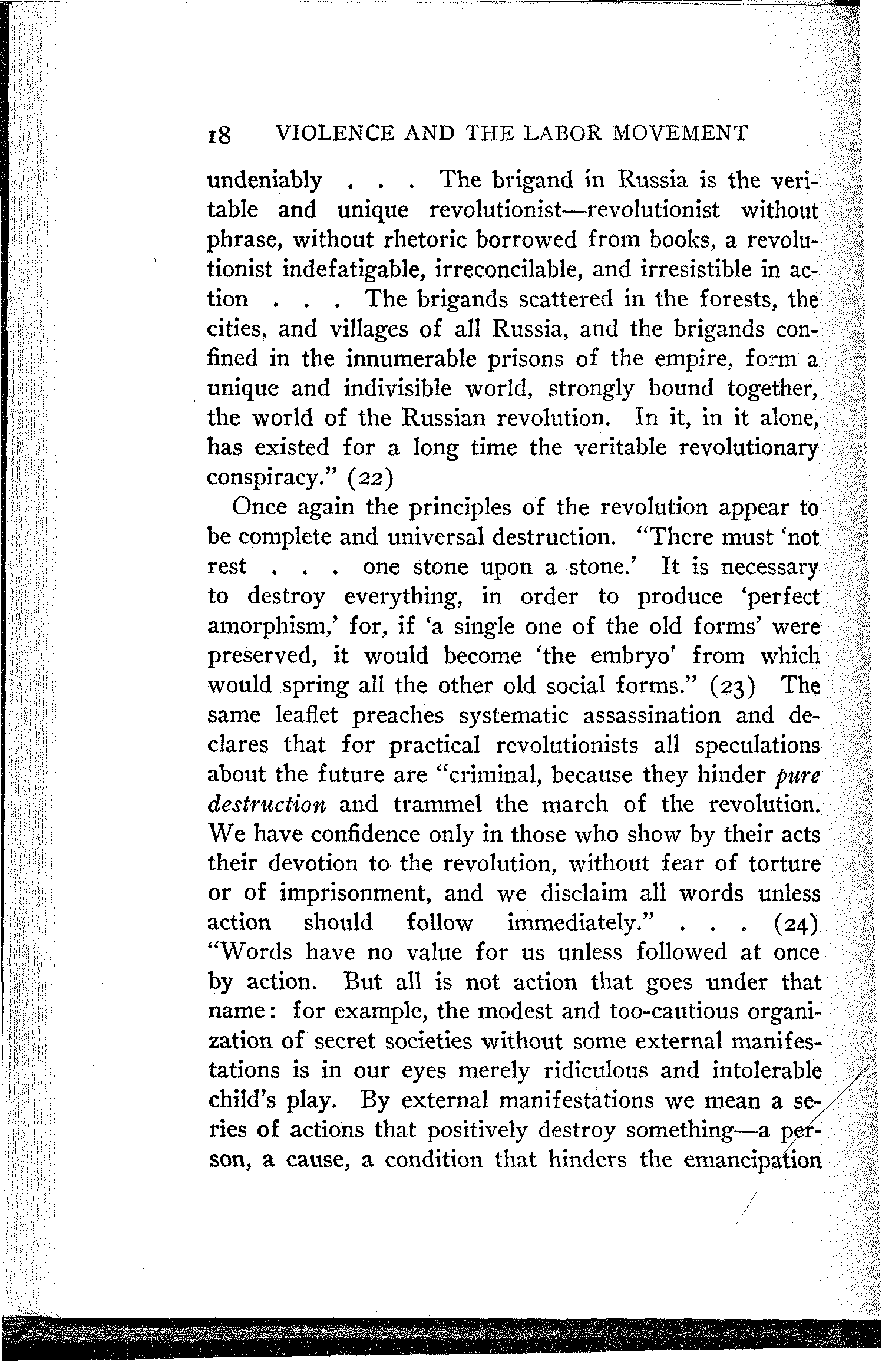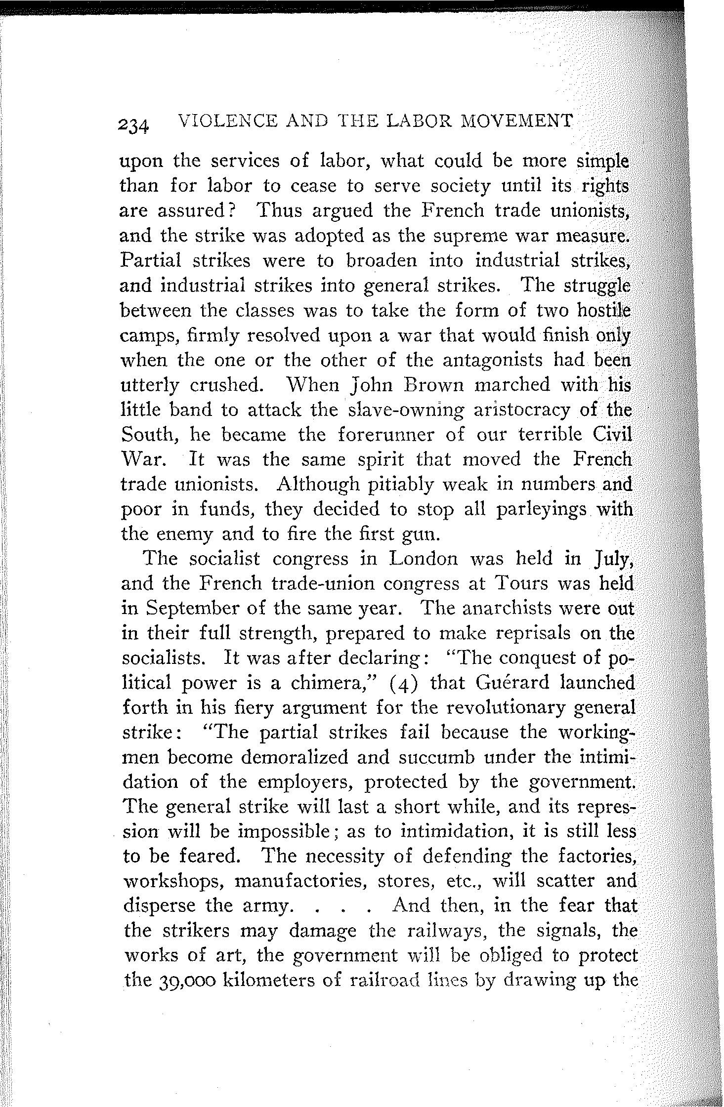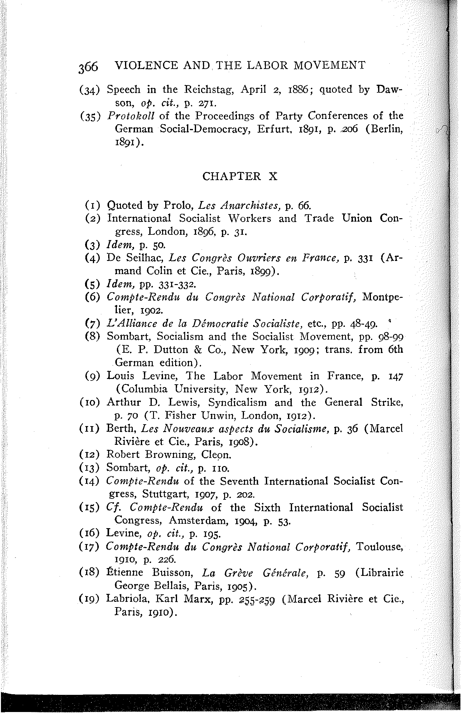This volume is the result of some studies that I felt impelled to make when, about three years ago, certain sections of the labor movement in the United States were discussing vehemently political action versus direct action. A number of causes combined to produce a serious and critical controversy. The Industrial Workers of the World were carrying on a lively agitation that later culminated in a series of spectacular strikes. With ideas and methods that were not only in opposition to those of the trade unions, but also to those of the socialist party, the new organization sought to displace the older organizations by what it called the "one Big Union." There were many in the older organizations who firmly believed in industrial unionism, and the dissensions which arose were not so much over that question as over the antagonistic character of the new movement and its advocacy here of the violent methods employed by the revolutionary section of the French unions. The most forceful and active spokesman of these methods was Mr. William D. Haywood, and, largely as a result of his agitation, la grève générale and le sabotage became the subjects of the hour in labor and socialist circles. In 1911 Mr. Haywood and Mr. Frank Bohn published a booklet, entitled Industrial Socialism, in which they urged that the worker should "use any weapon which will win his fight."[A] They declared that, as "the present laws of[viii] property are made by and for the capitalists, the workers should not hesitate to break them."[B]
