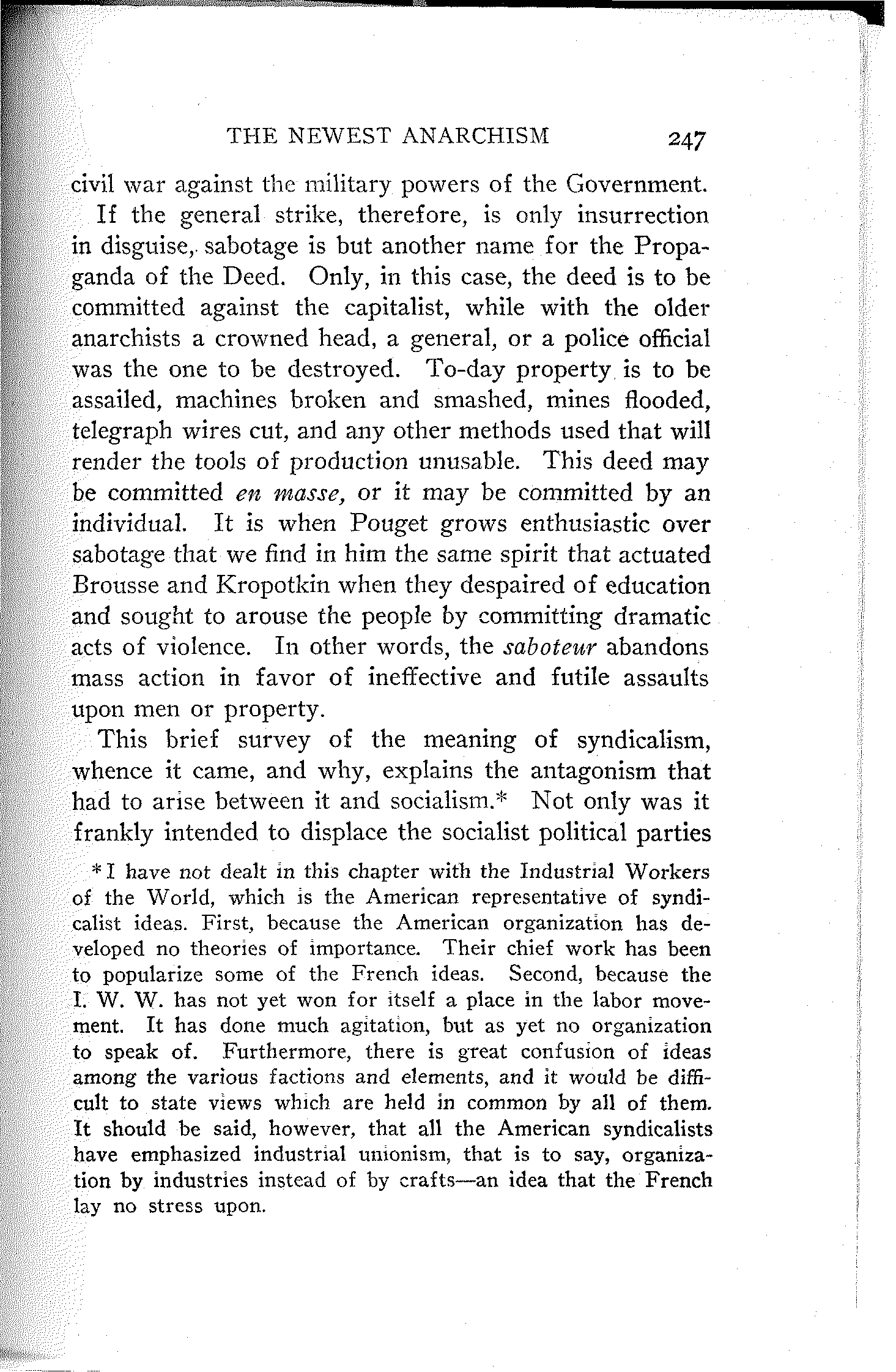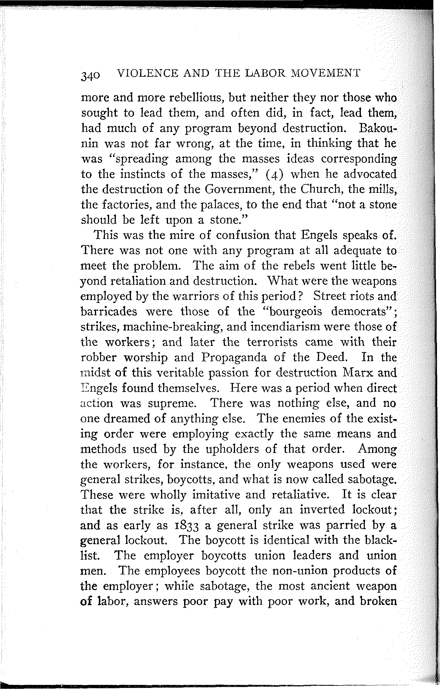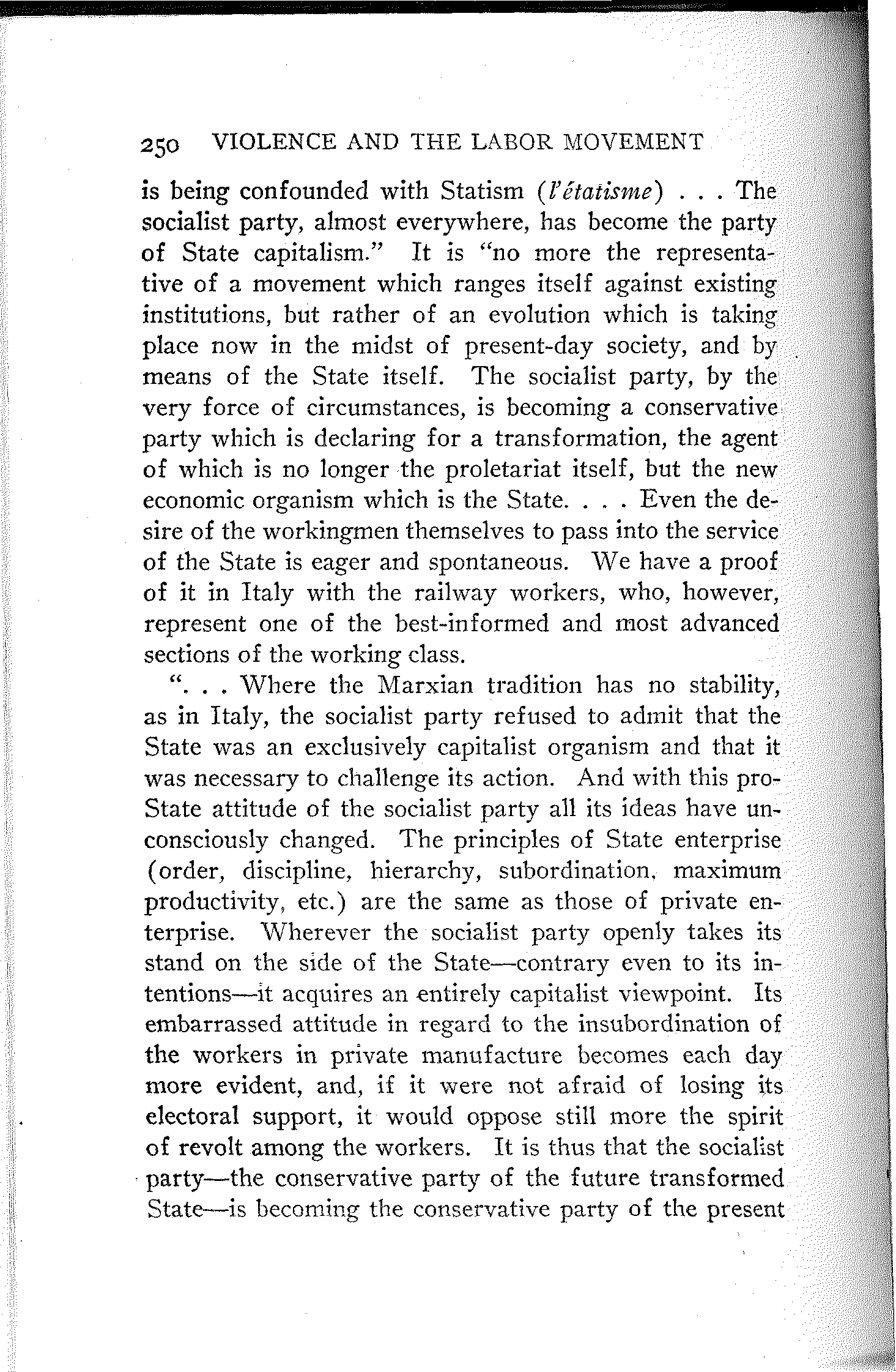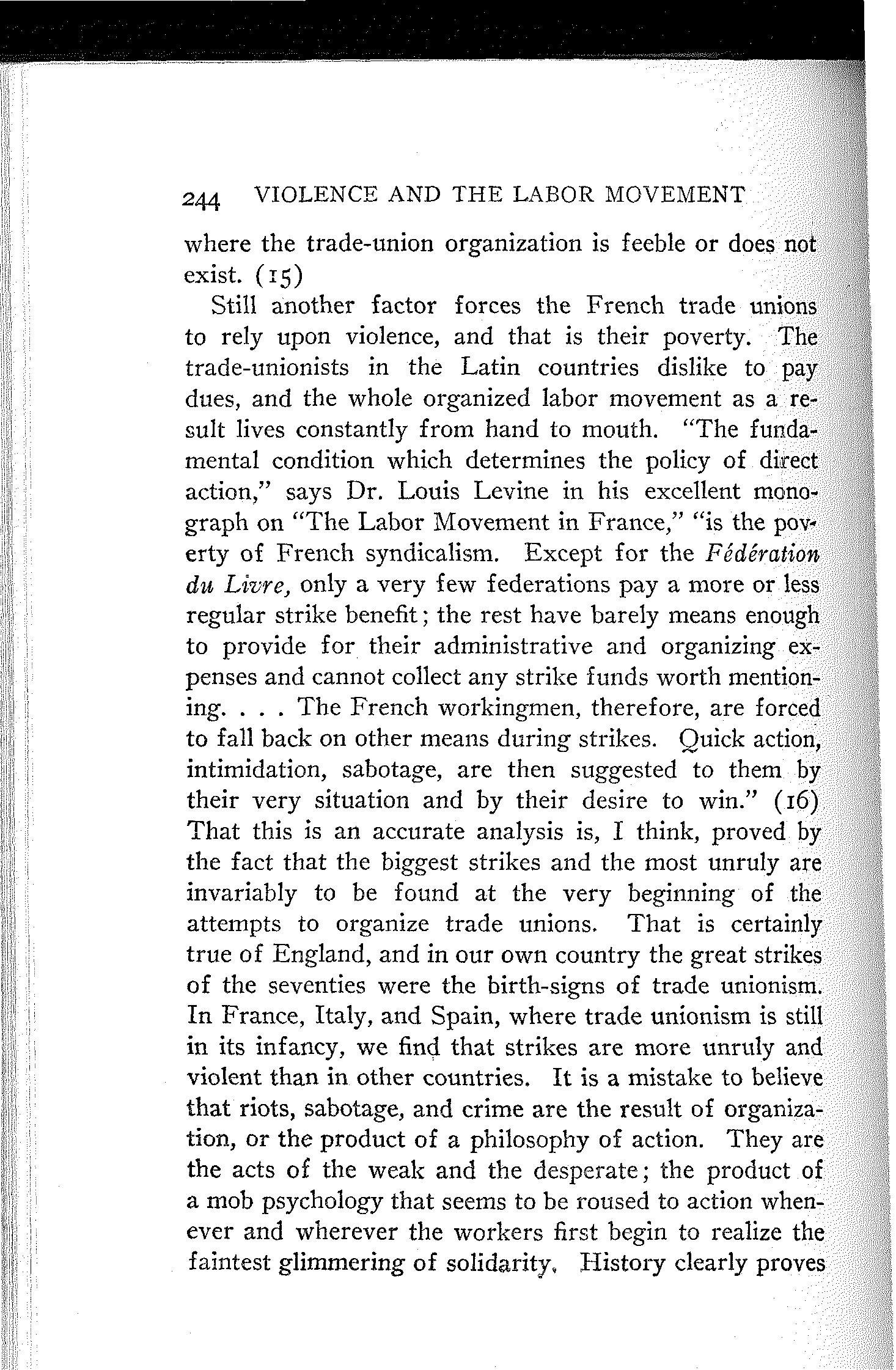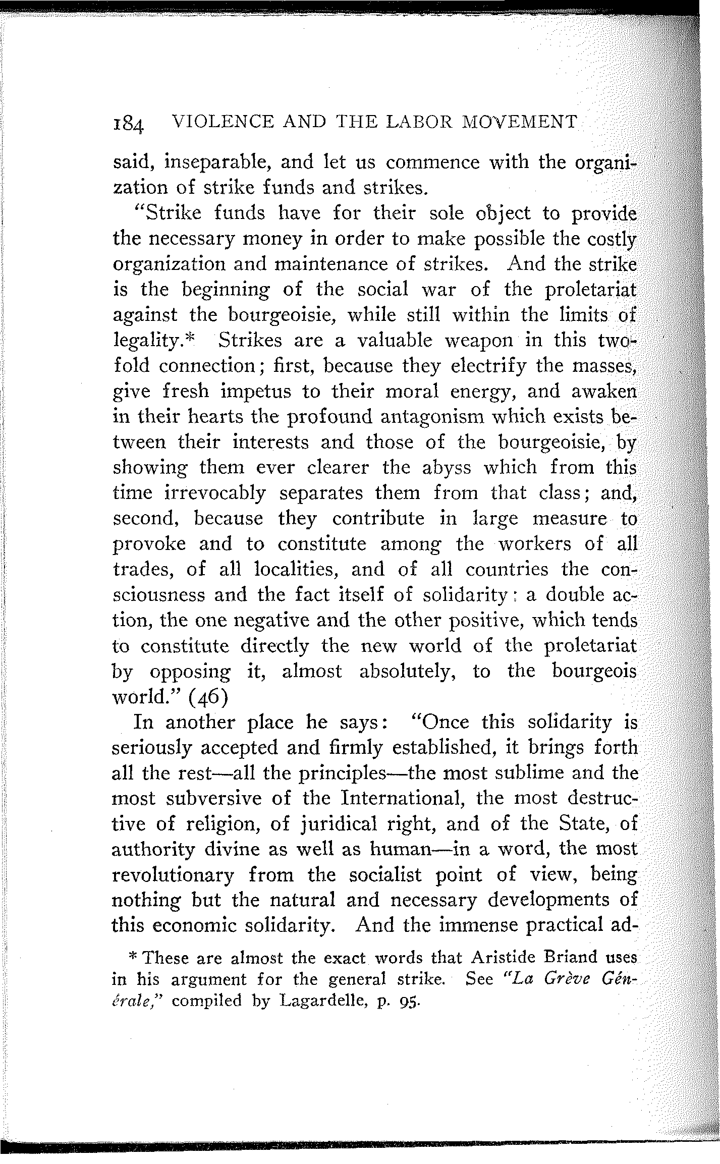 This volume is the result of some studies that I felt impelled to make when, about three years ago, certain sections of the labor movement in the United States were discussing vehemently political action versus direct action. A number of causes combined to produce a serious and critical controversy. The Industrial Workers of the World were carrying on a lively agitation that later culminated in a series of spectacular strikes. With ideas and methods that were not only in opposition to those of the trade unions, but also to those of the socialist party, the new organization sought to displace the older organizations by what it called the "one Big Union." There were many in the older organizations who firmly believed in industrial unionism, and the dissensions which arose were not so much over that question as over the antagonistic character of the new movement and its advocacy here of the violent methods employed by the revolutionary section of the French unions. The most forceful and active spokesman of these methods was Mr. William D. Haywood, and, largely as a result of his agitation, la grève générale and le sabotage became the subjects of the hour in labor and socialist circles. In 1911 Mr. Haywood and Mr. Frank Bohn published a booklet, entitled Industrial Socialism, in which they urged that the worker should "use any weapon which will win his fight."[A] They declared that, as "the present laws of[viii] property are made by and for the capitalists, the workers should not hesitate to break them."[B]