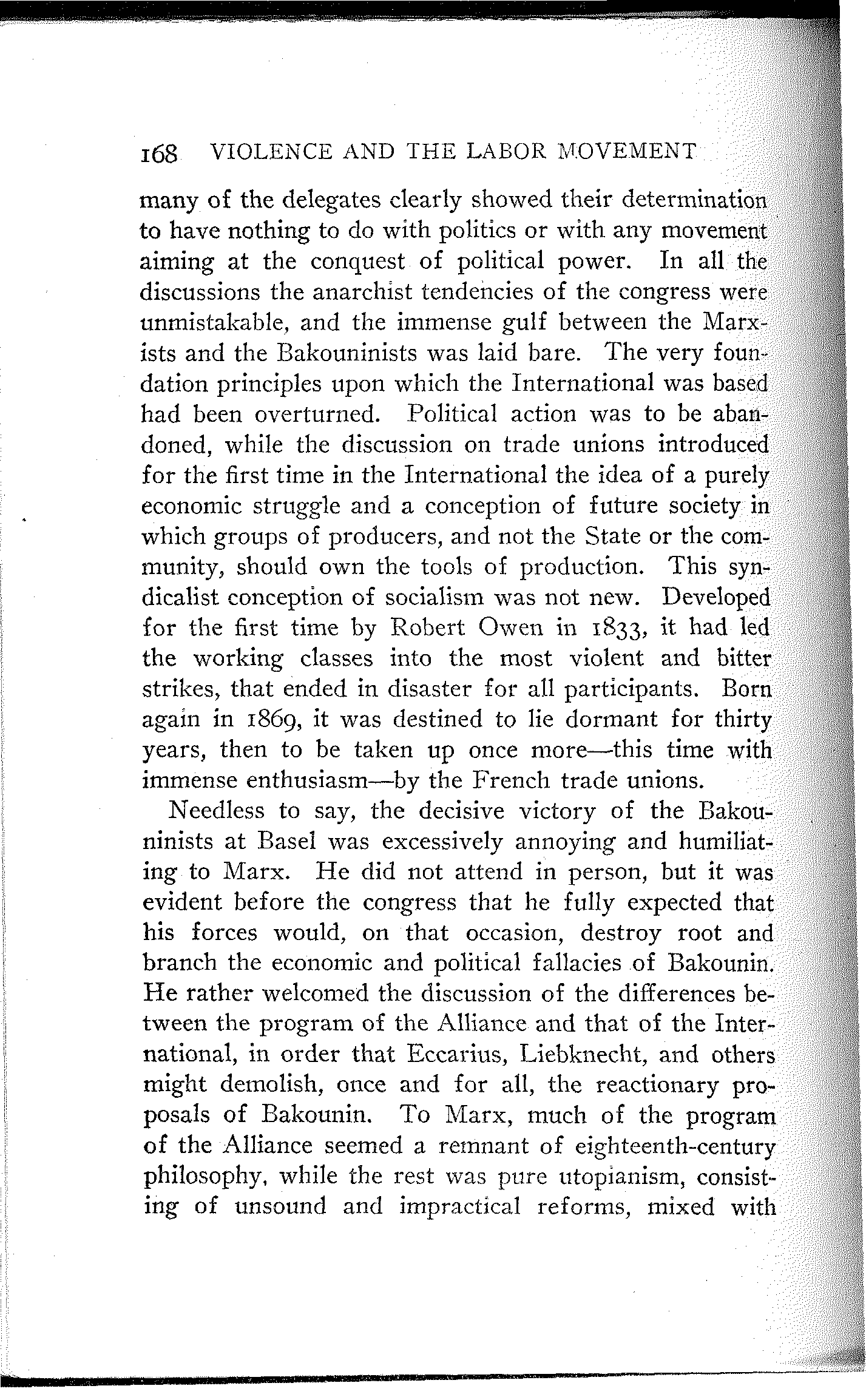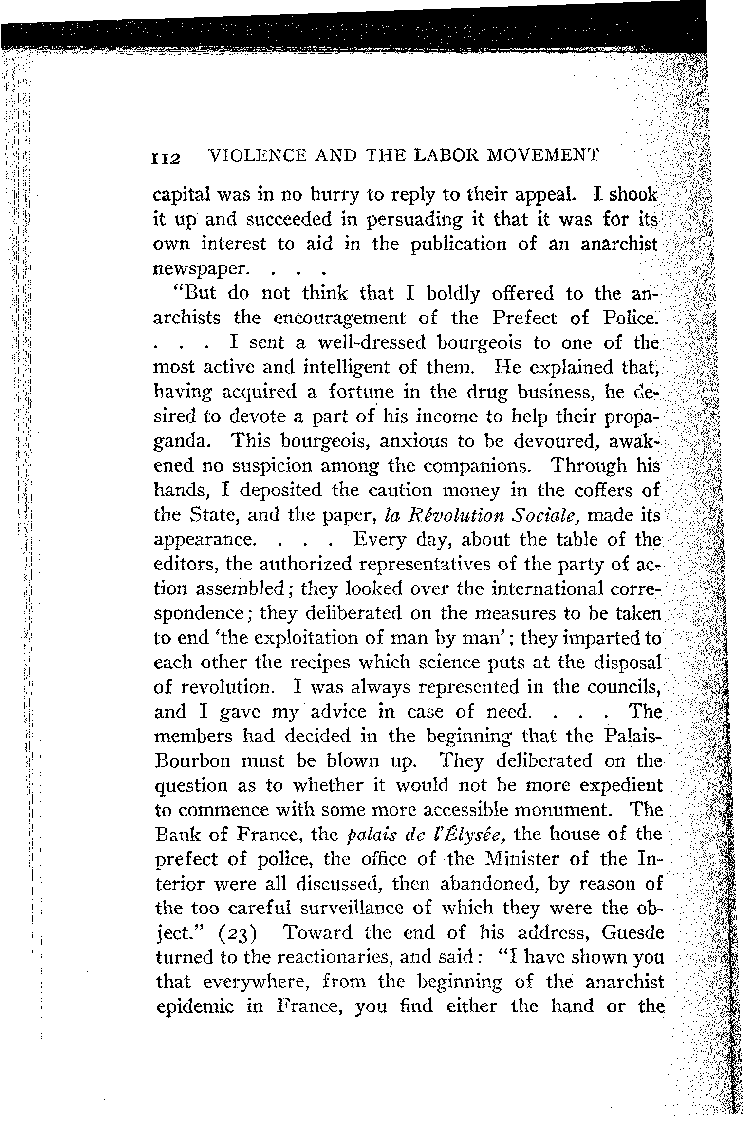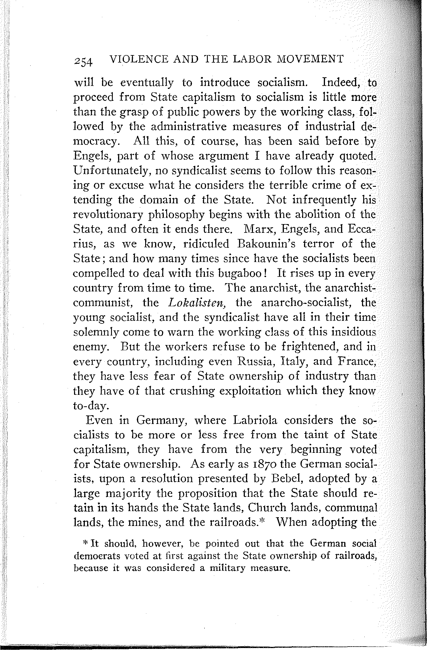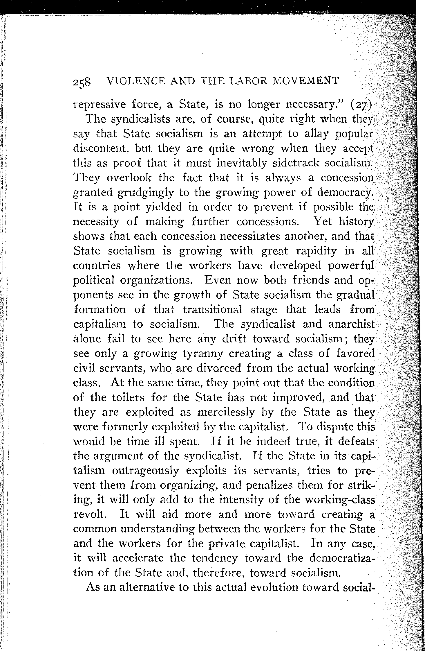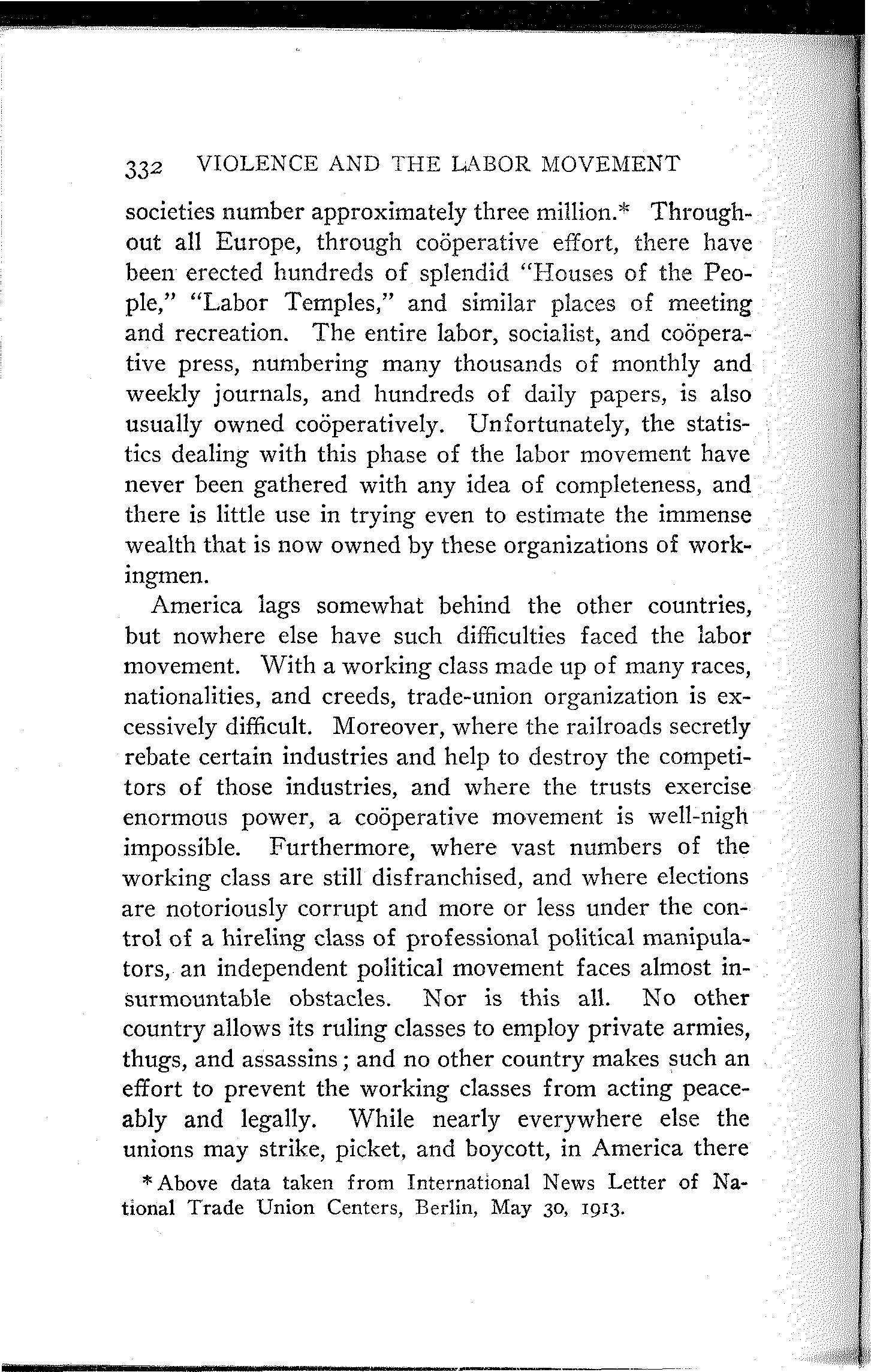 This volume is the result of some studies that I felt impelled to make when, about three years ago, certain sections of the labor movement in the United States were discussing vehemently political action versus direct action. A number of causes combined to produce a serious and critical controversy. The Industrial Workers of the World were carrying on a lively agitation that later culminated in a series of spectacular strikes. With ideas and methods that were not only in opposition to those of the trade unions, but also to those of the socialist party, the new organization sought to displace the older organizations by what it called the "one Big Union." There were many in the older organizations who firmly believed in industrial unionism, and the dissensions which arose were not so much over that question as over the antagonistic character of the new movement and its advocacy here of the violent methods employed by the revolutionary section of the French unions. The most forceful and active spokesman of these methods was Mr. William D. Haywood, and, largely as a result of his agitation, la grève générale and le sabotage became the subjects of the hour in labor and socialist circles. In 1911 Mr. Haywood and Mr. Frank Bohn published a booklet, entitled Industrial Socialism, in which they urged that the worker should "use any weapon which will win his fight."[A] They declared that, as "the present laws of[viii] property are made by and for the capitalists, the workers should not hesitate to break them."[B]