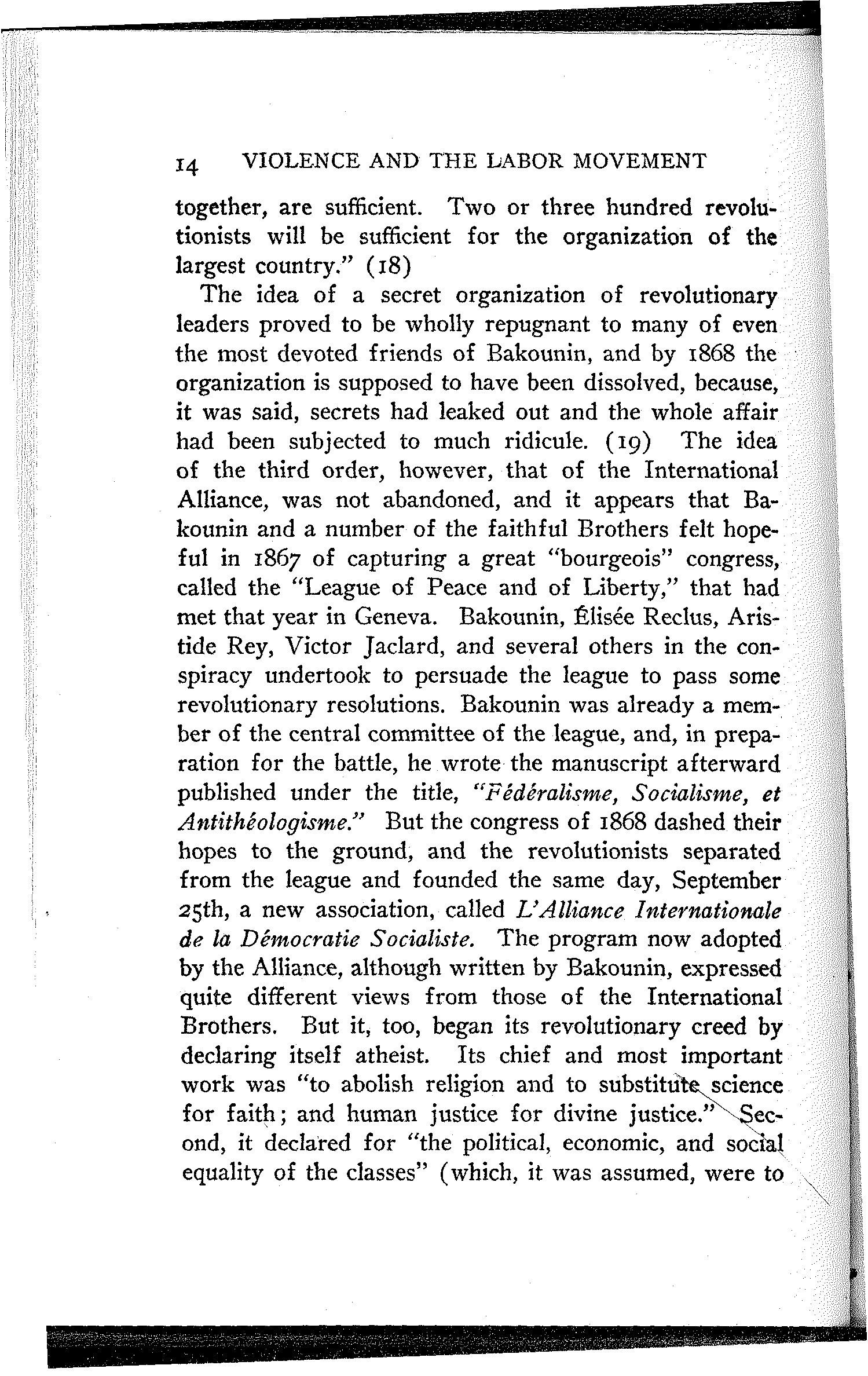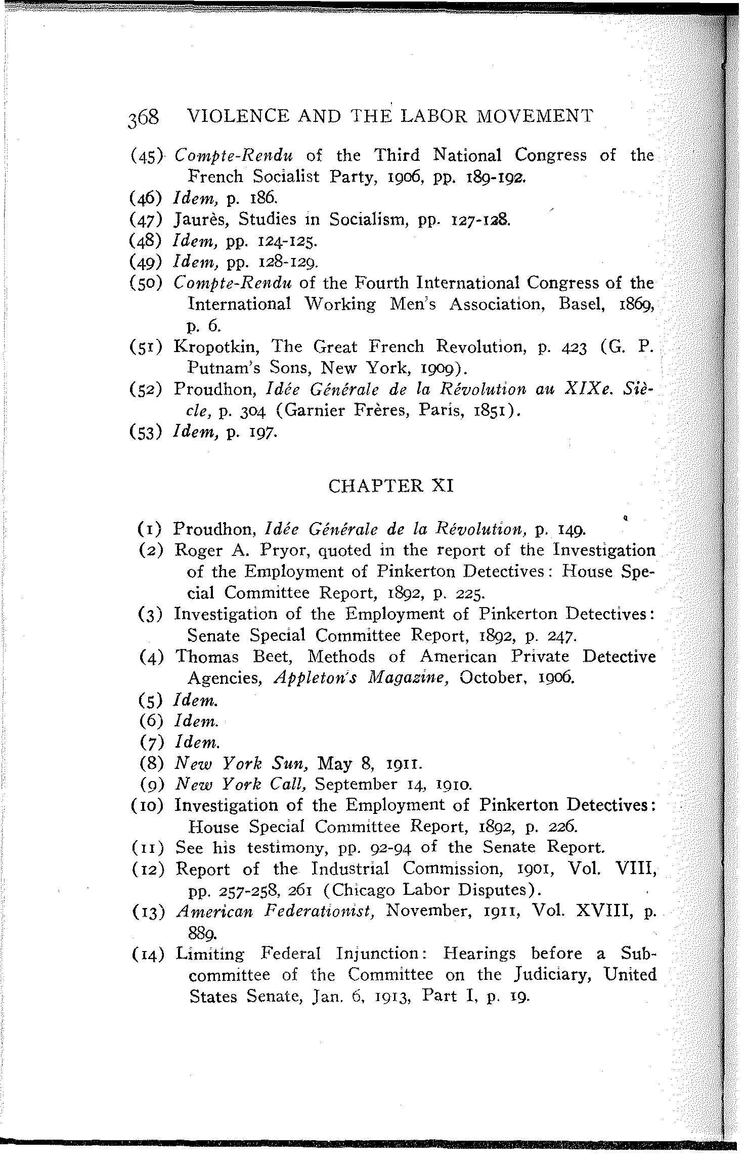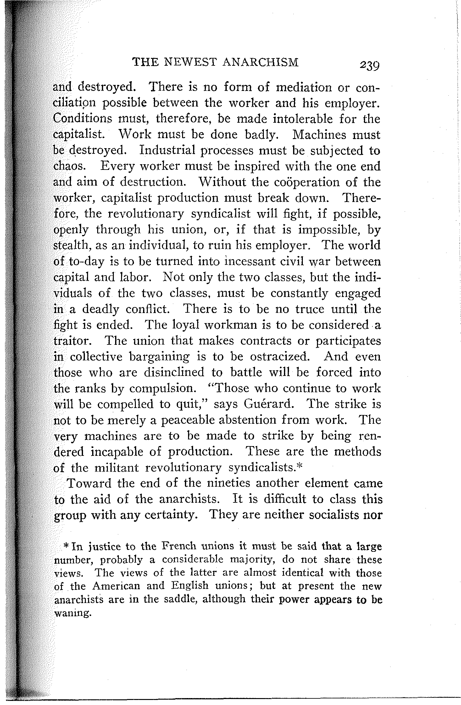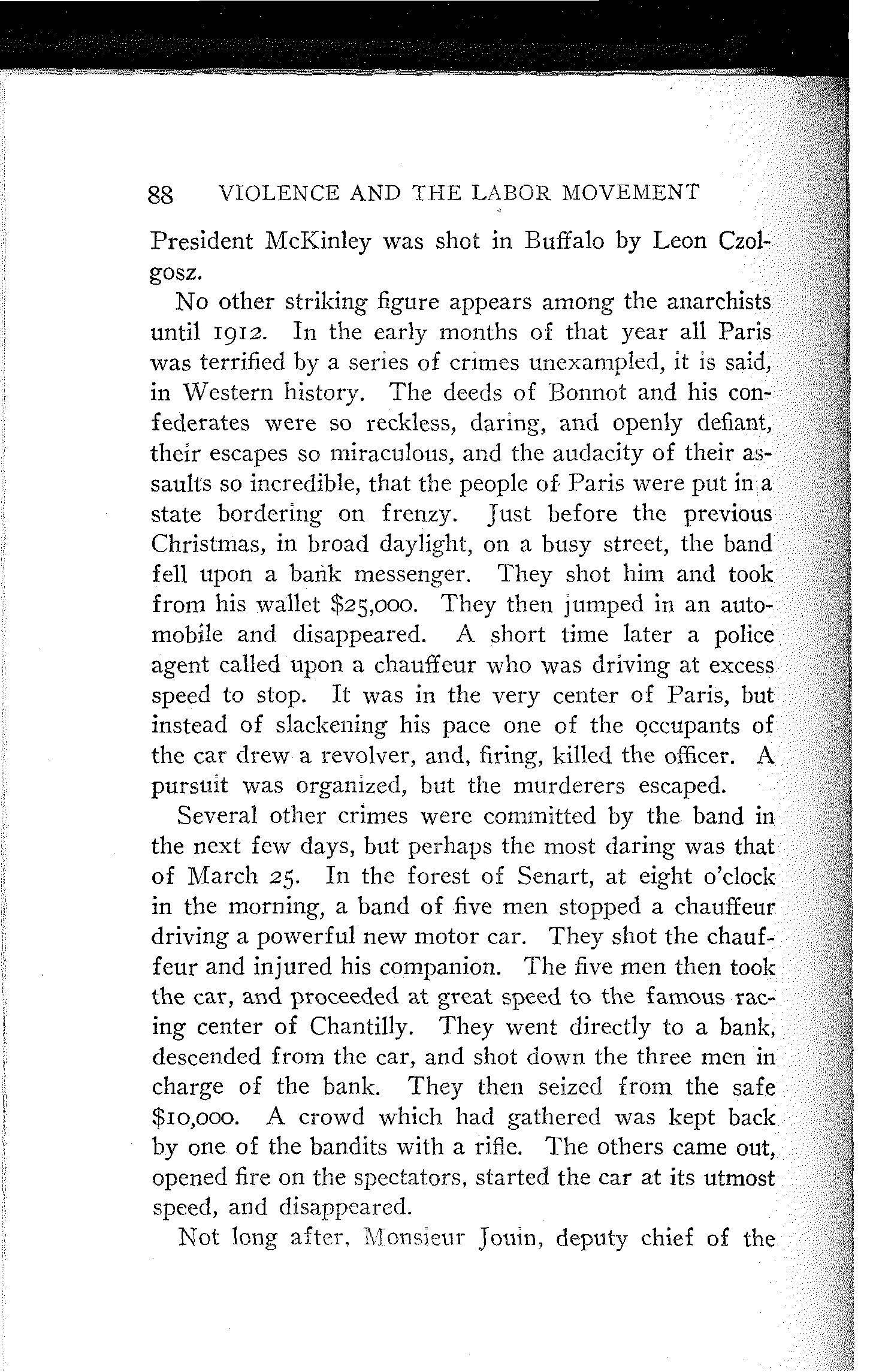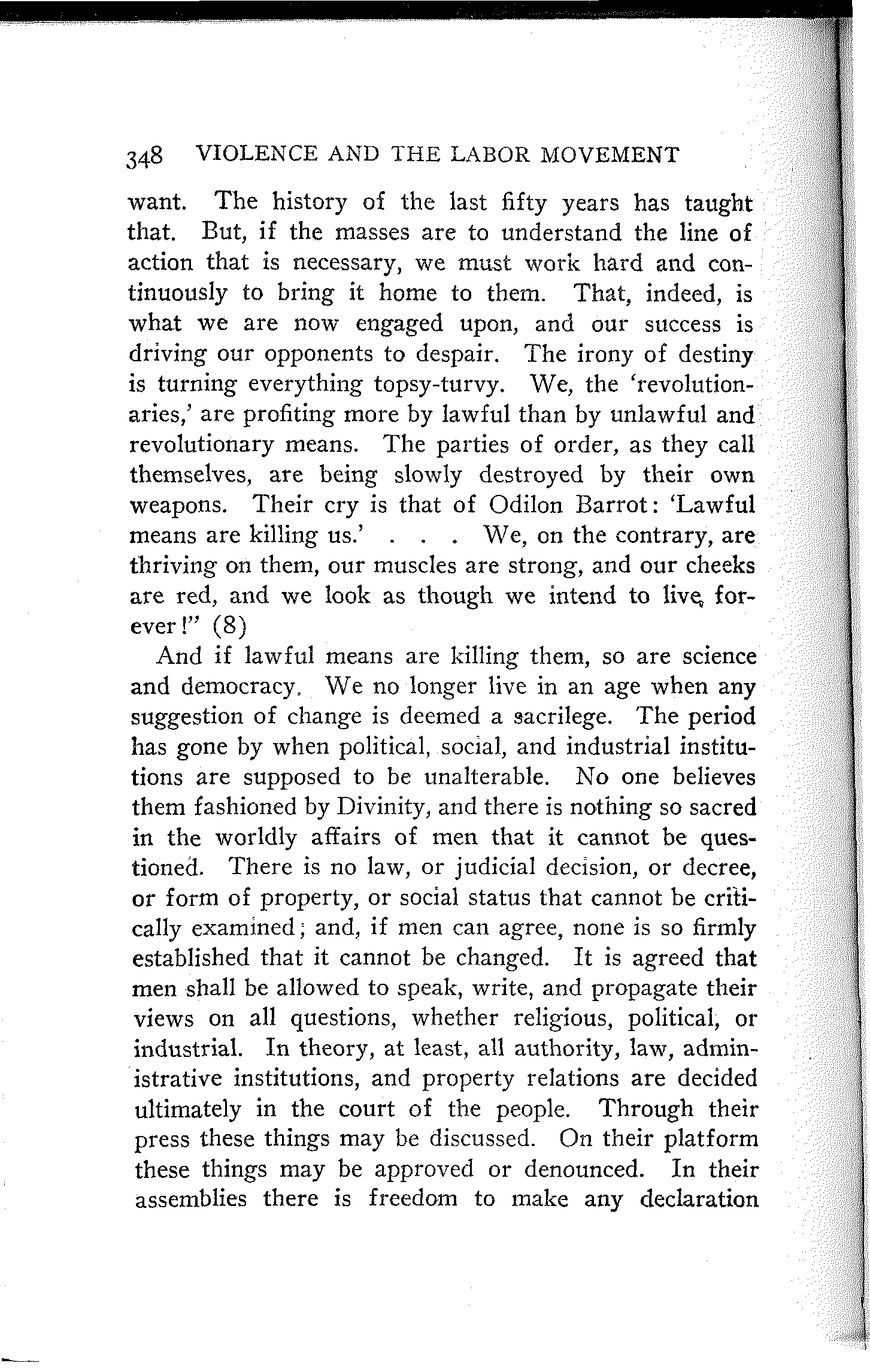 This volume is the result of some studies that I felt impelled to make when, about three years ago, certain sections of the labor movement in the United States were discussing vehemently political action versus direct action. A number of causes combined to produce a serious and critical controversy. The Industrial Workers of the World were carrying on a lively agitation that later culminated in a series of spectacular strikes. With ideas and methods that were not only in opposition to those of the trade unions, but also to those of the socialist party, the new organization sought to displace the older organizations by what it called the "one Big Union." There were many in the older organizations who firmly believed in industrial unionism, and the dissensions which arose were not so much over that question as over the antagonistic character of the new movement and its advocacy here of the violent methods employed by the revolutionary section of the French unions. The most forceful and active spokesman of these methods was Mr. William D. Haywood, and, largely as a result of his agitation, la grève générale and le sabotage became the subjects of the hour in labor and socialist circles. In 1911 Mr. Haywood and Mr. Frank Bohn published a booklet, entitled Industrial Socialism, in which they urged that the worker should "use any weapon which will win his fight."[A] They declared that, as "the present laws of[viii] property are made by and for the capitalists, the workers should not hesitate to break them."[B]
