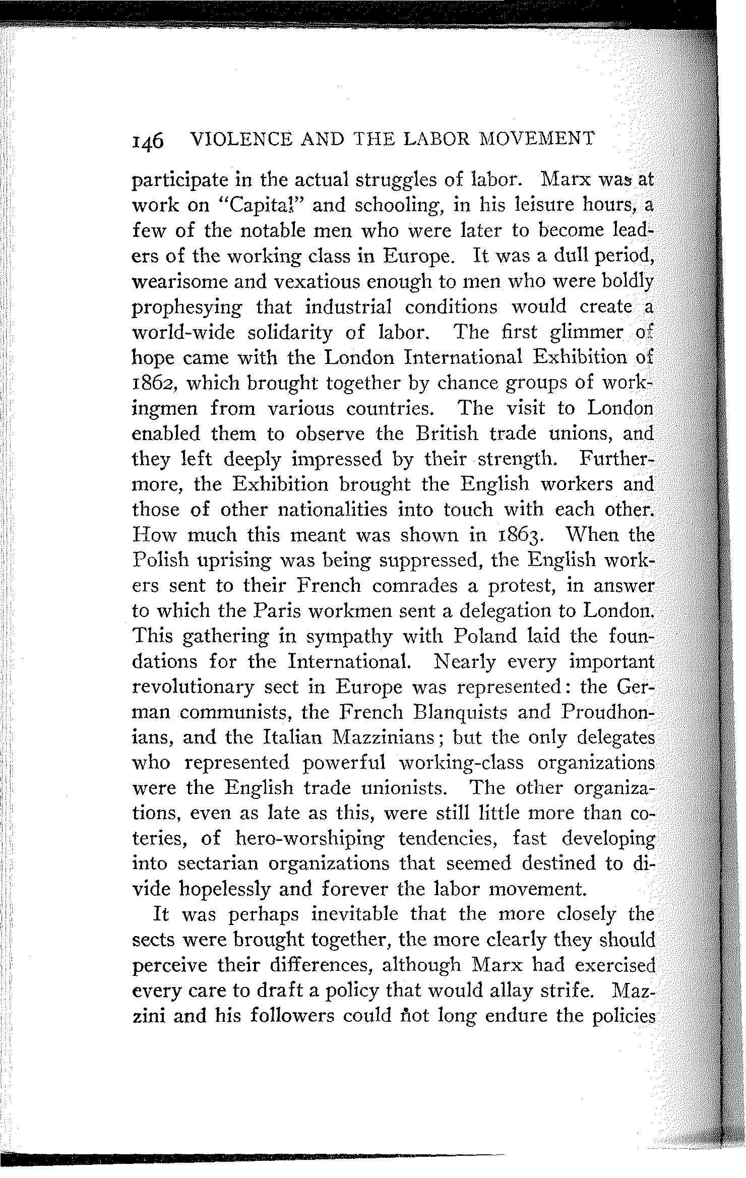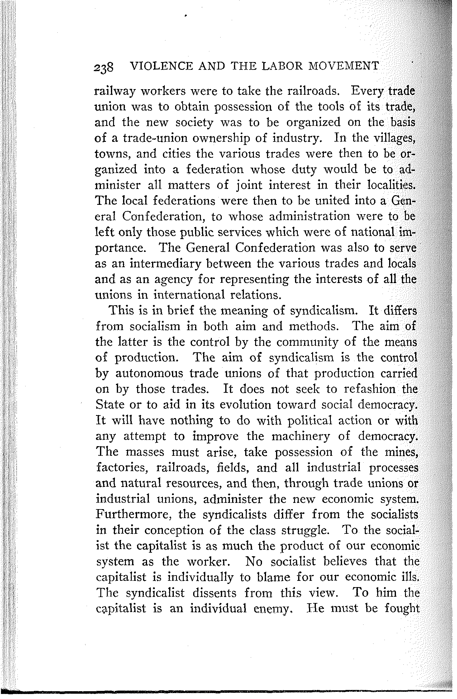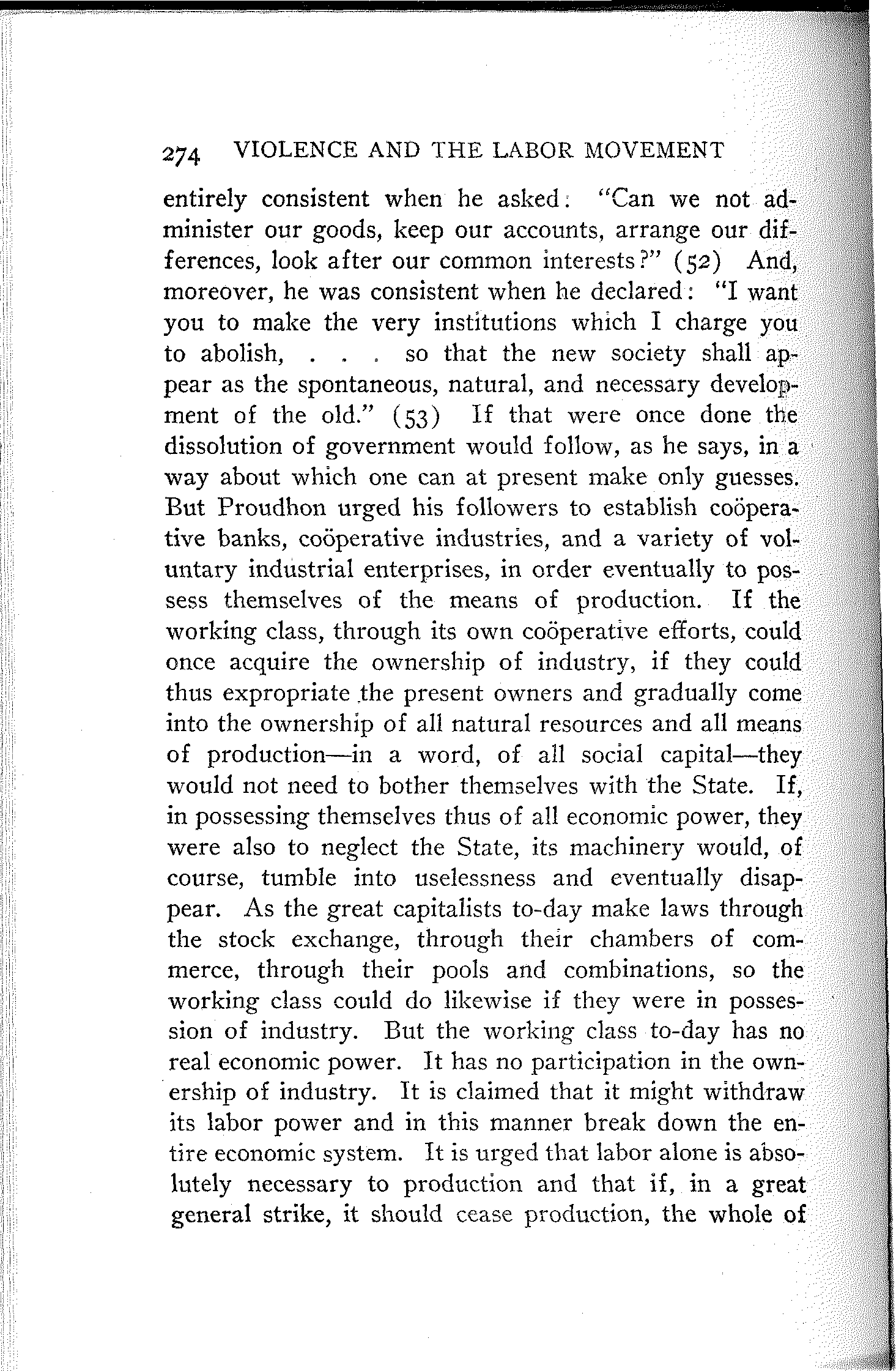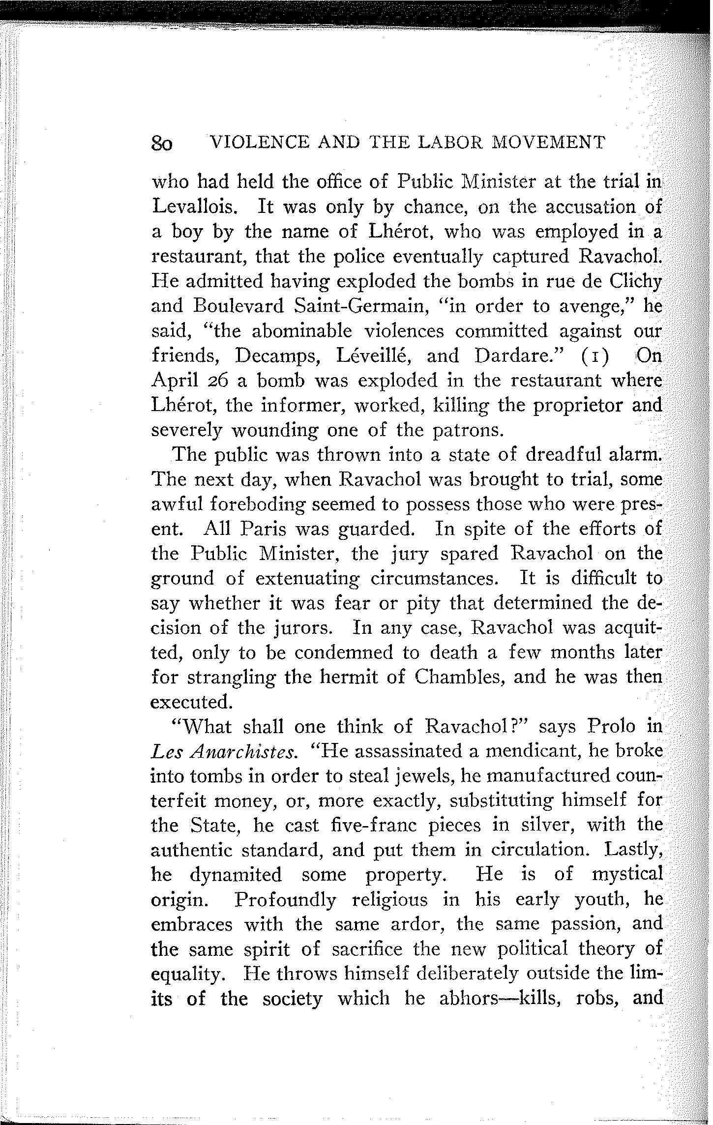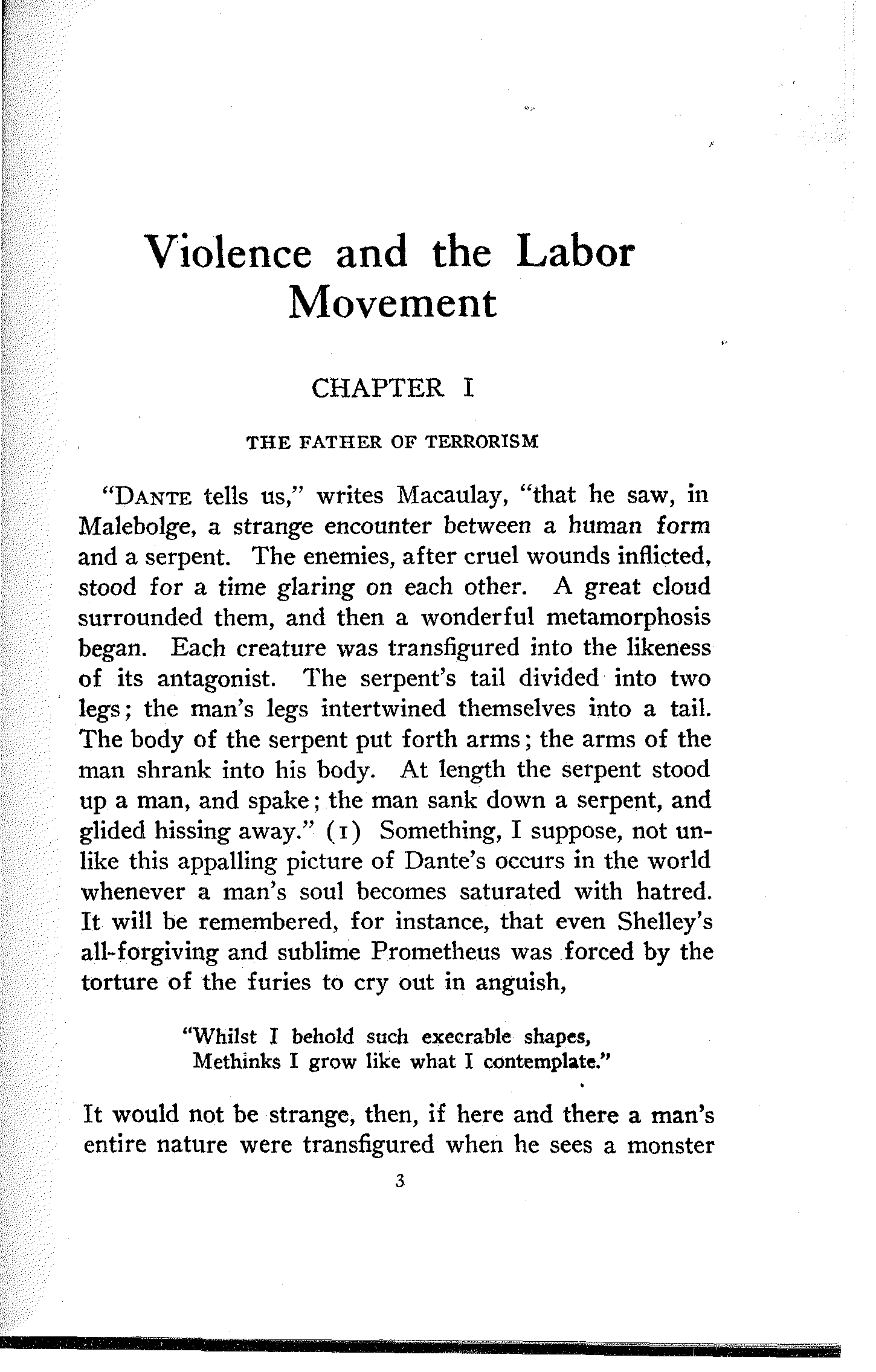 This volume is the result of some studies that I felt impelled to make when, about three years ago, certain sections of the labor movement in the United States were discussing vehemently political action versus direct action. A number of causes combined to produce a serious and critical controversy. The Industrial Workers of the World were carrying on a lively agitation that later culminated in a series of spectacular strikes. With ideas and methods that were not only in opposition to those of the trade unions, but also to those of the socialist party, the new organization sought to displace the older organizations by what it called the "one Big Union." There were many in the older organizations who firmly believed in industrial unionism, and the dissensions which arose were not so much over that question as over the antagonistic character of the new movement and its advocacy here of the violent methods employed by the revolutionary section of the French unions. The most forceful and active spokesman of these methods was Mr. William D. Haywood, and, largely as a result of his agitation, la grève générale and le sabotage became the subjects of the hour in labor and socialist circles. In 1911 Mr. Haywood and Mr. Frank Bohn published a booklet, entitled Industrial Socialism, in which they urged that the worker should "use any weapon which will win his fight."[A] They declared that, as "the present laws of[viii] property are made by and for the capitalists, the workers should not hesitate to break them."[B]
