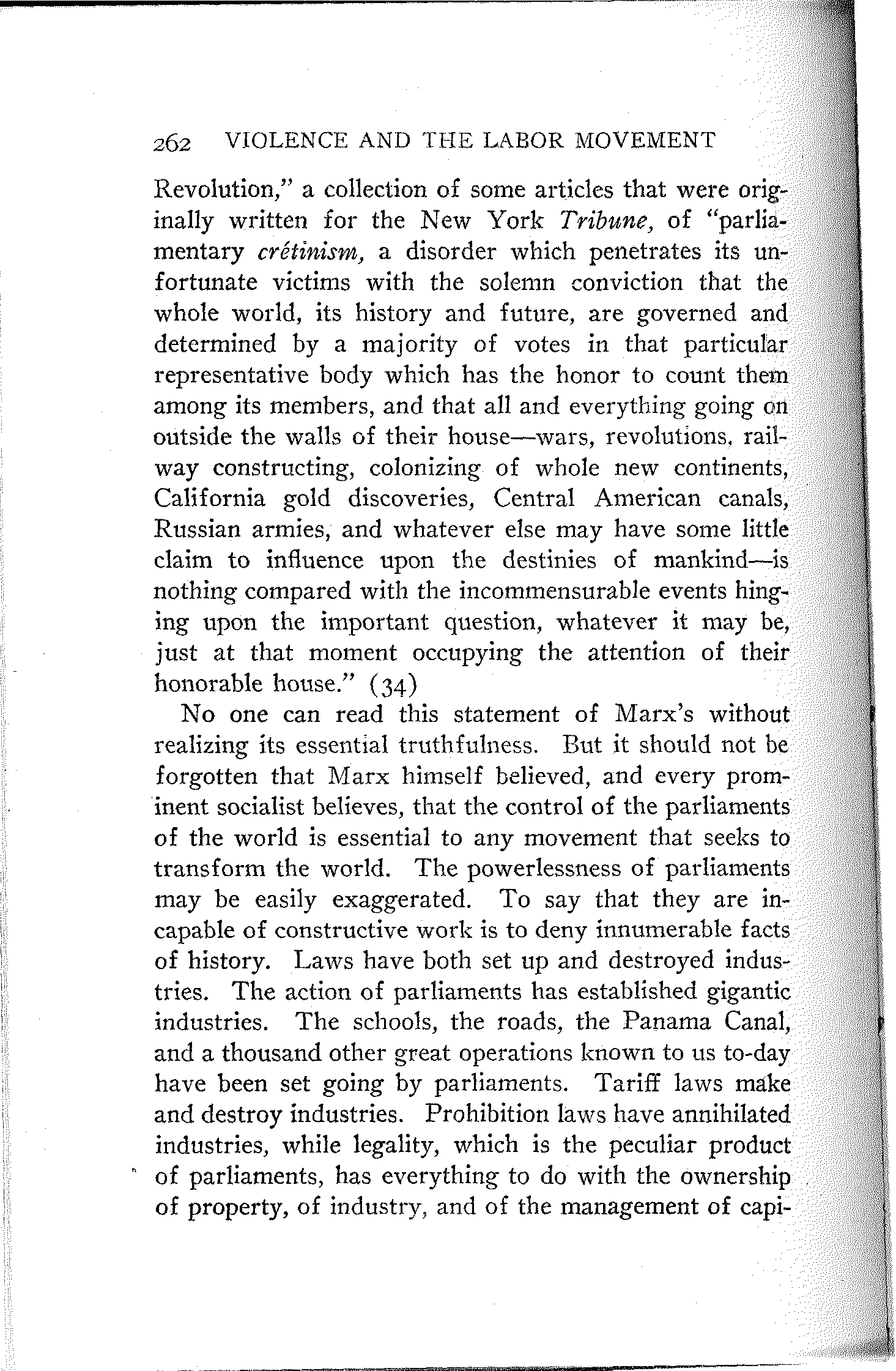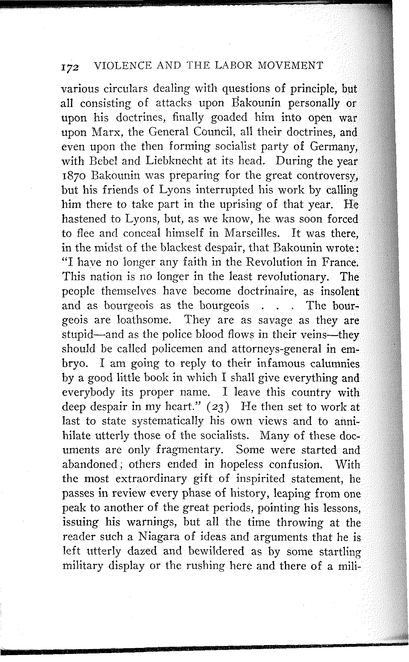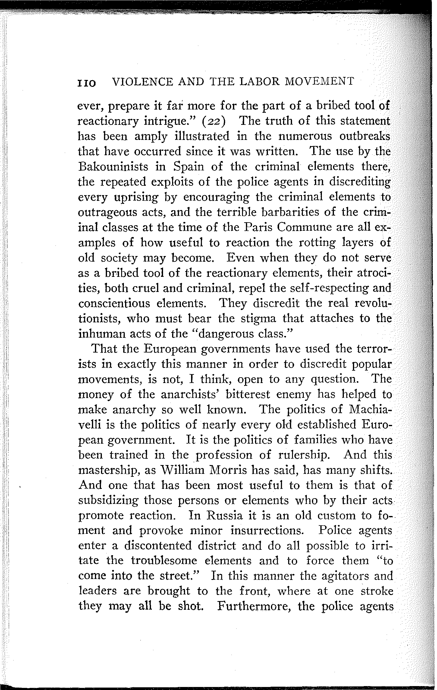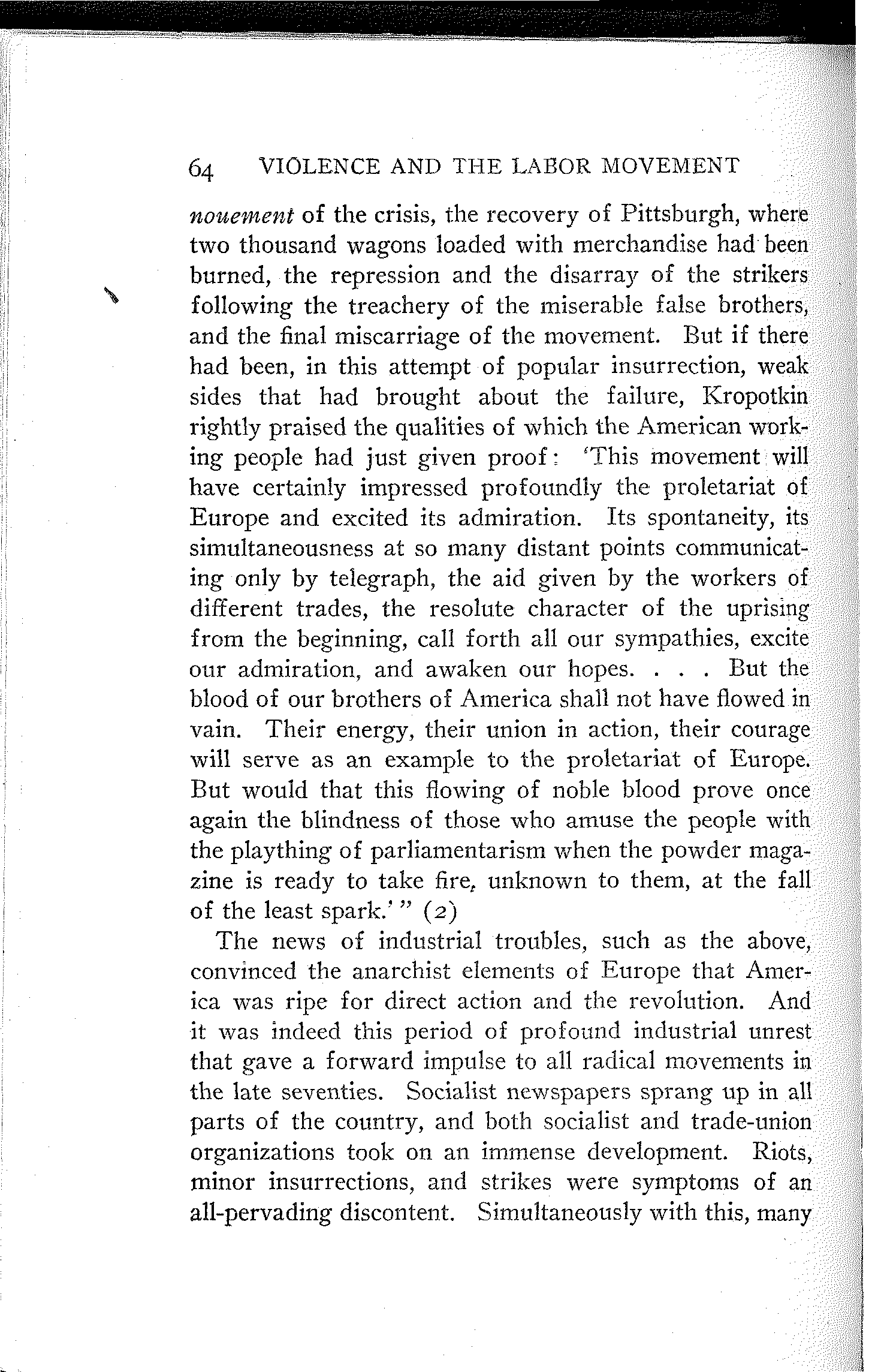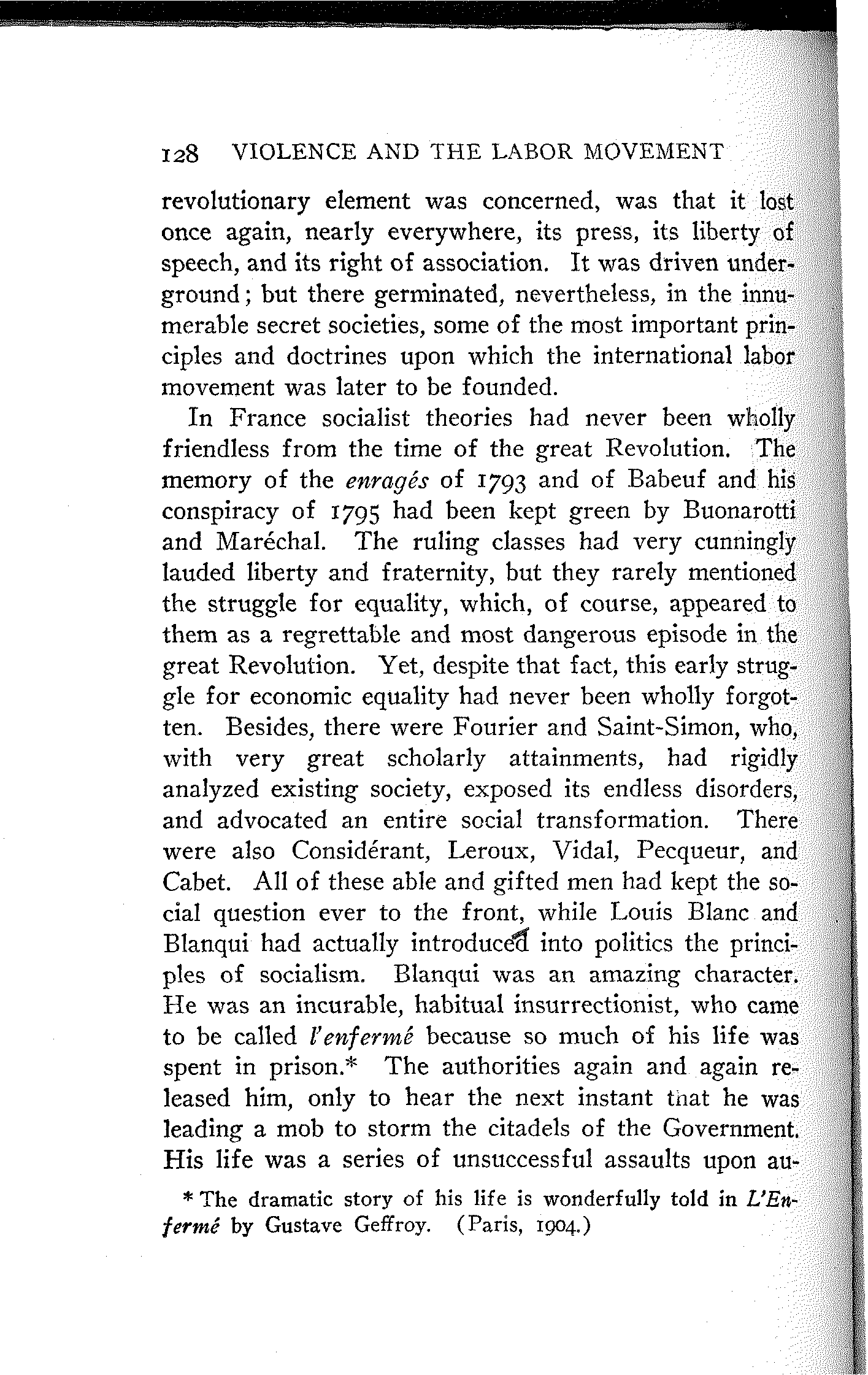 This volume is the result of some studies that I felt impelled to make when, about three years ago, certain sections of the labor movement in the United States were discussing vehemently political action versus direct action. A number of causes combined to produce a serious and critical controversy. The Industrial Workers of the World were carrying on a lively agitation that later culminated in a series of spectacular strikes. With ideas and methods that were not only in opposition to those of the trade unions, but also to those of the socialist party, the new organization sought to displace the older organizations by what it called the "one Big Union." There were many in the older organizations who firmly believed in industrial unionism, and the dissensions which arose were not so much over that question as over the antagonistic character of the new movement and its advocacy here of the violent methods employed by the revolutionary section of the French unions. The most forceful and active spokesman of these methods was Mr. William D. Haywood, and, largely as a result of his agitation, la grève générale and le sabotage became the subjects of the hour in labor and socialist circles. In 1911 Mr. Haywood and Mr. Frank Bohn published a booklet, entitled Industrial Socialism, in which they urged that the worker should "use any weapon which will win his fight."[A] They declared that, as "the present laws of[viii] property are made by and for the capitalists, the workers should not hesitate to break them."[B]