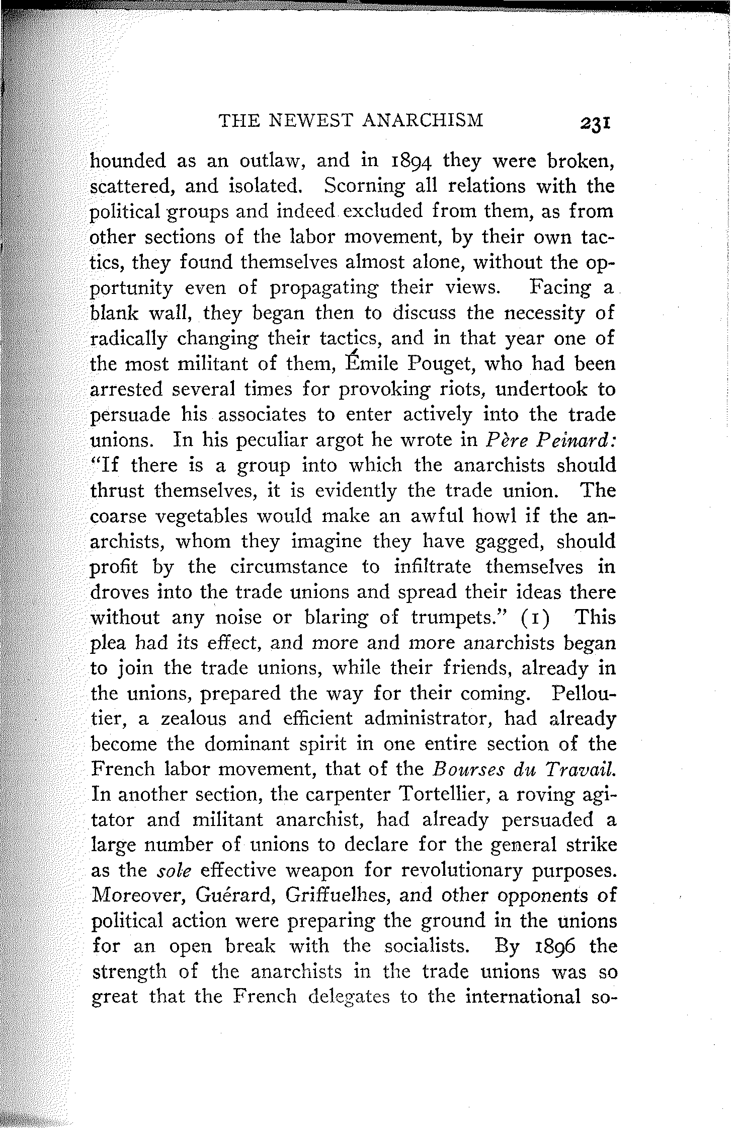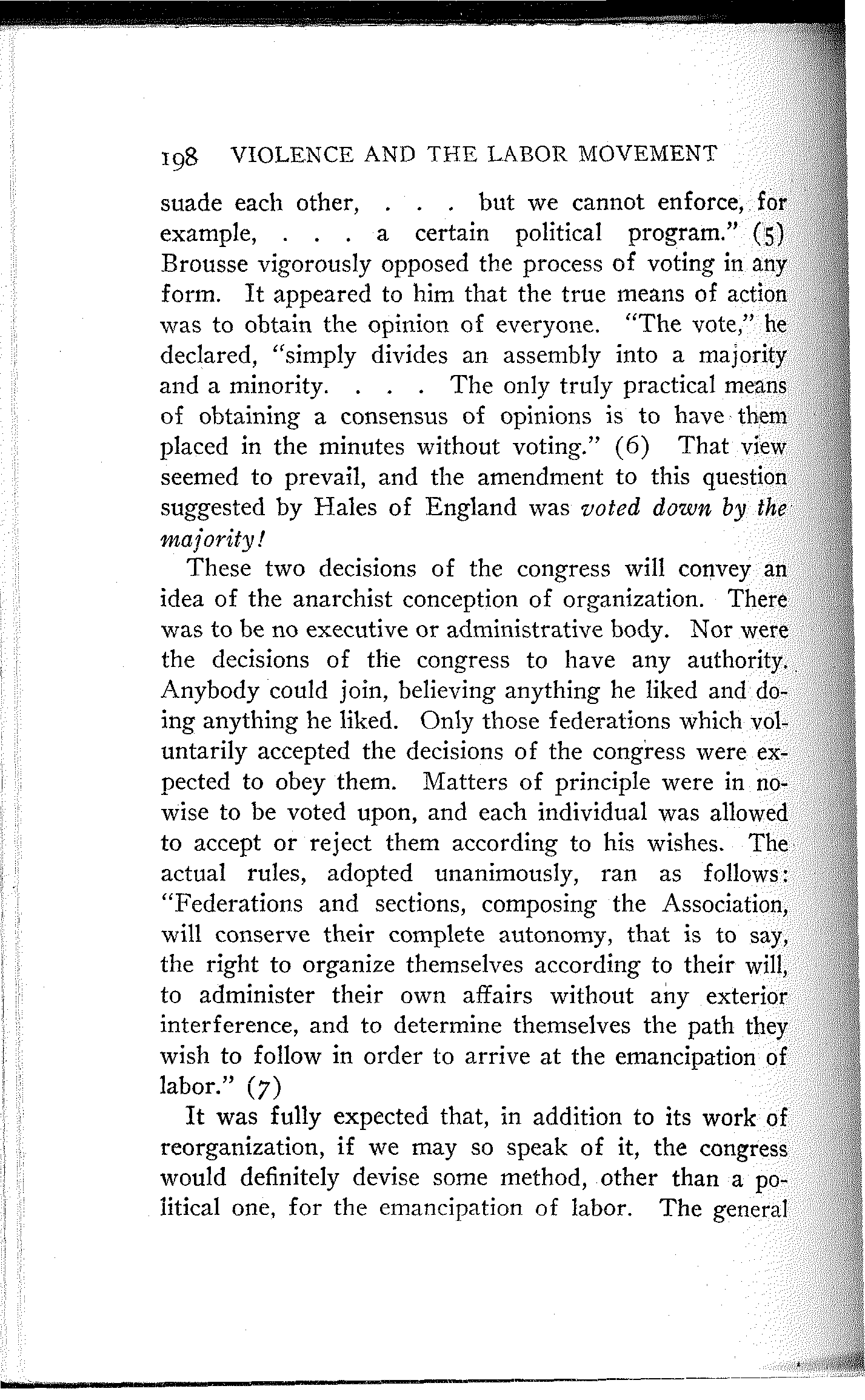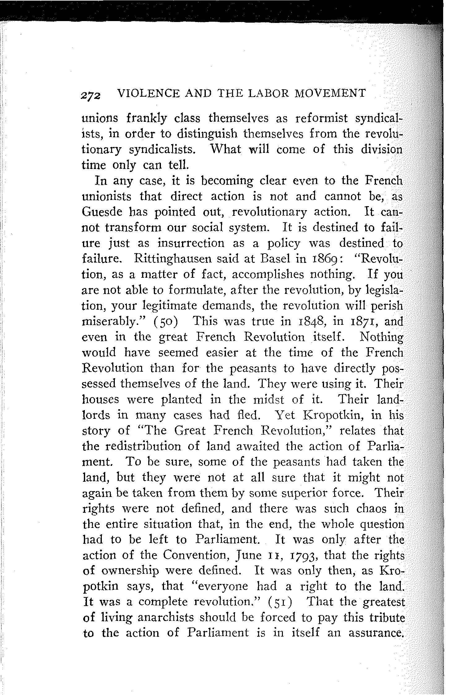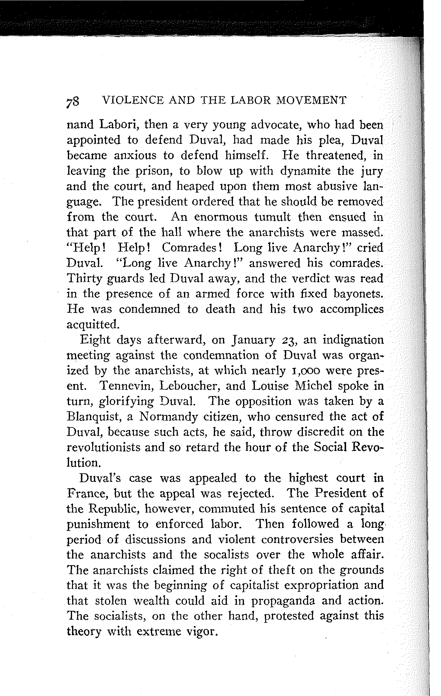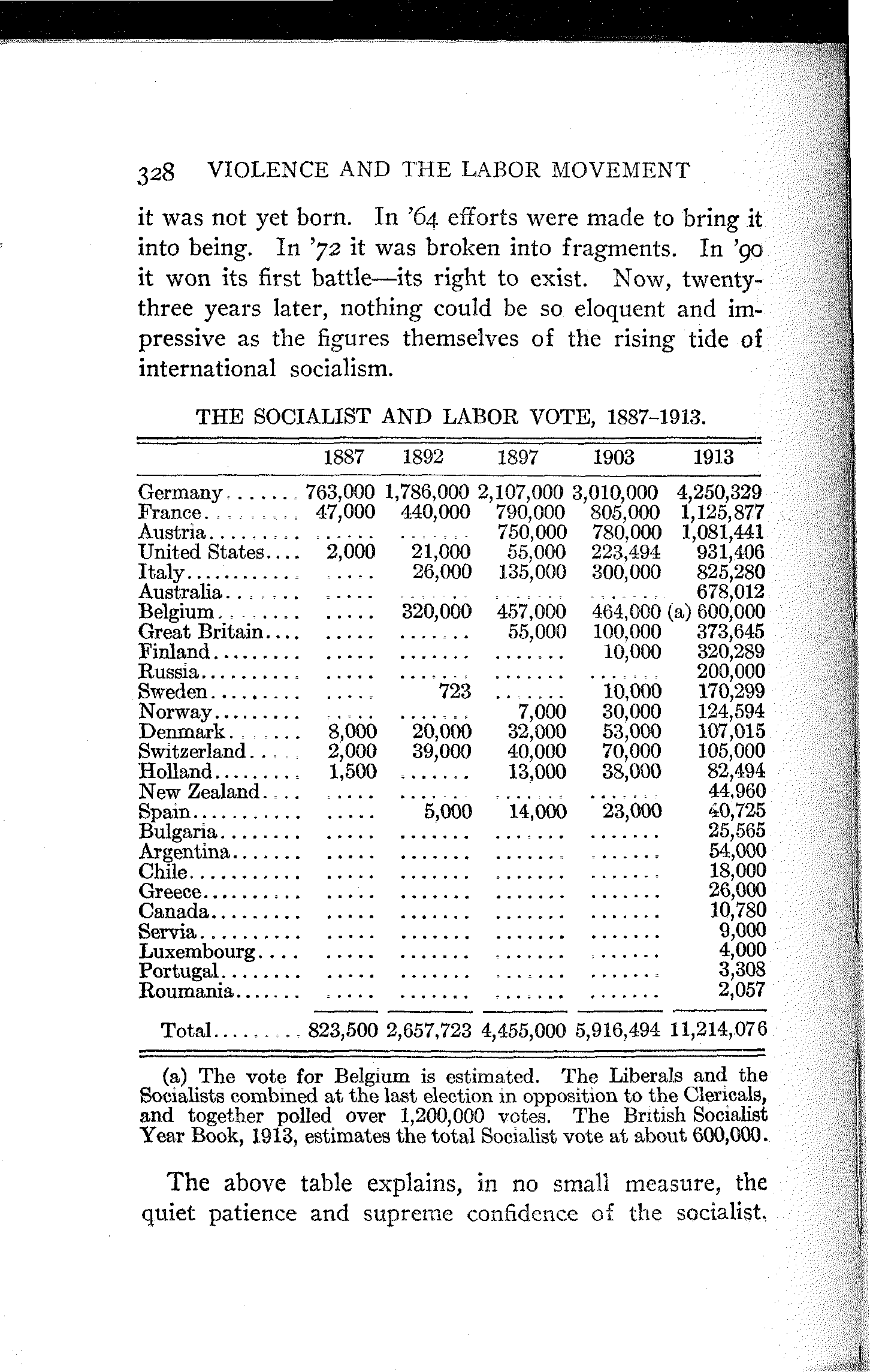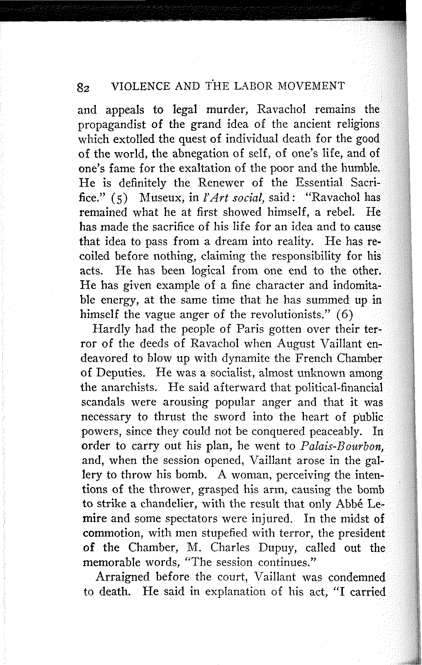 This volume is the result of some studies that I felt impelled to make when, about three years ago, certain sections of the labor movement in the United States were discussing vehemently political action versus direct action. A number of causes combined to produce a serious and critical controversy. The Industrial Workers of the World were carrying on a lively agitation that later culminated in a series of spectacular strikes. With ideas and methods that were not only in opposition to those of the trade unions, but also to those of the socialist party, the new organization sought to displace the older organizations by what it called the "one Big Union." There were many in the older organizations who firmly believed in industrial unionism, and the dissensions which arose were not so much over that question as over the antagonistic character of the new movement and its advocacy here of the violent methods employed by the revolutionary section of the French unions. The most forceful and active spokesman of these methods was Mr. William D. Haywood, and, largely as a result of his agitation, la grève générale and le sabotage became the subjects of the hour in labor and socialist circles. In 1911 Mr. Haywood and Mr. Frank Bohn published a booklet, entitled Industrial Socialism, in which they urged that the worker should "use any weapon which will win his fight."[A] They declared that, as "the present laws of[viii] property are made by and for the capitalists, the workers should not hesitate to break them."[B]