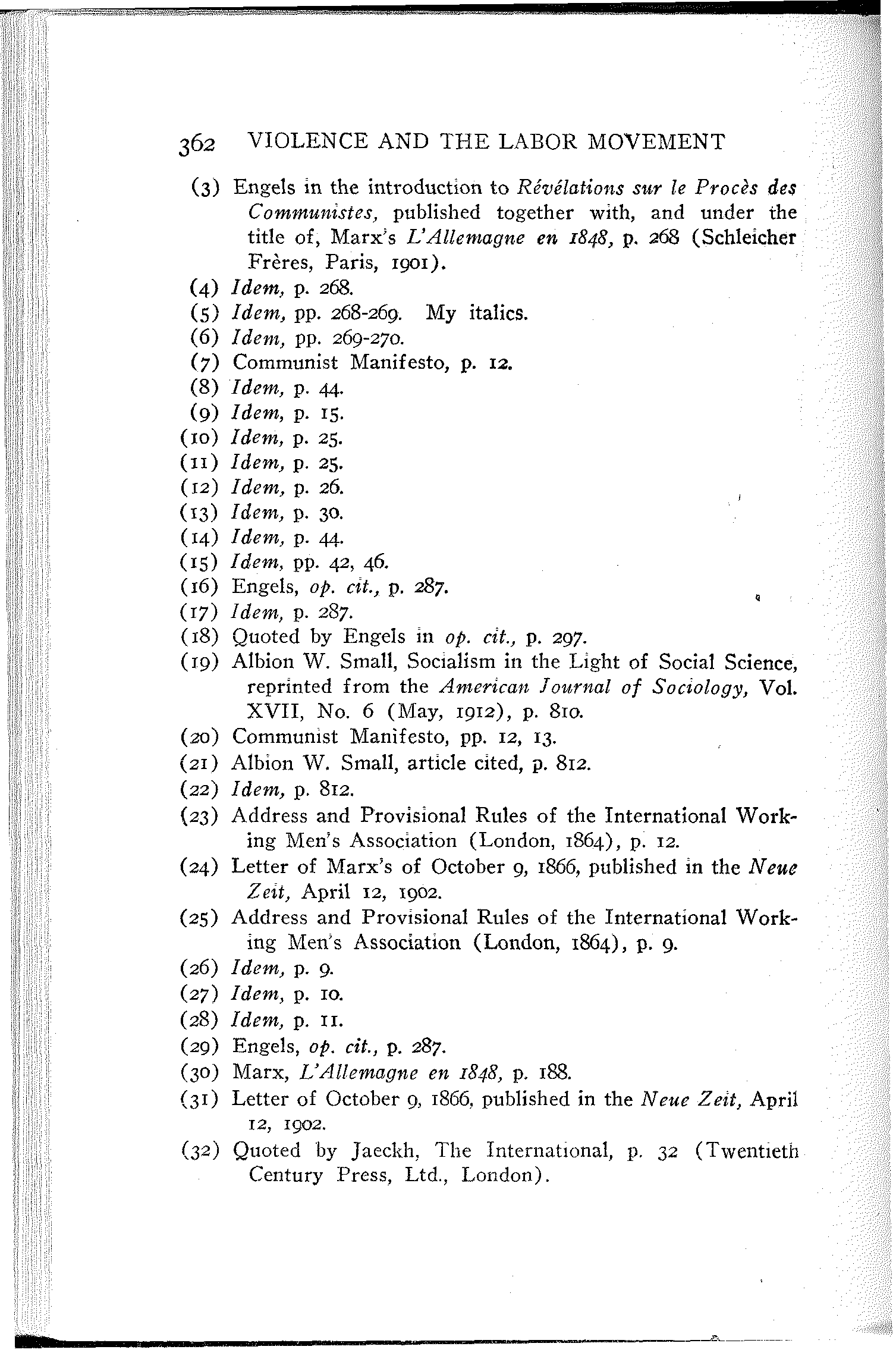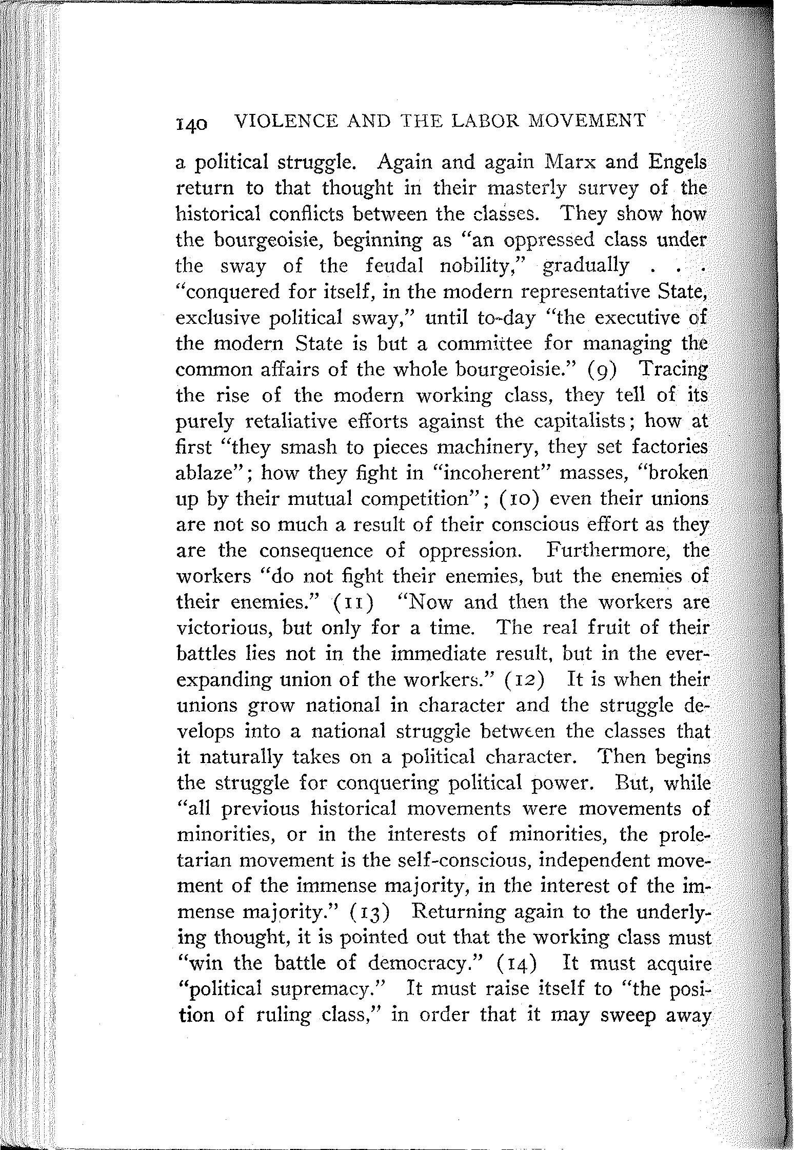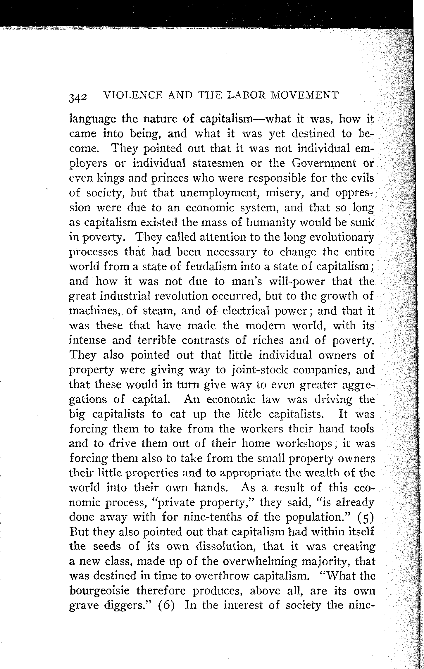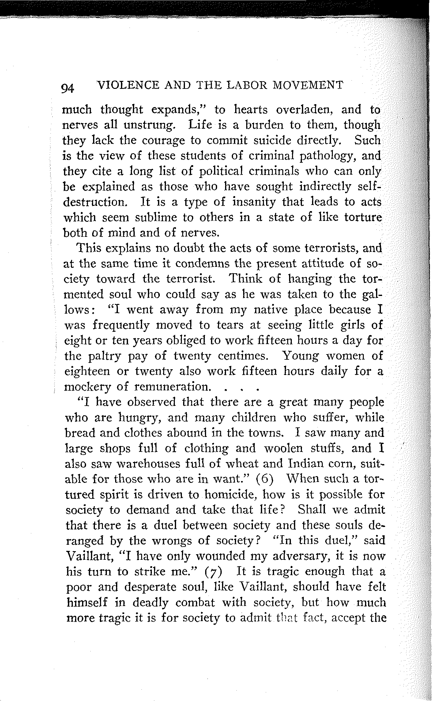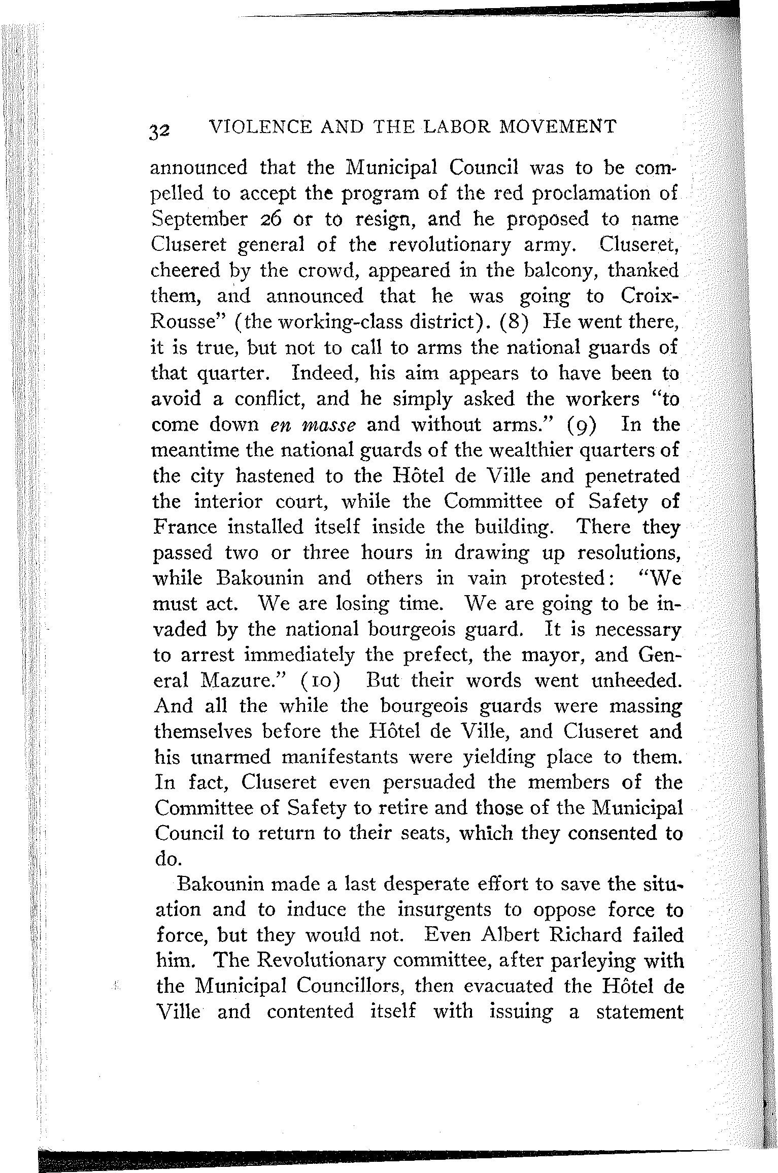 This volume is the result of some studies that I felt impelled to make when, about three years ago, certain sections of the labor movement in the United States were discussing vehemently political action versus direct action. A number of causes combined to produce a serious and critical controversy. The Industrial Workers of the World were carrying on a lively agitation that later culminated in a series of spectacular strikes. With ideas and methods that were not only in opposition to those of the trade unions, but also to those of the socialist party, the new organization sought to displace the older organizations by what it called the "one Big Union." There were many in the older organizations who firmly believed in industrial unionism, and the dissensions which arose were not so much over that question as over the antagonistic character of the new movement and its advocacy here of the violent methods employed by the revolutionary section of the French unions. The most forceful and active spokesman of these methods was Mr. William D. Haywood, and, largely as a result of his agitation, la grève générale and le sabotage became the subjects of the hour in labor and socialist circles. In 1911 Mr. Haywood and Mr. Frank Bohn published a booklet, entitled Industrial Socialism, in which they urged that the worker should "use any weapon which will win his fight."[A] They declared that, as "the present laws of[viii] property are made by and for the capitalists, the workers should not hesitate to break them."[B]